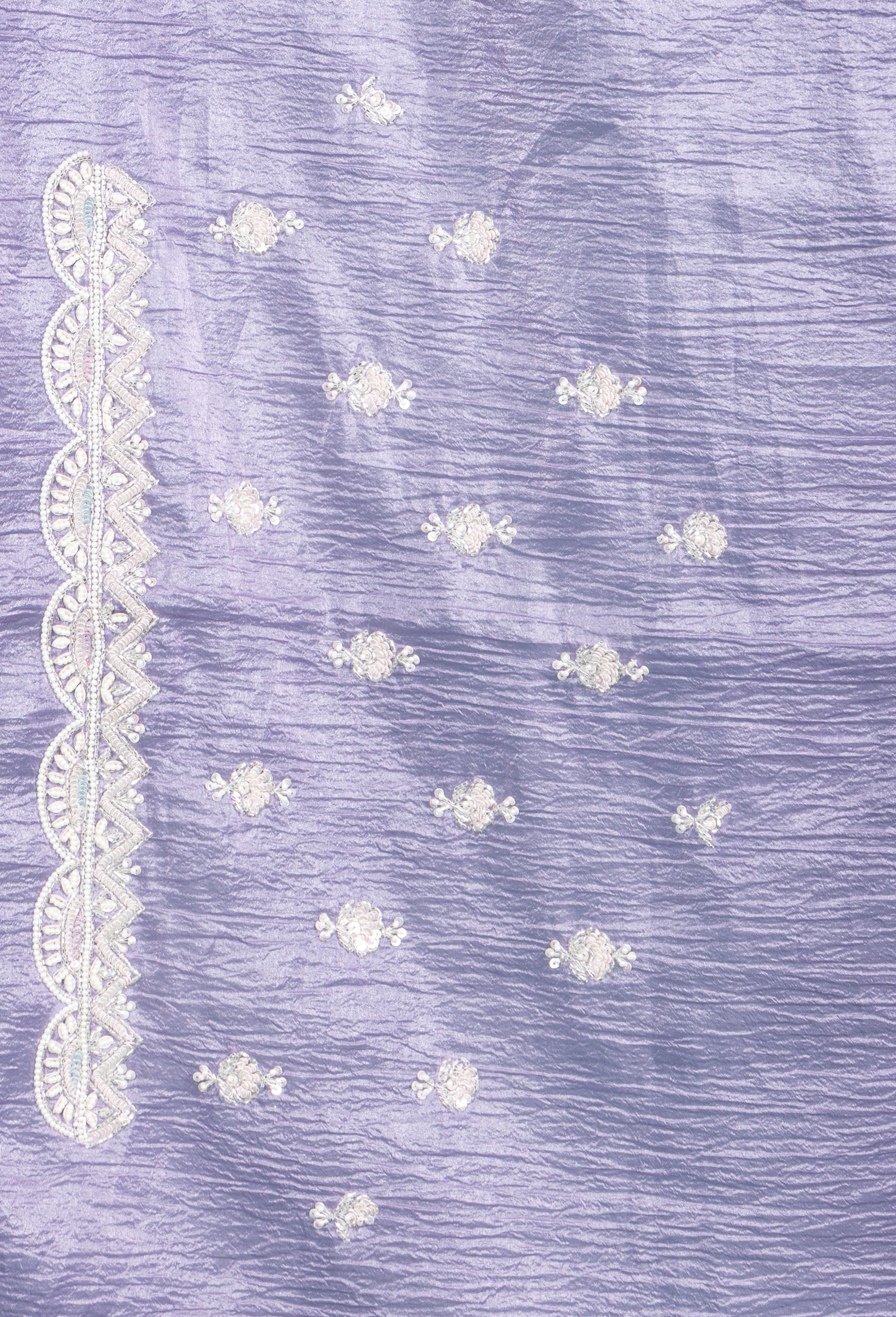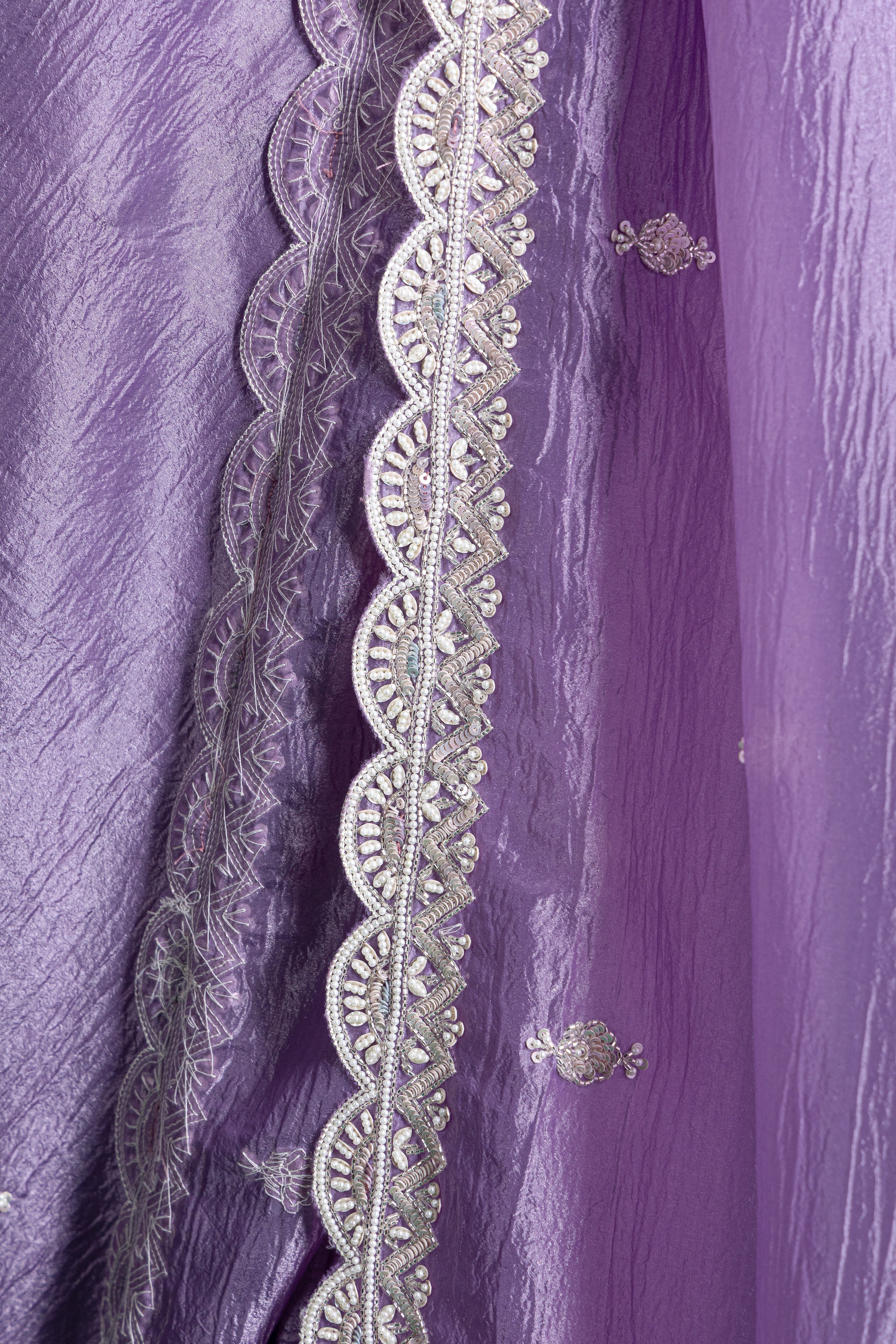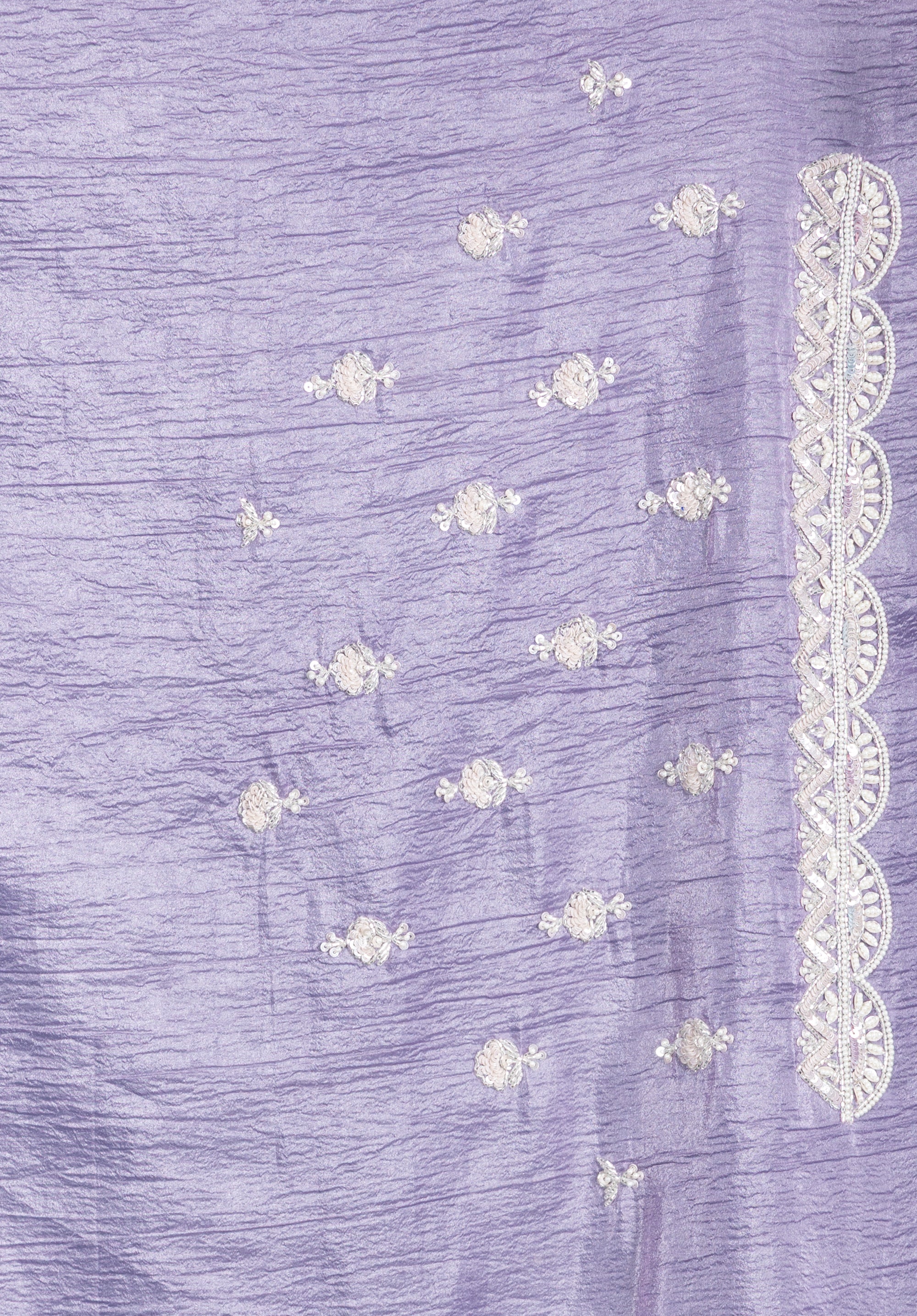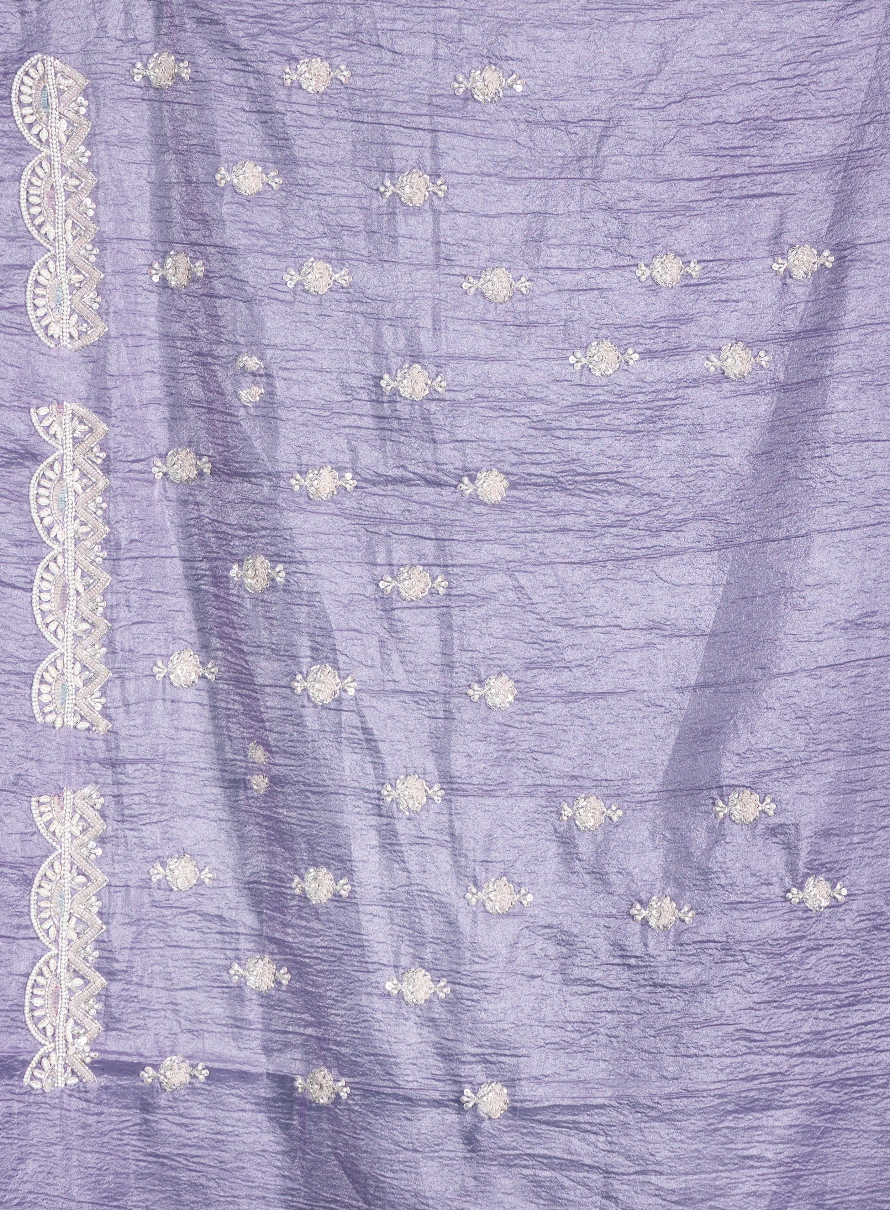 A luxurious lavender silk saree featuring fine silver thread embroidery, perfect for graceful celebrations and elegant evening soirées. Lightweight drape enhances timeless beauty and sophistication effortlessly.