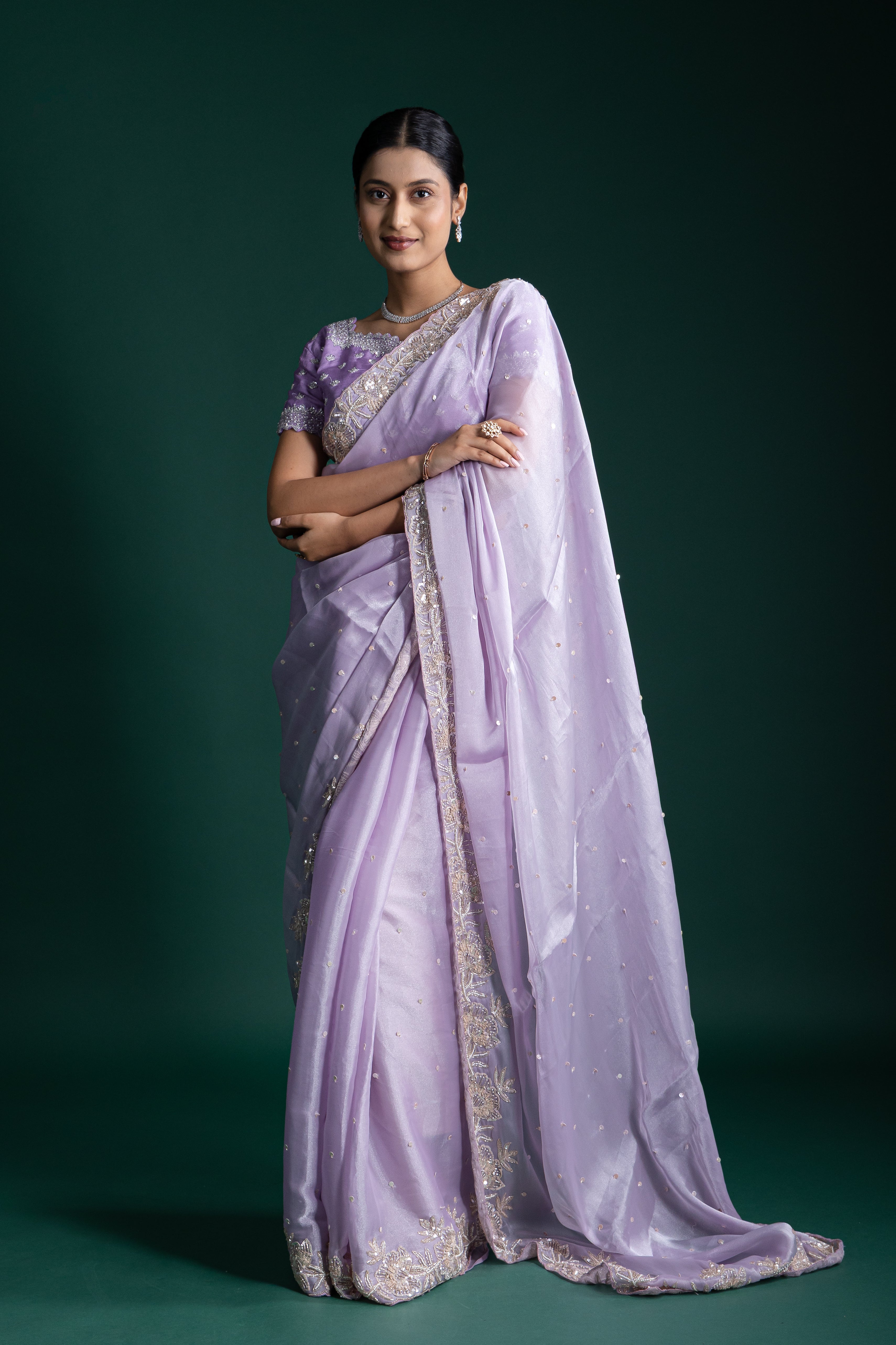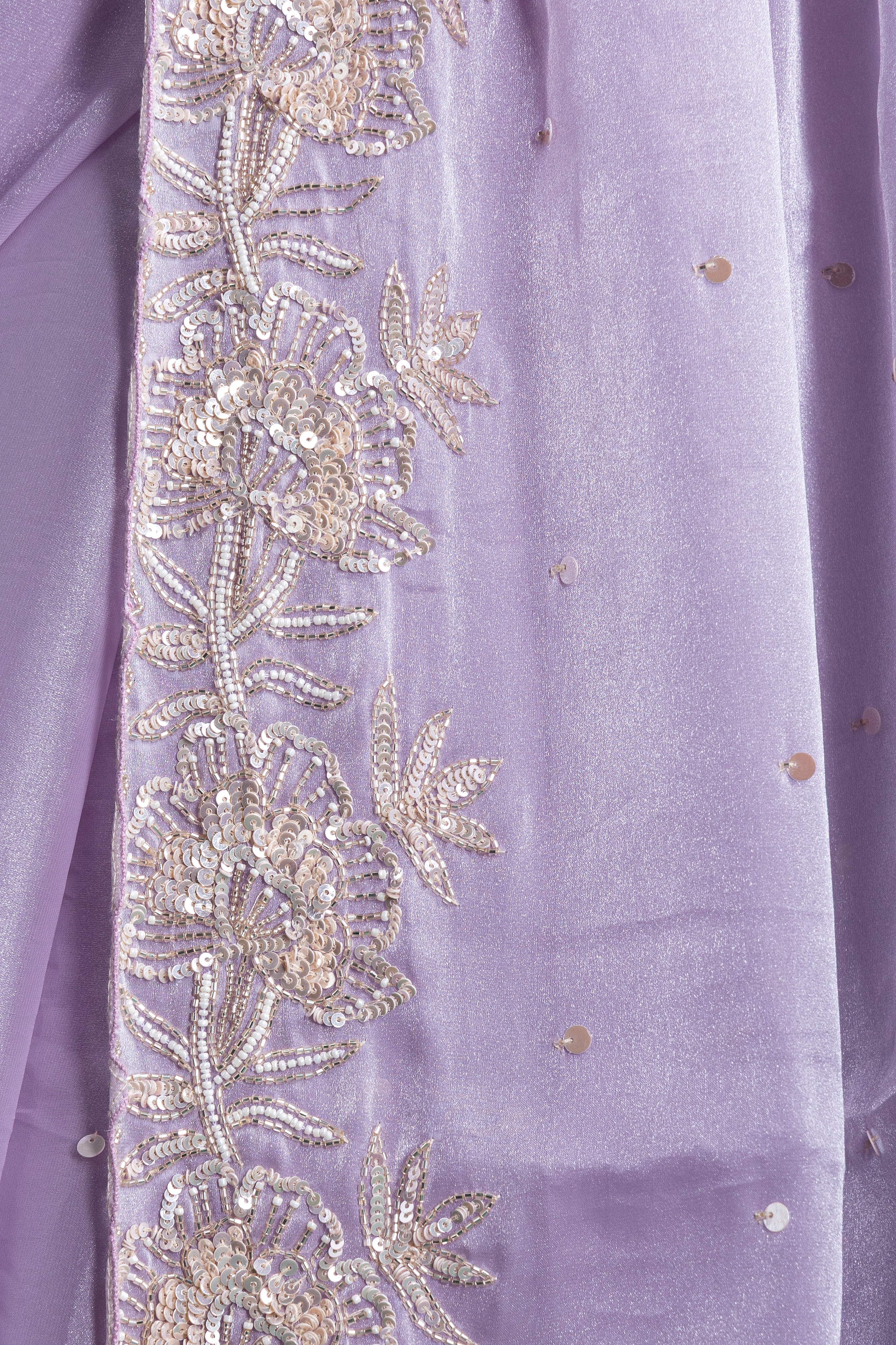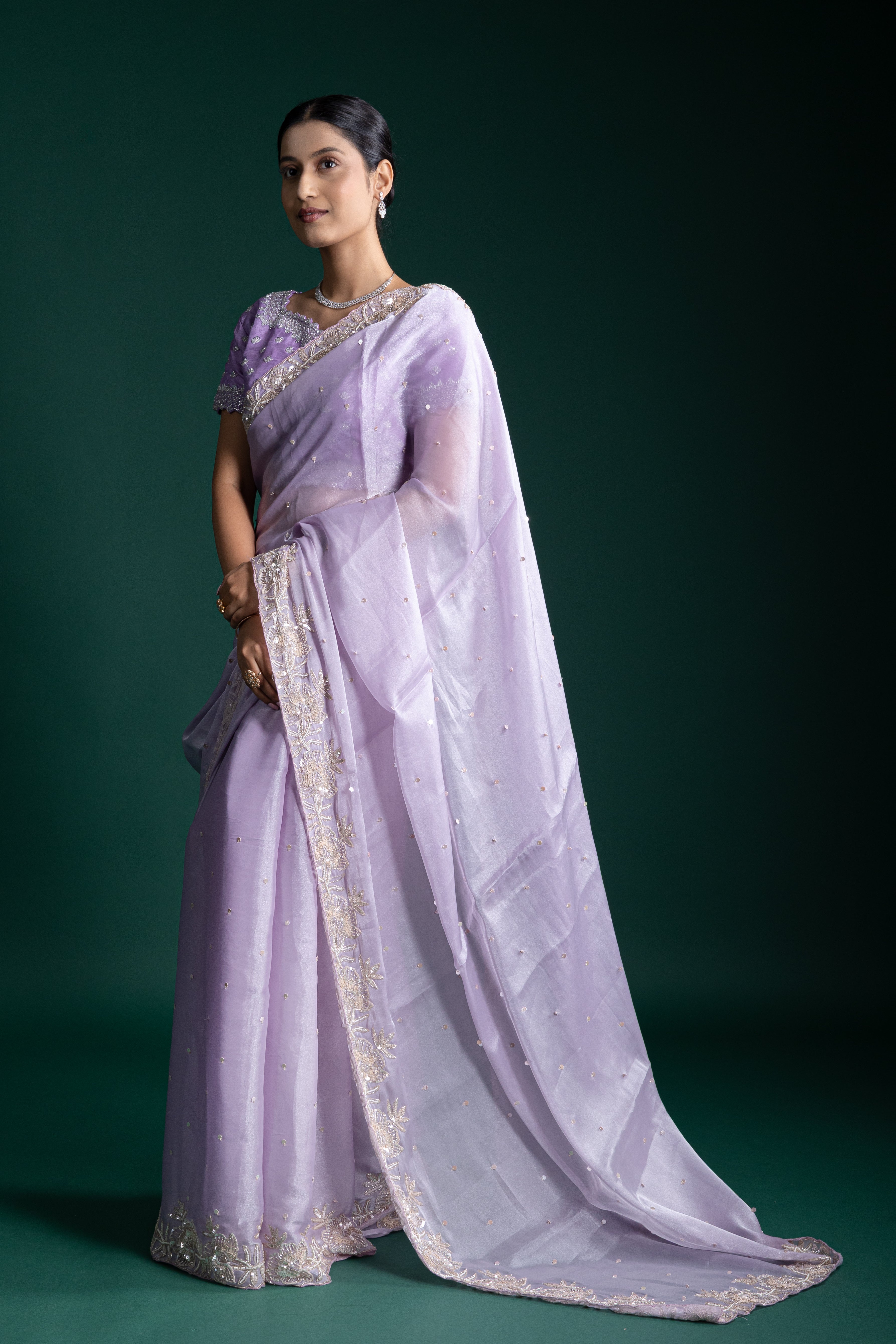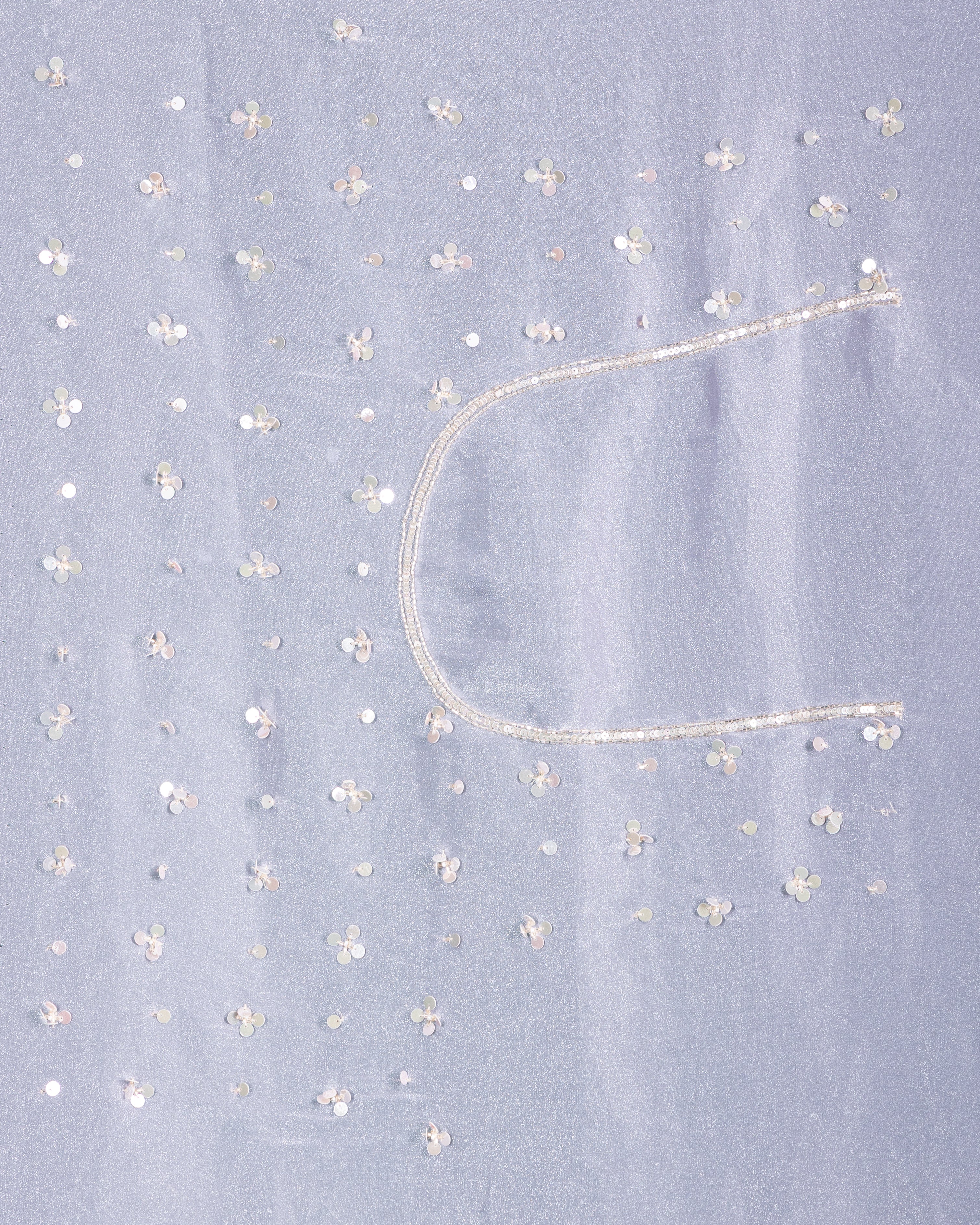 This misty lavender net saree is adorned with intricate thread and sequin embroidery, exuding grace and modern sophistication. Ideal for upscale events, it blends tradition with contemporary finesse.