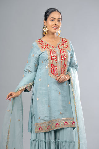 Antique Gold Drape Saree with Hand Embroidered Blouse