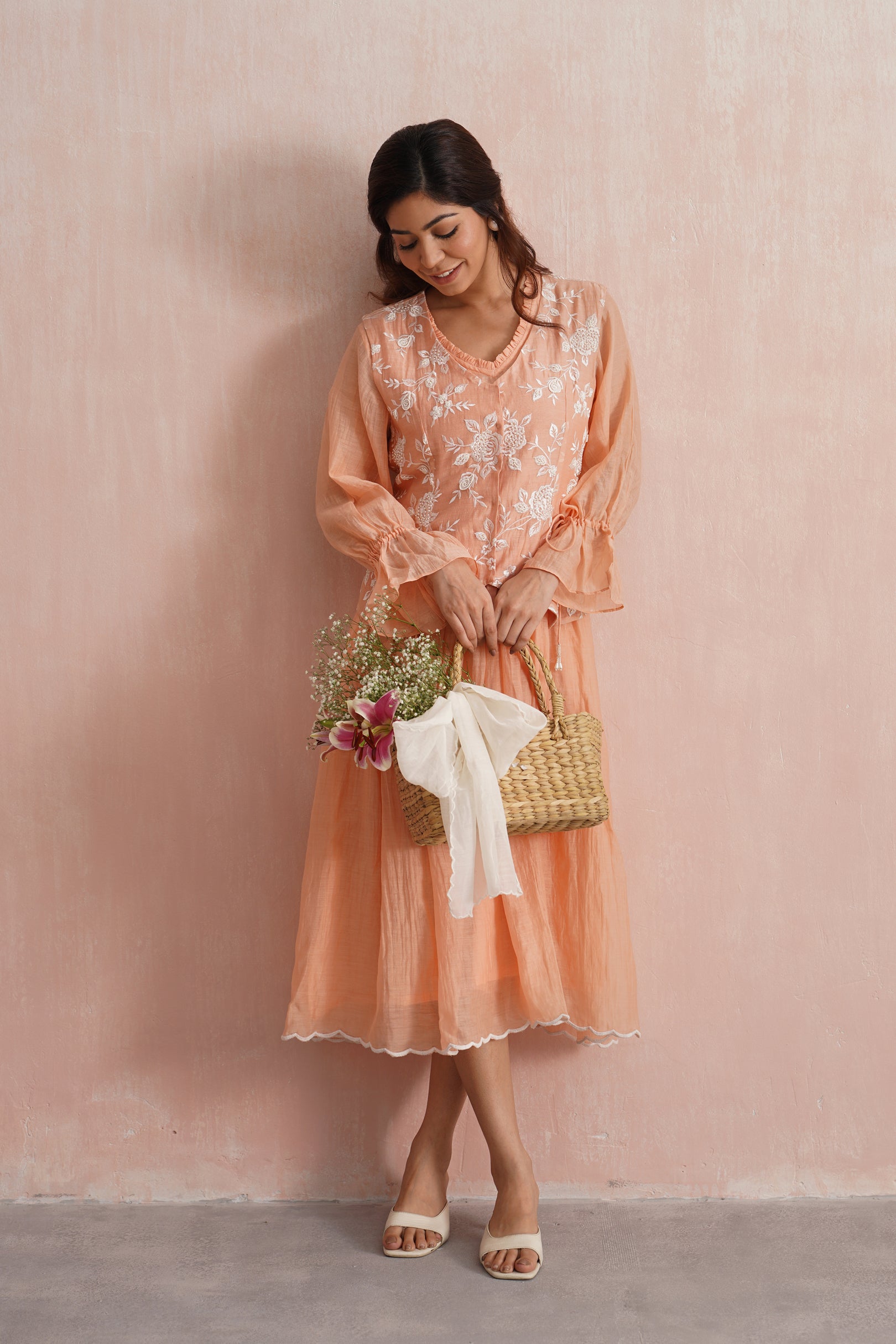 A graceful peach midi dress crafted in a soft, breathable fabric, featuring gentle gathers, a relaxed silhouette, and fluid movement, designed for understated luxury and timeless everyday elegance