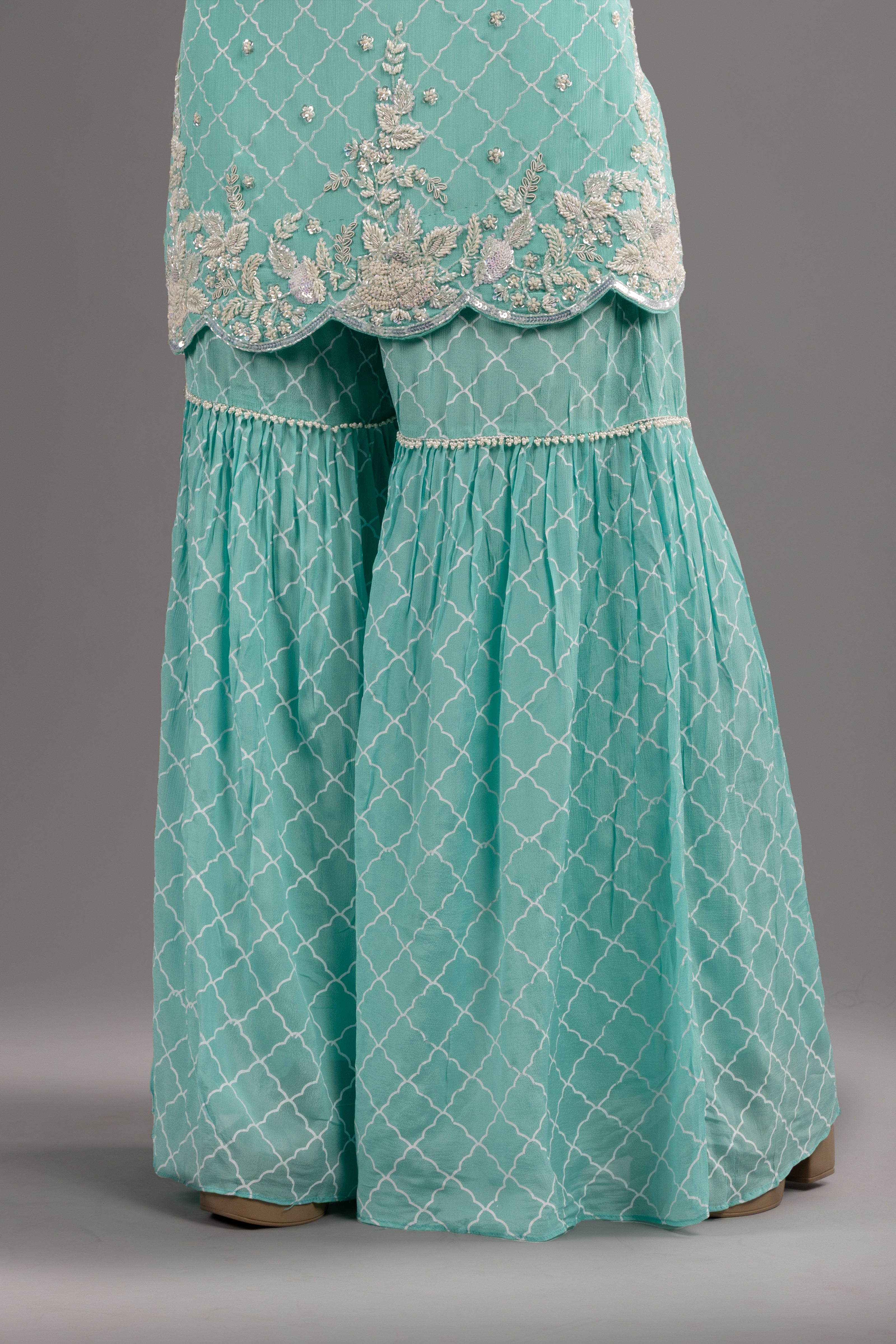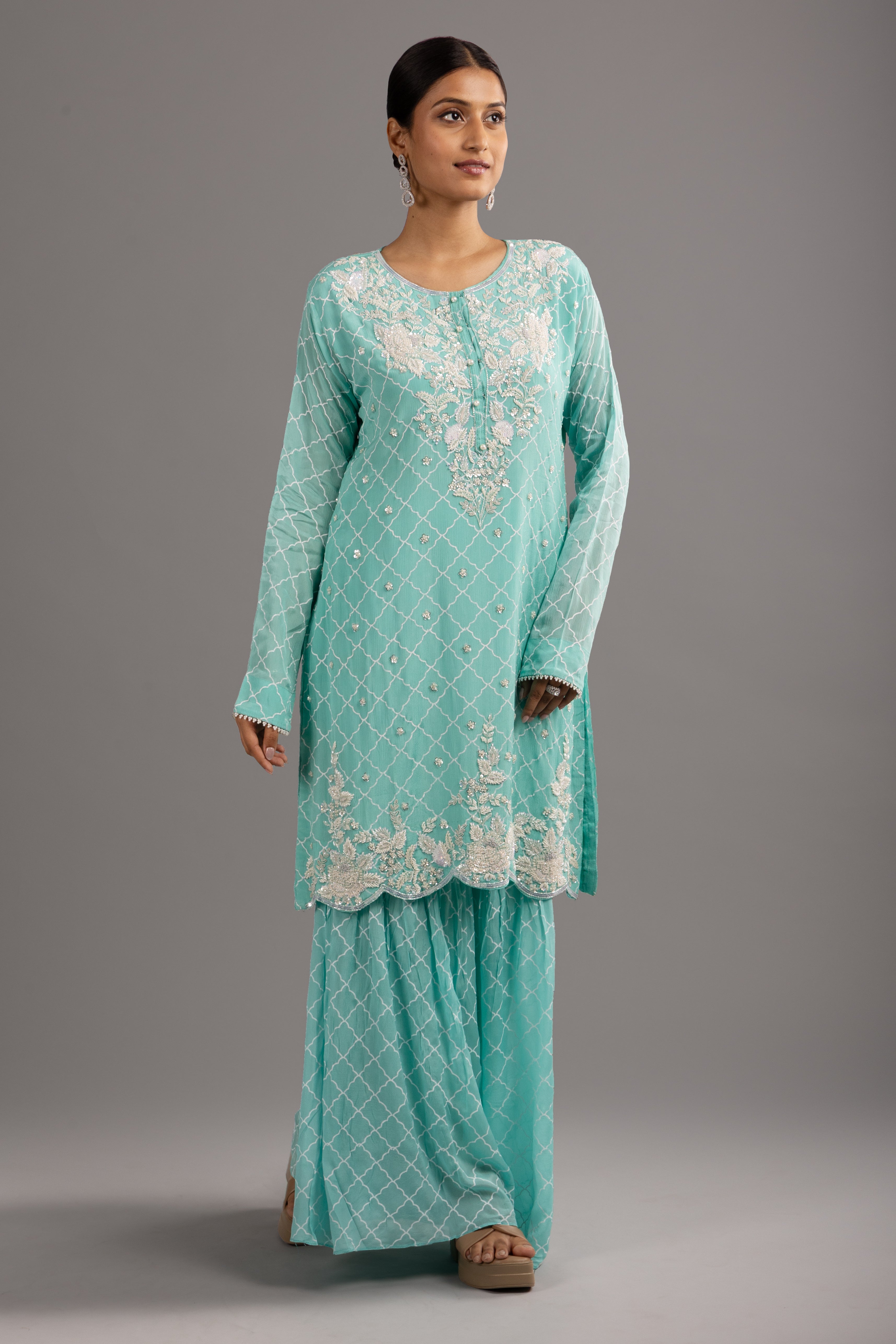 This aqua blue georgette sharara set features delicate white thread embroidery with scalloped edges, a classic silhouette, and graceful flare ideal for elegant festive and intimate occasions.