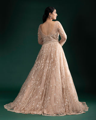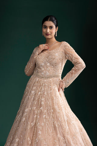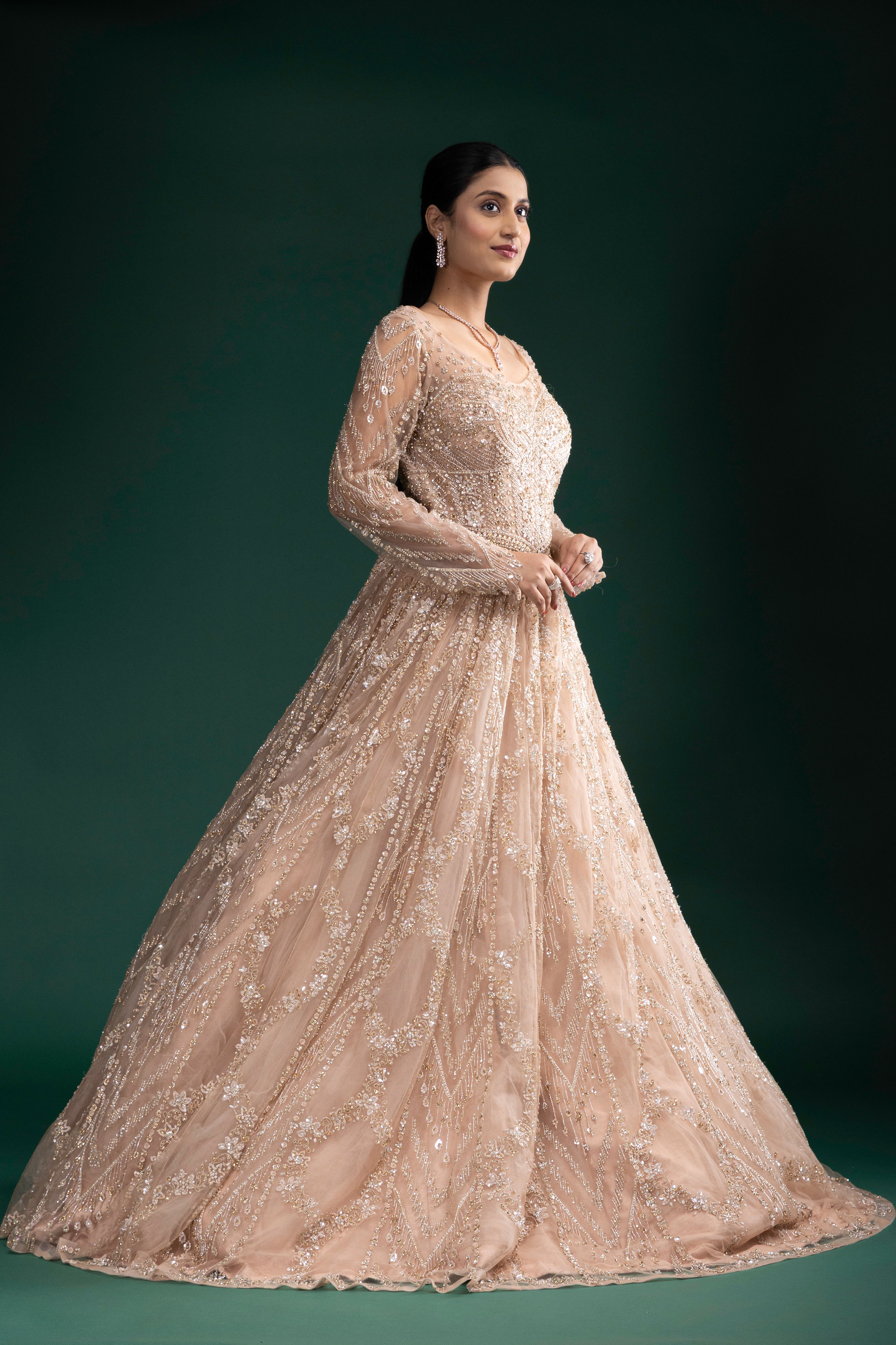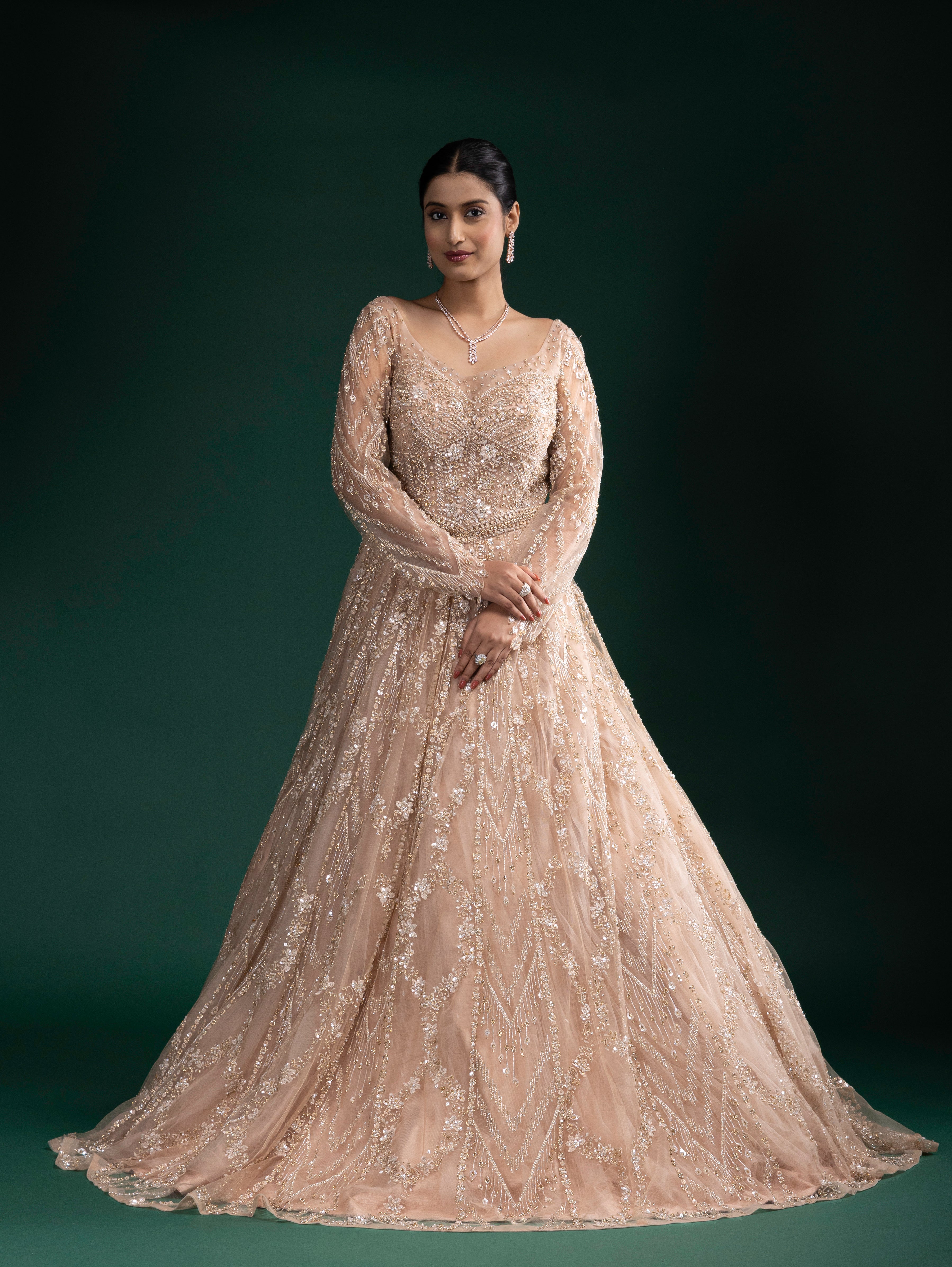 This champagne gold dusk gown features intricate all-over sequin embroidery on net, with a full-sleeve fitted bodice and a graceful flare. Adds timeless elegance to any celebration.