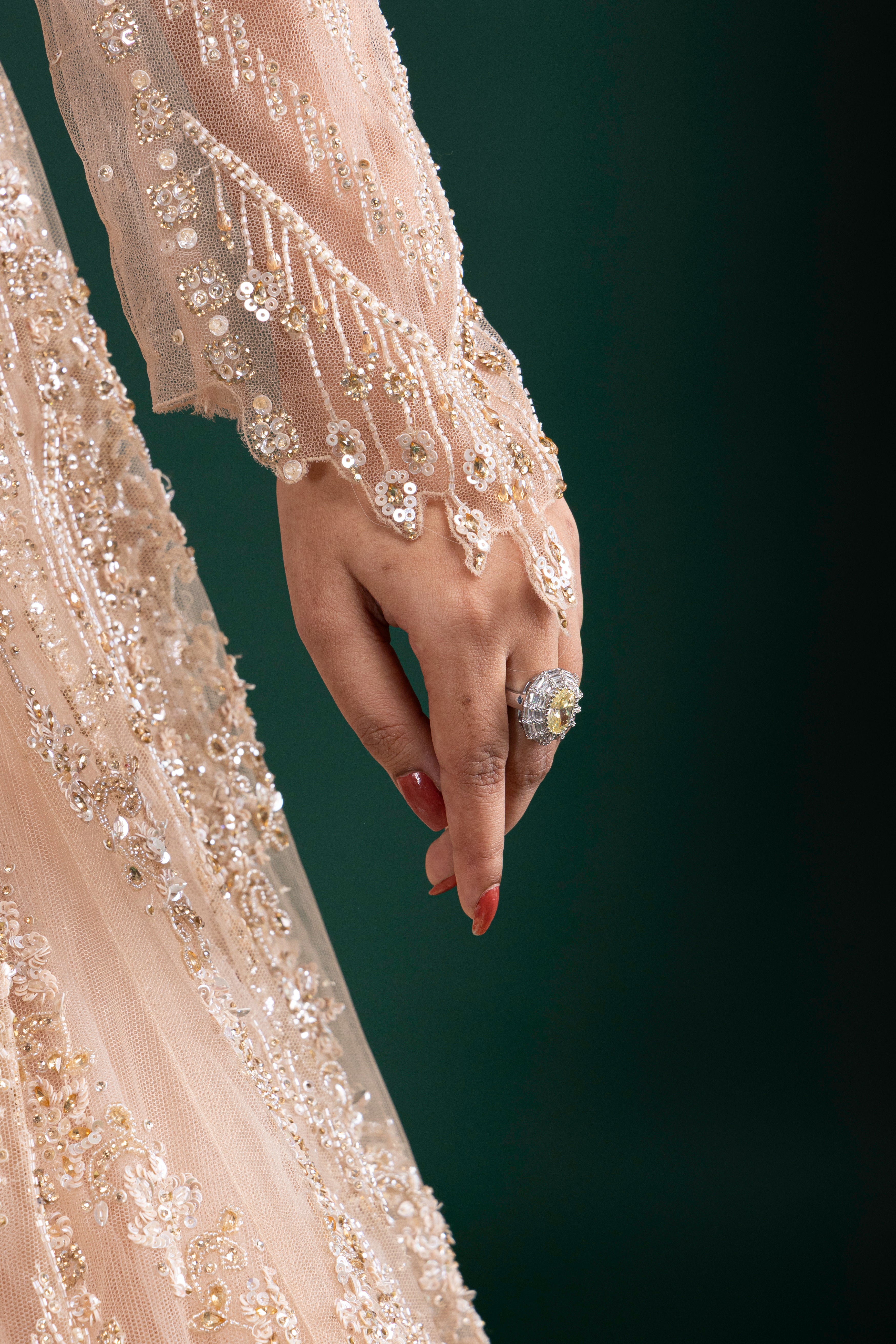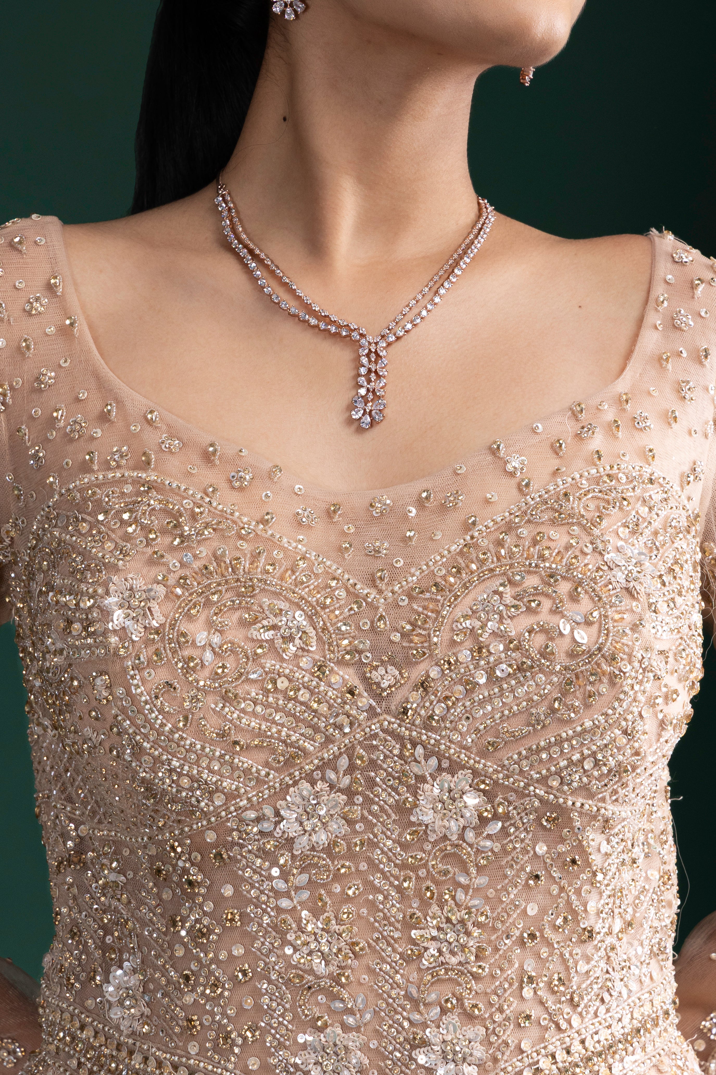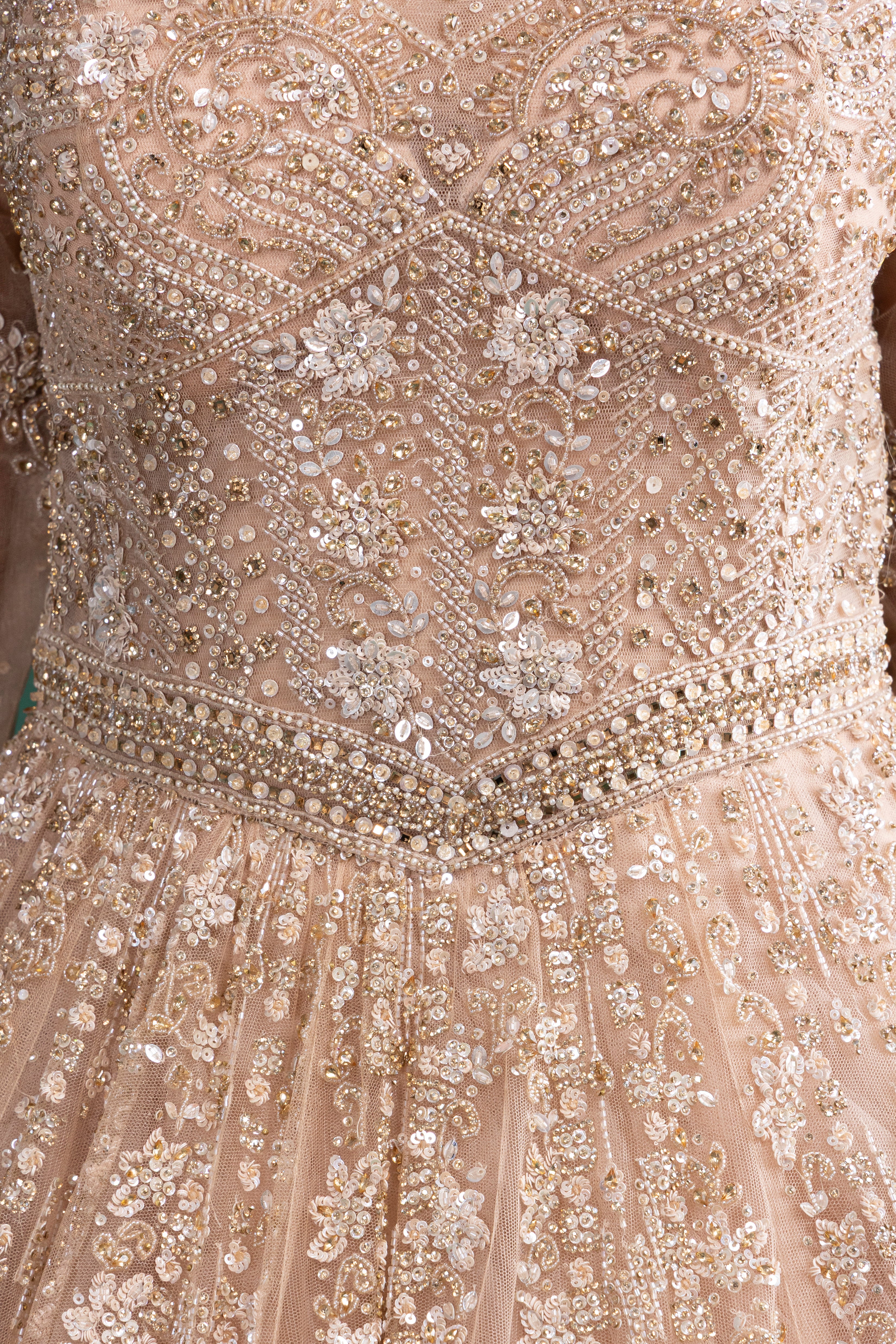 This champagne gold dusk gown features intricate all-over sequin embroidery on net, with a full-sleeve fitted bodice and a graceful flare. Adds timeless elegance to any celebration.