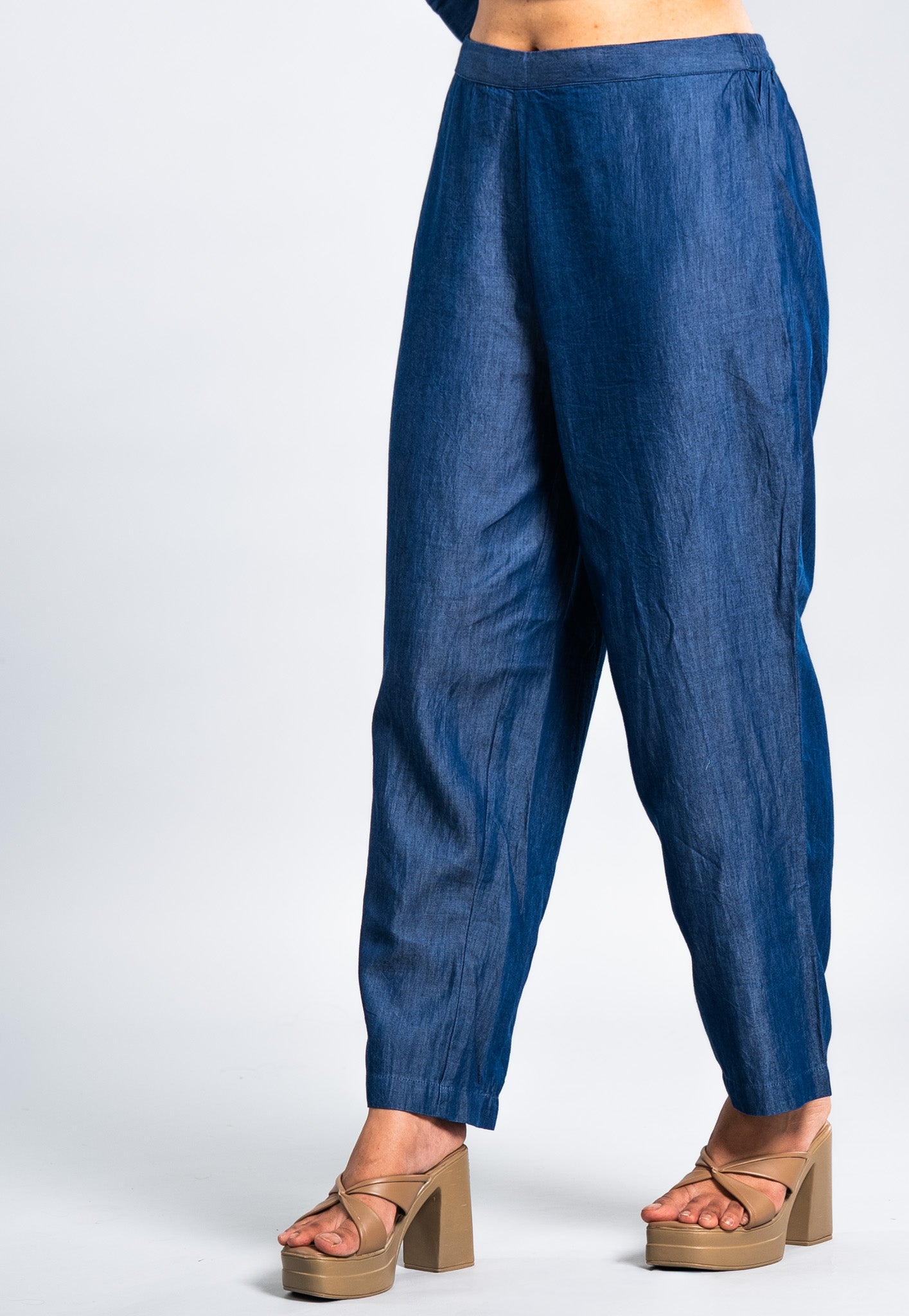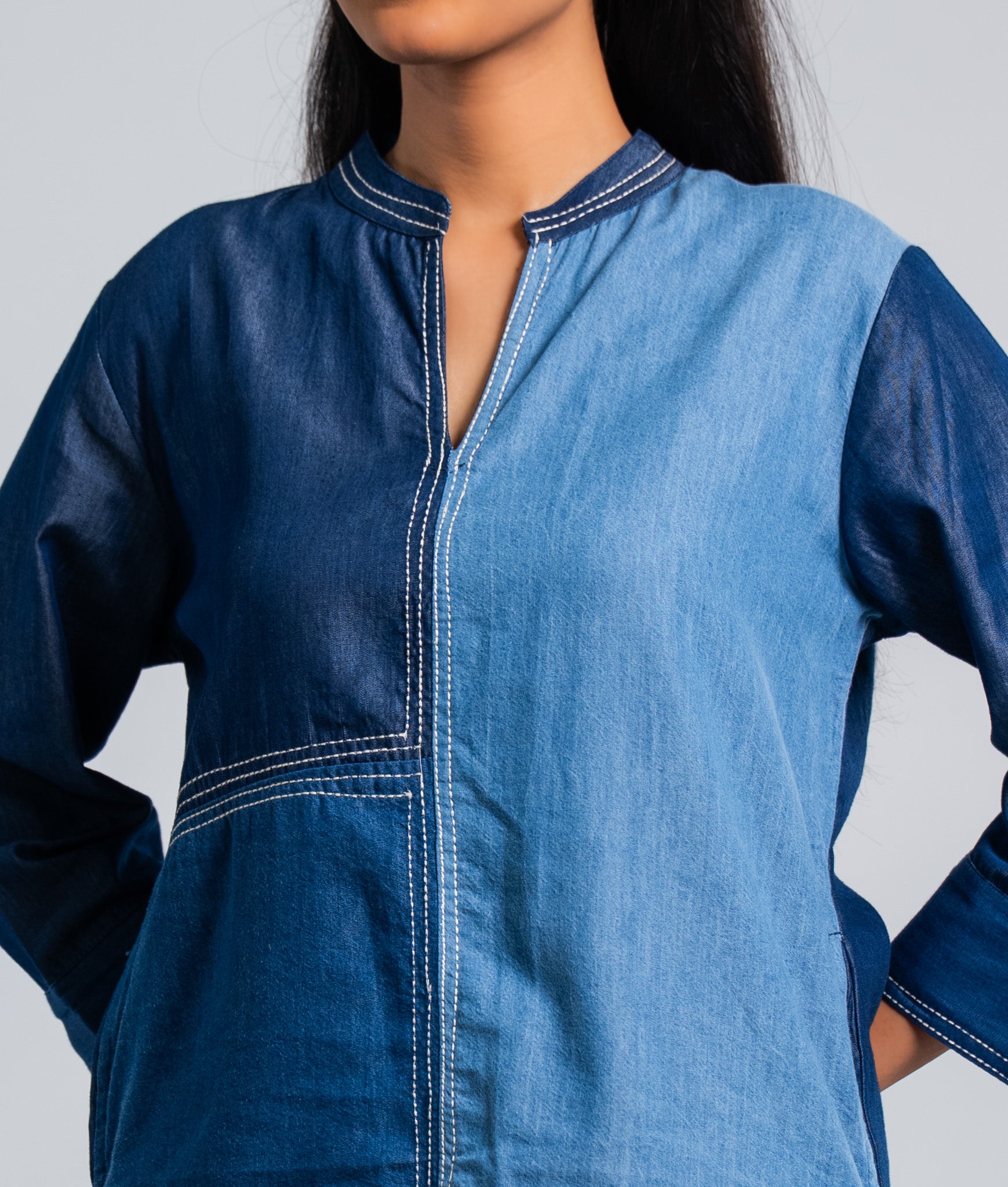 A chic denim co-ord set featuring a dual-tone patchwork effect and relaxed silhouette. The top has subtle stitch detailing and side slits, paired with easy-fit pants.