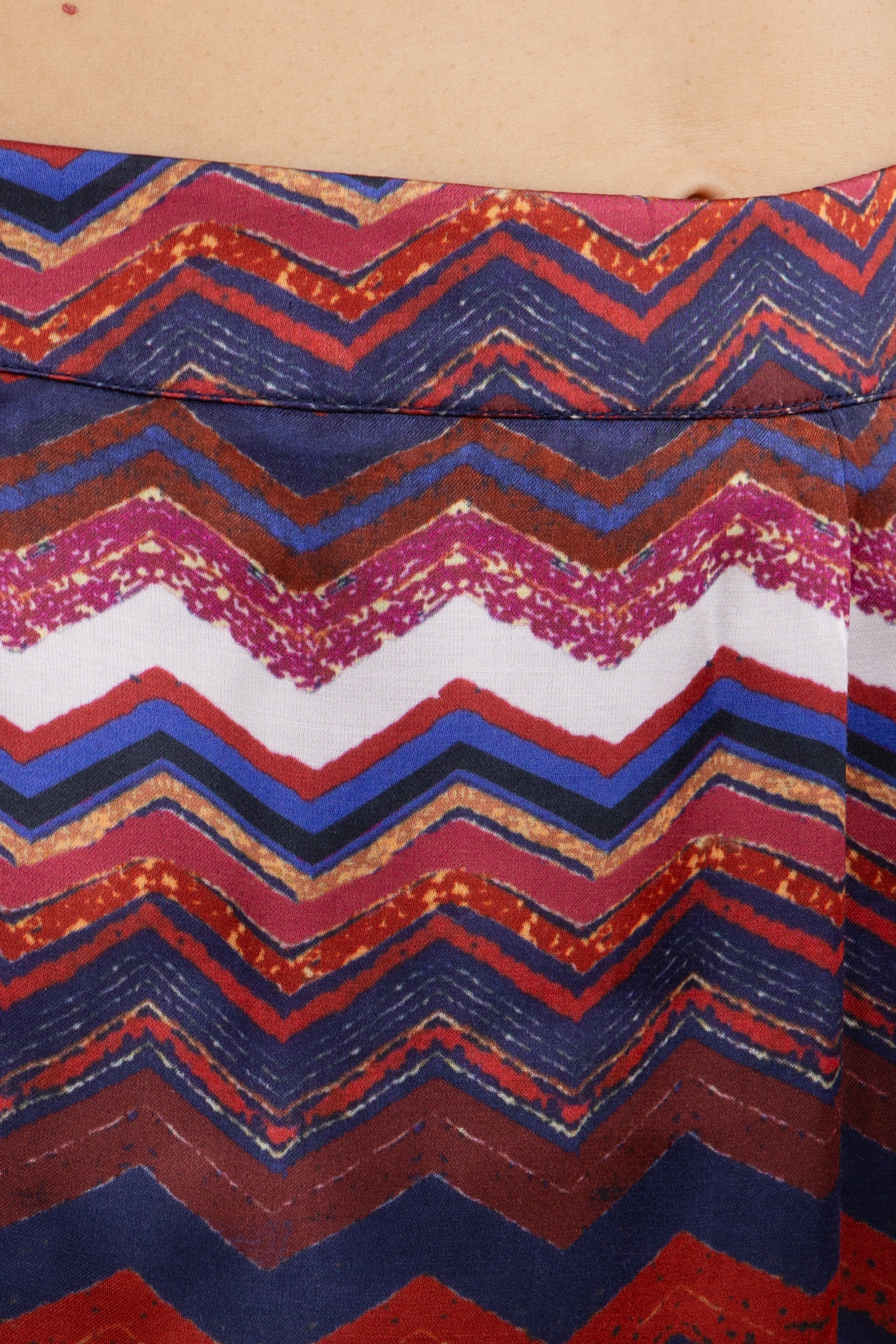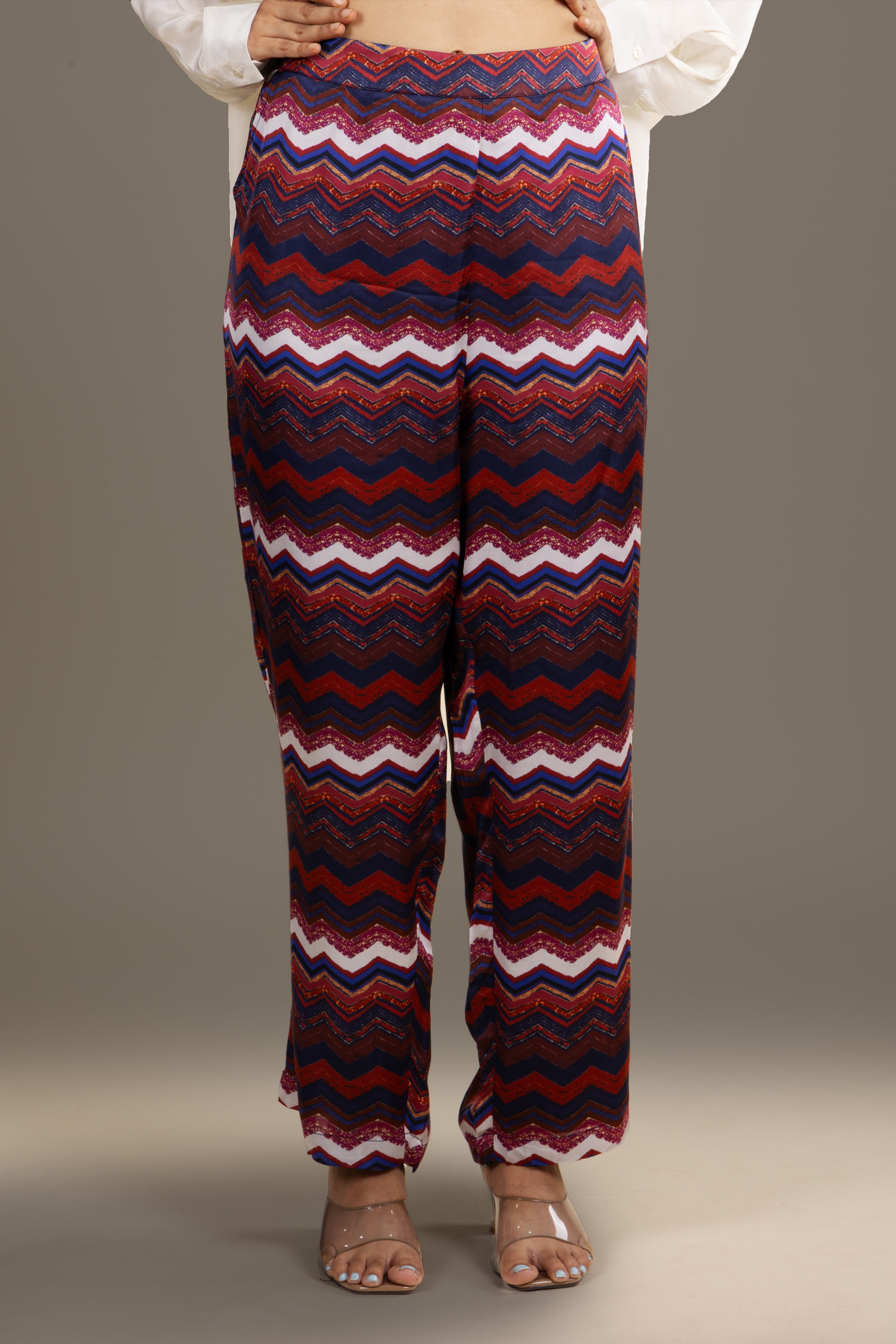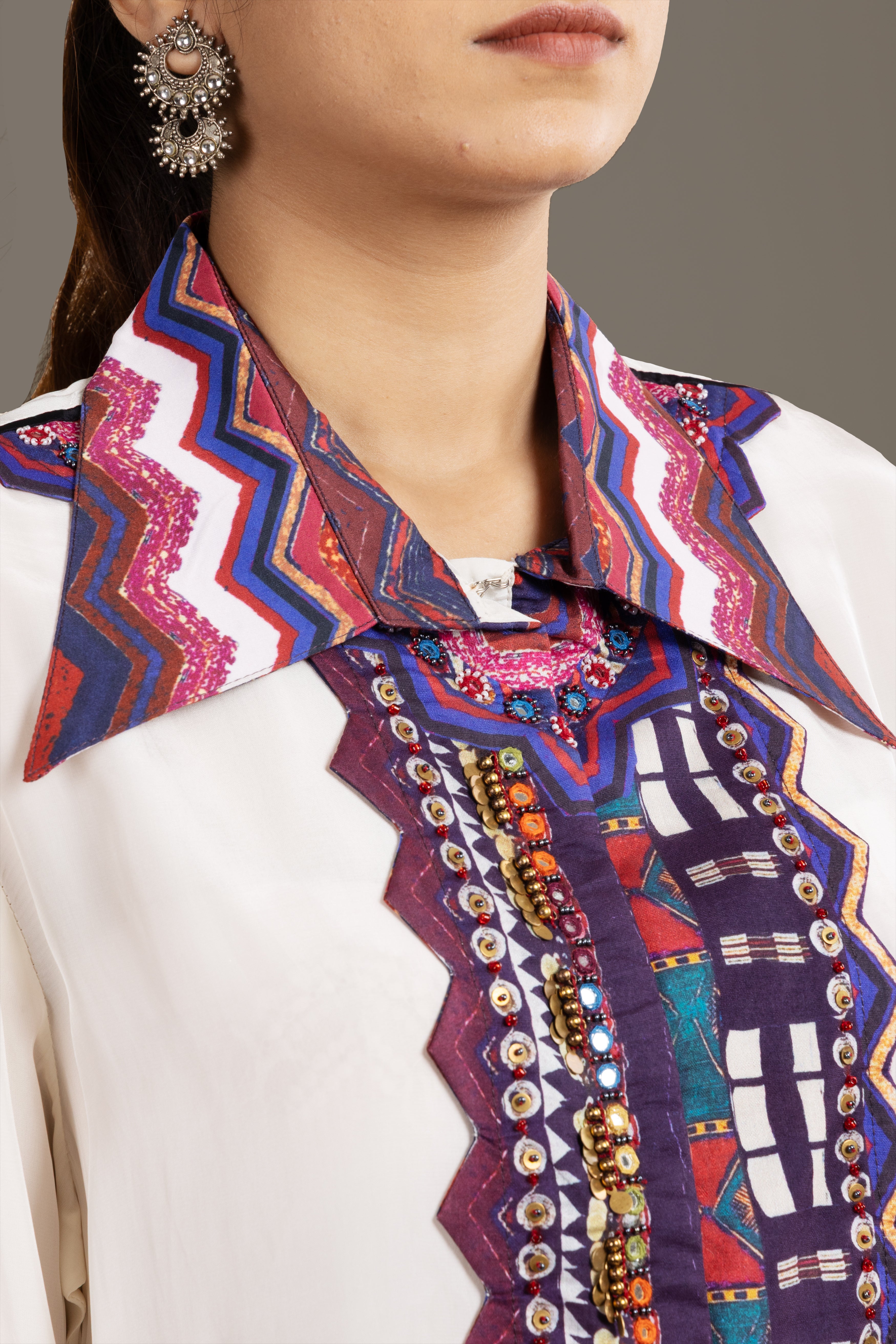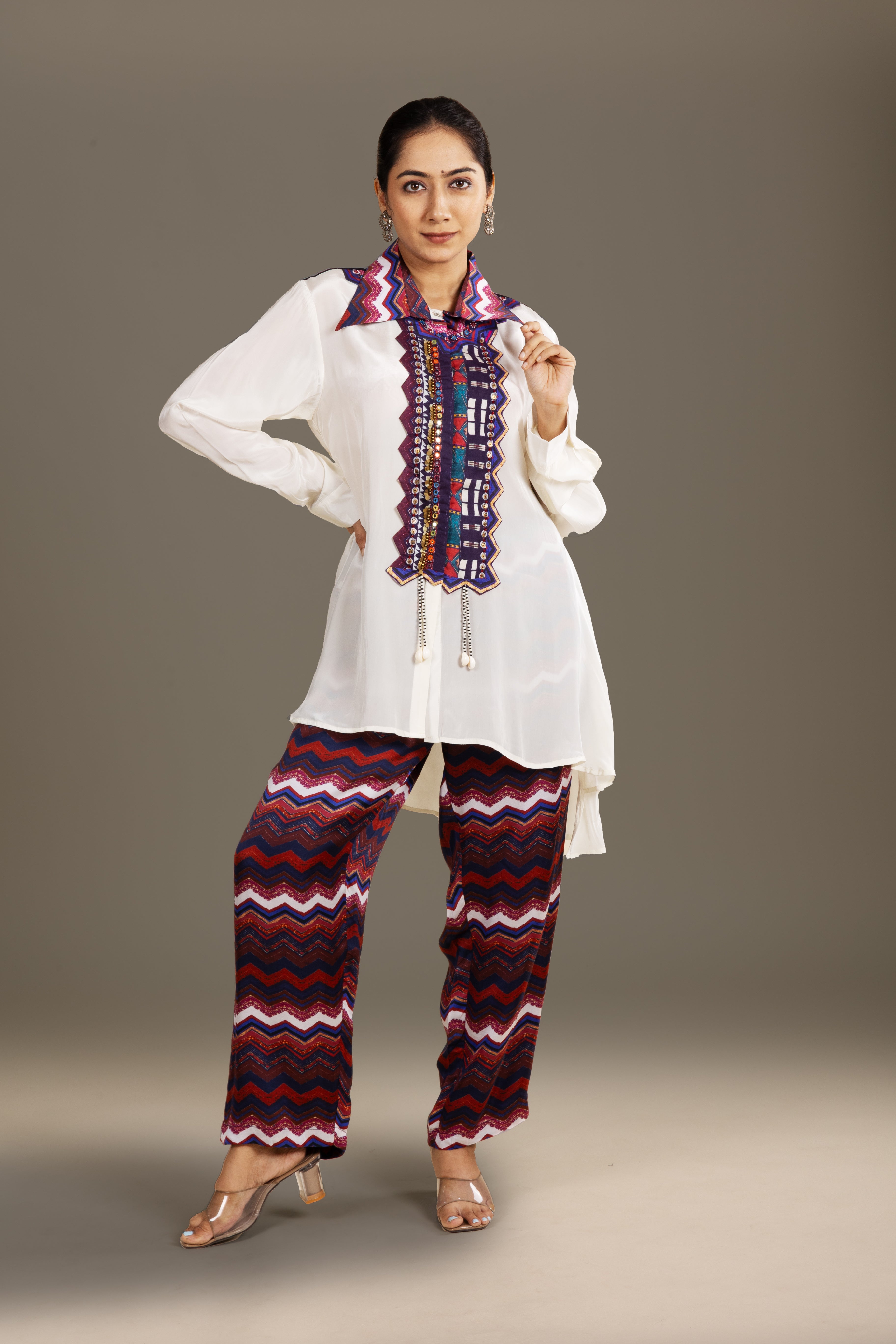 This ivory mist tunic features intricate geometric embroidery, paired with vibrant bohemian chevron pants, ideal for sophisticated ethnic styling and casual glam.