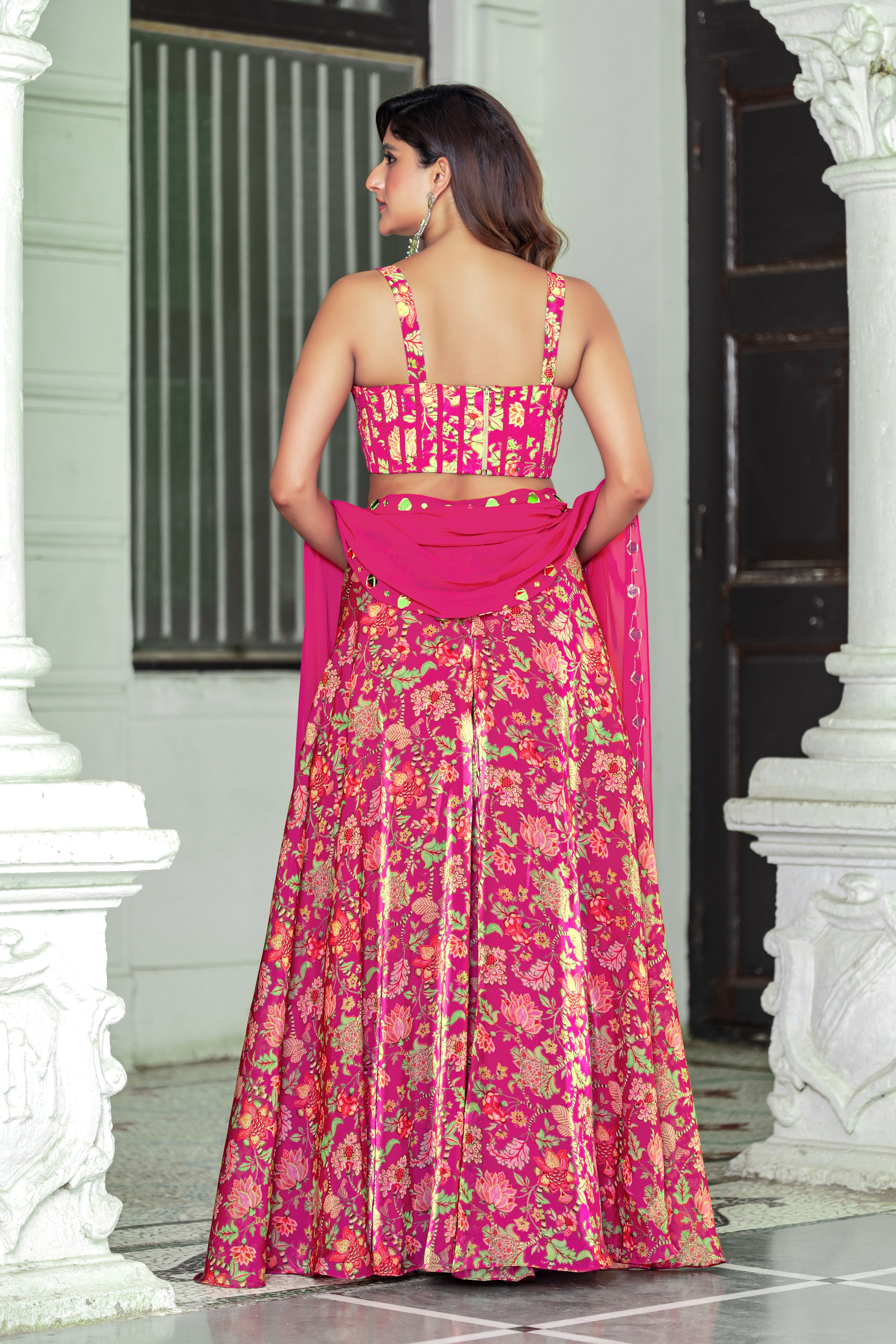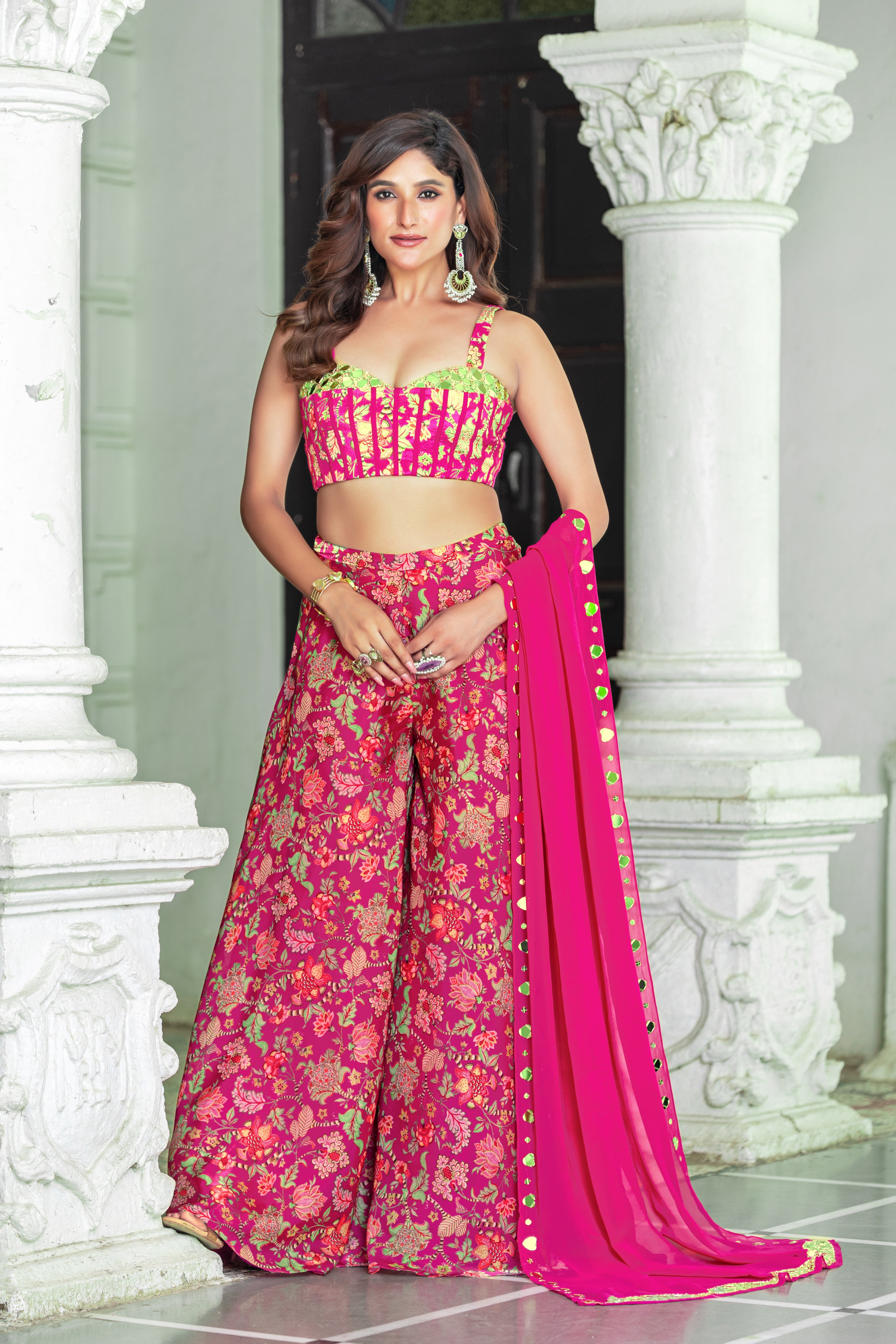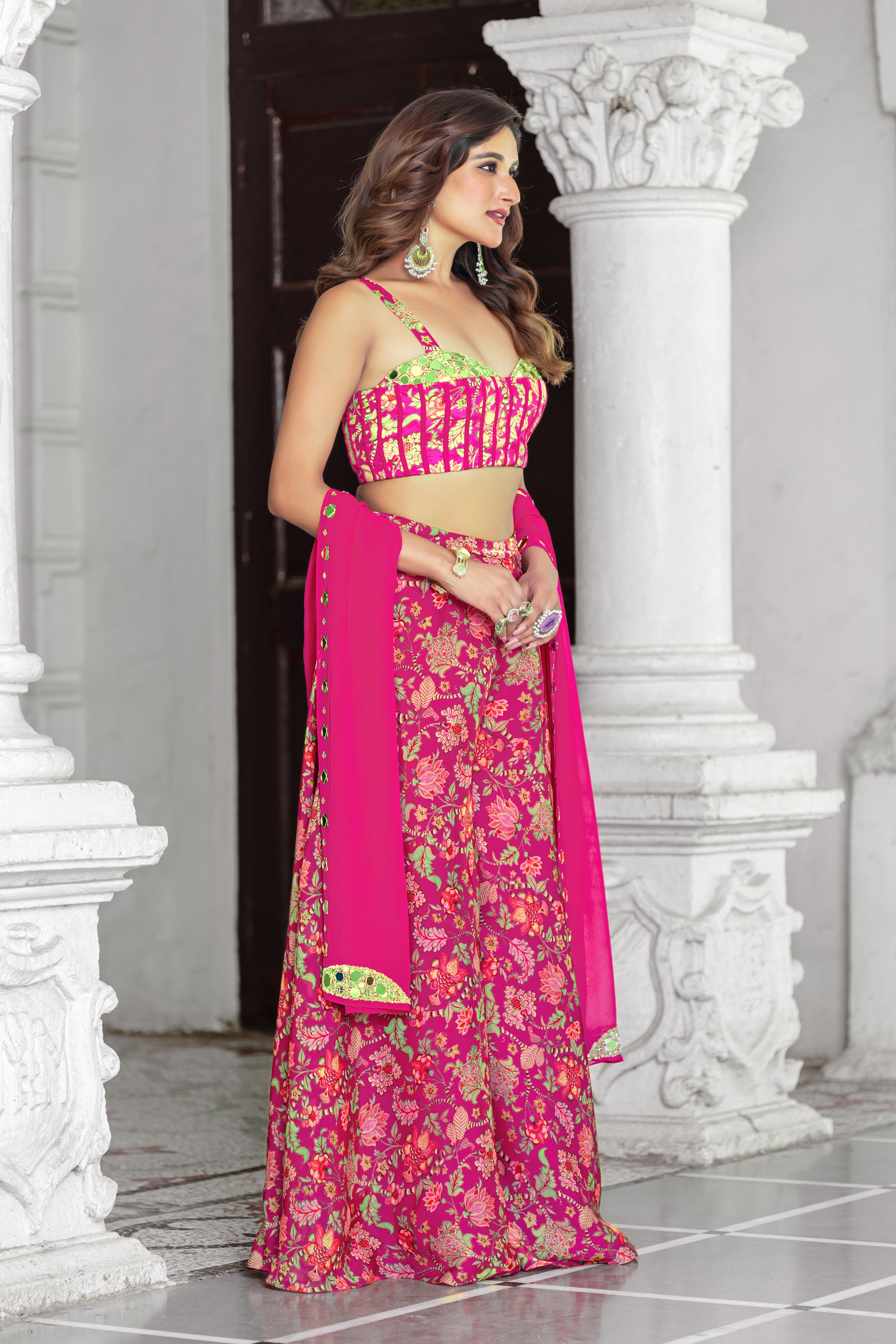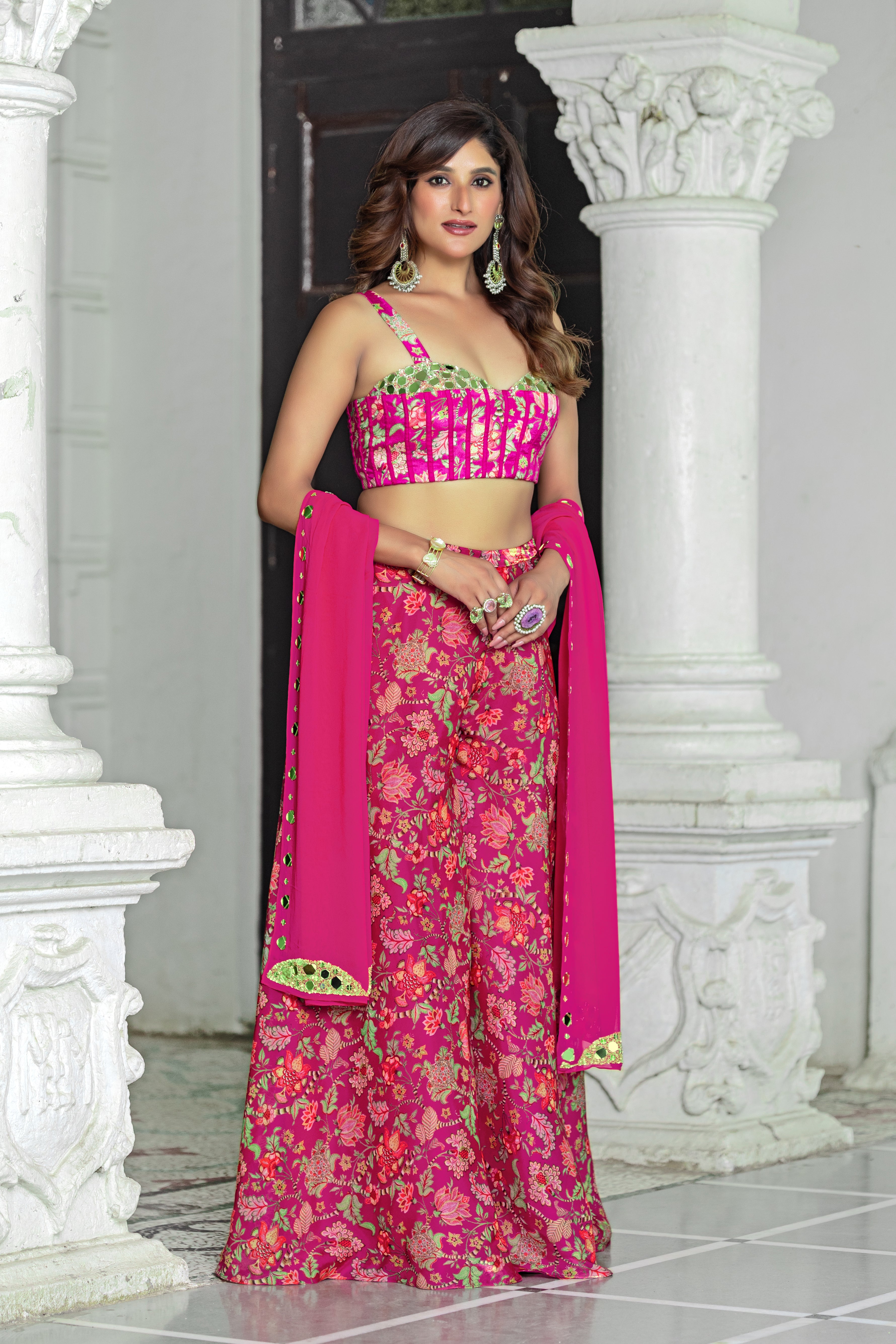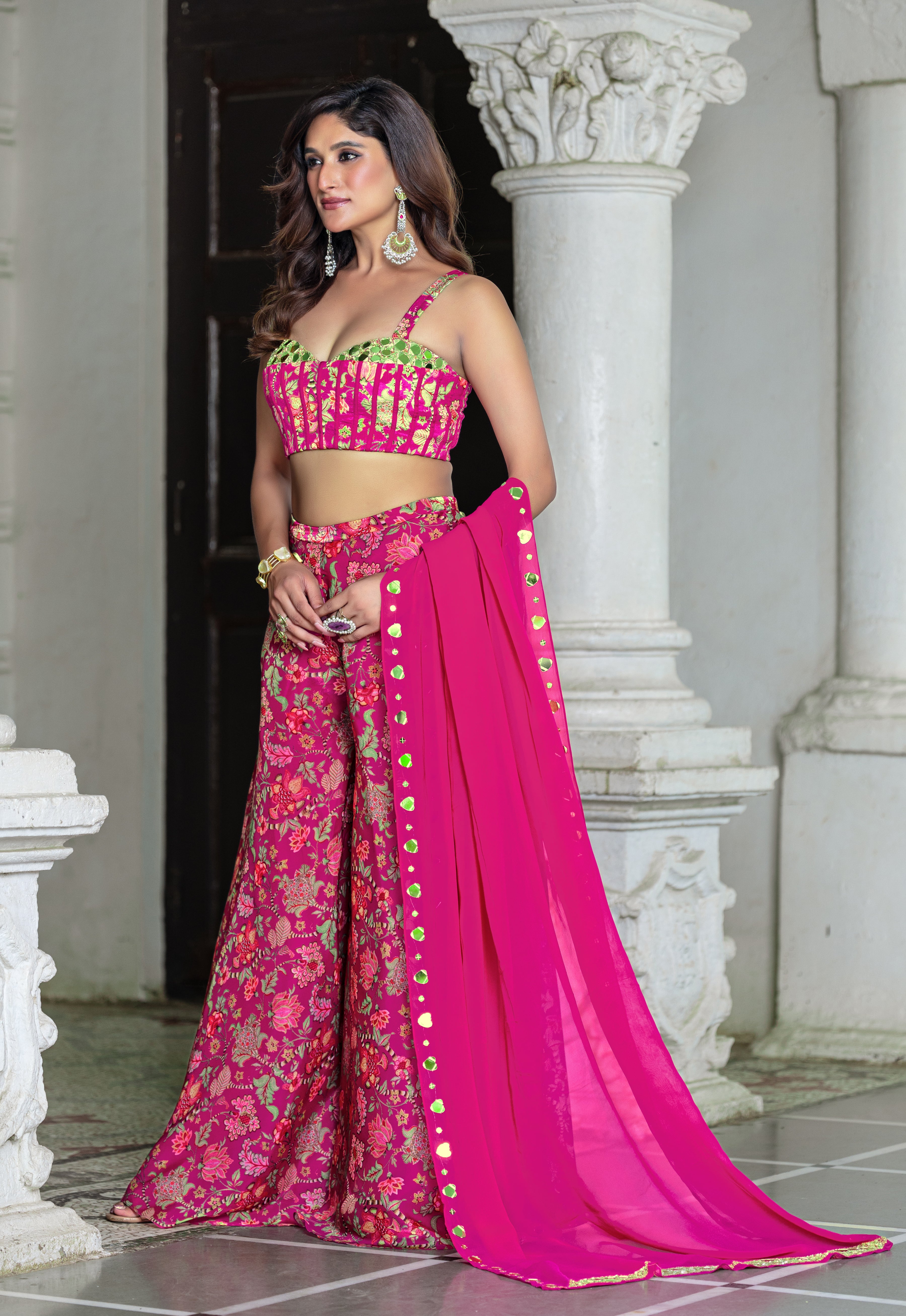 Turn heads this festive season with our vibrant Gulbahaar Mirrorwork Coord Set. This striking ensemble features a hot pink mirror-embellished bustier with a sweetheart neckline and thick straps, adorned with golden lotus motifs and vertical piping for a structured silhouette. The coordinated wide-leg palazzos boast an all-over floral print in hues of gold, green, and coral, adding effortless flair and movement. Finished with a matching chiffon dupatta featuring heart-shaped mirror details and gota lace edges, this look blends traditional glam with contemporary chic. Perfect for mehendi, haldi, and cocktail nights, this set is a must-have for your celebration wardrobe.
