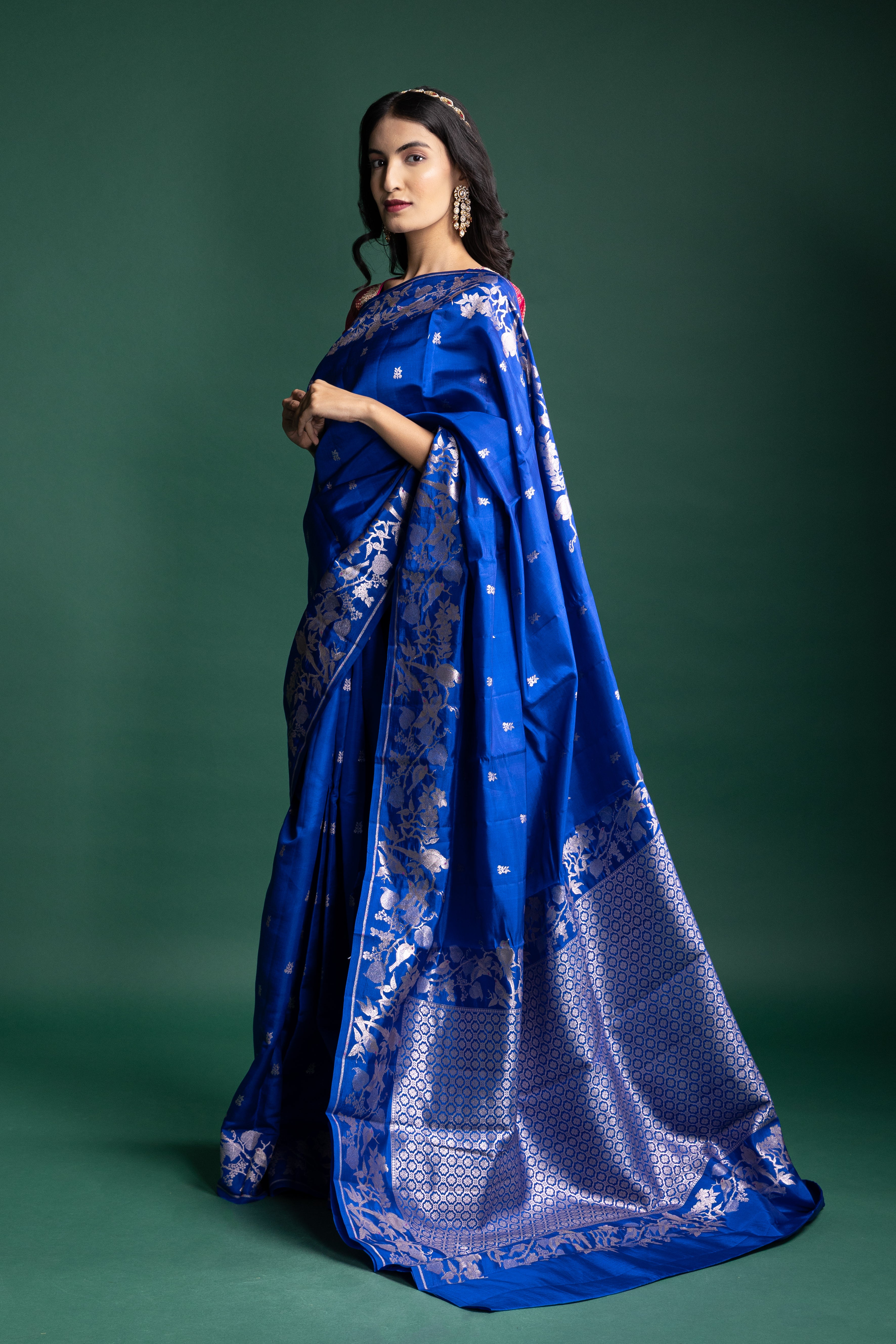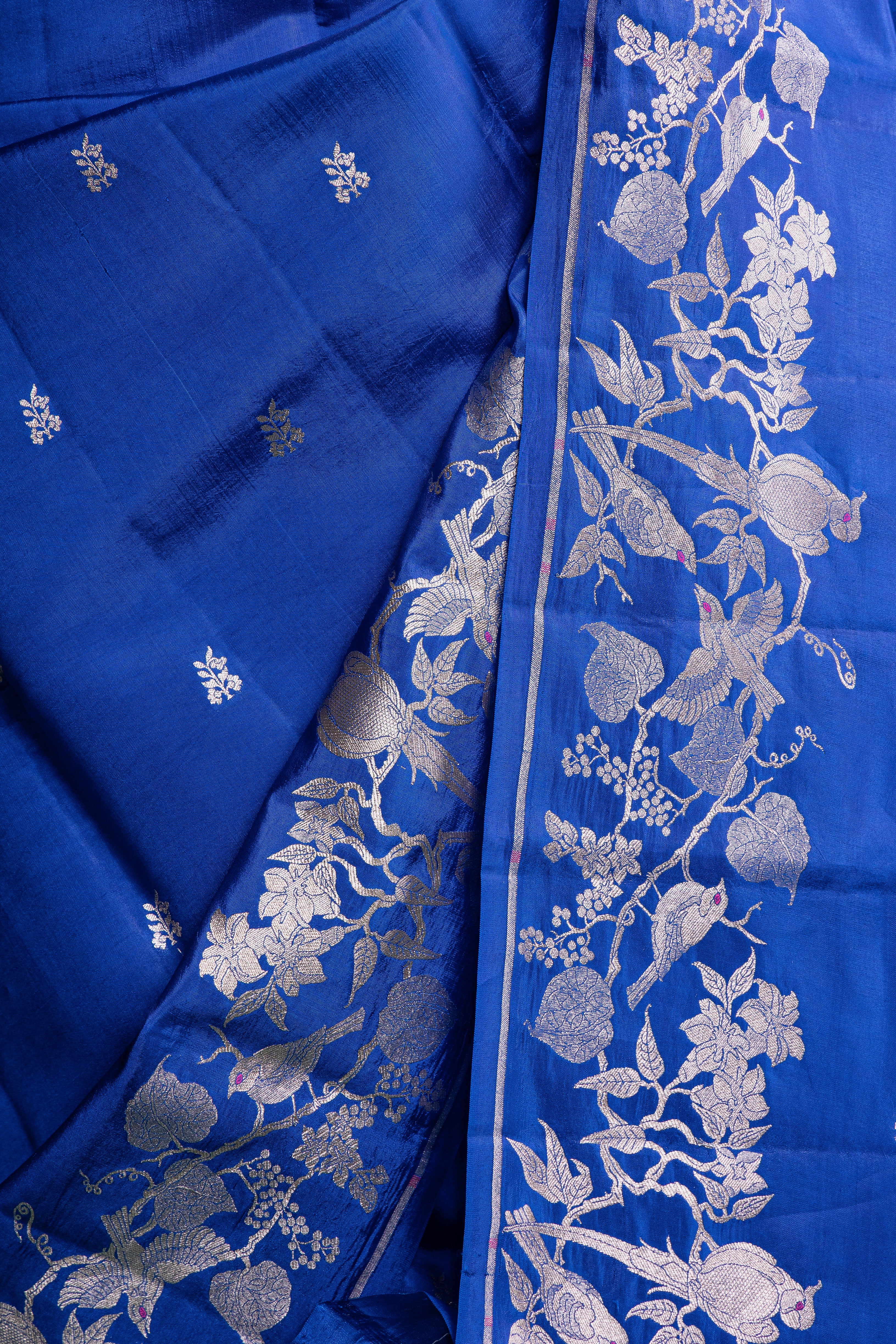 Imperial Sapphire Blue Raw Mango Silk Saree with Moonlit Silver Floral Brocade