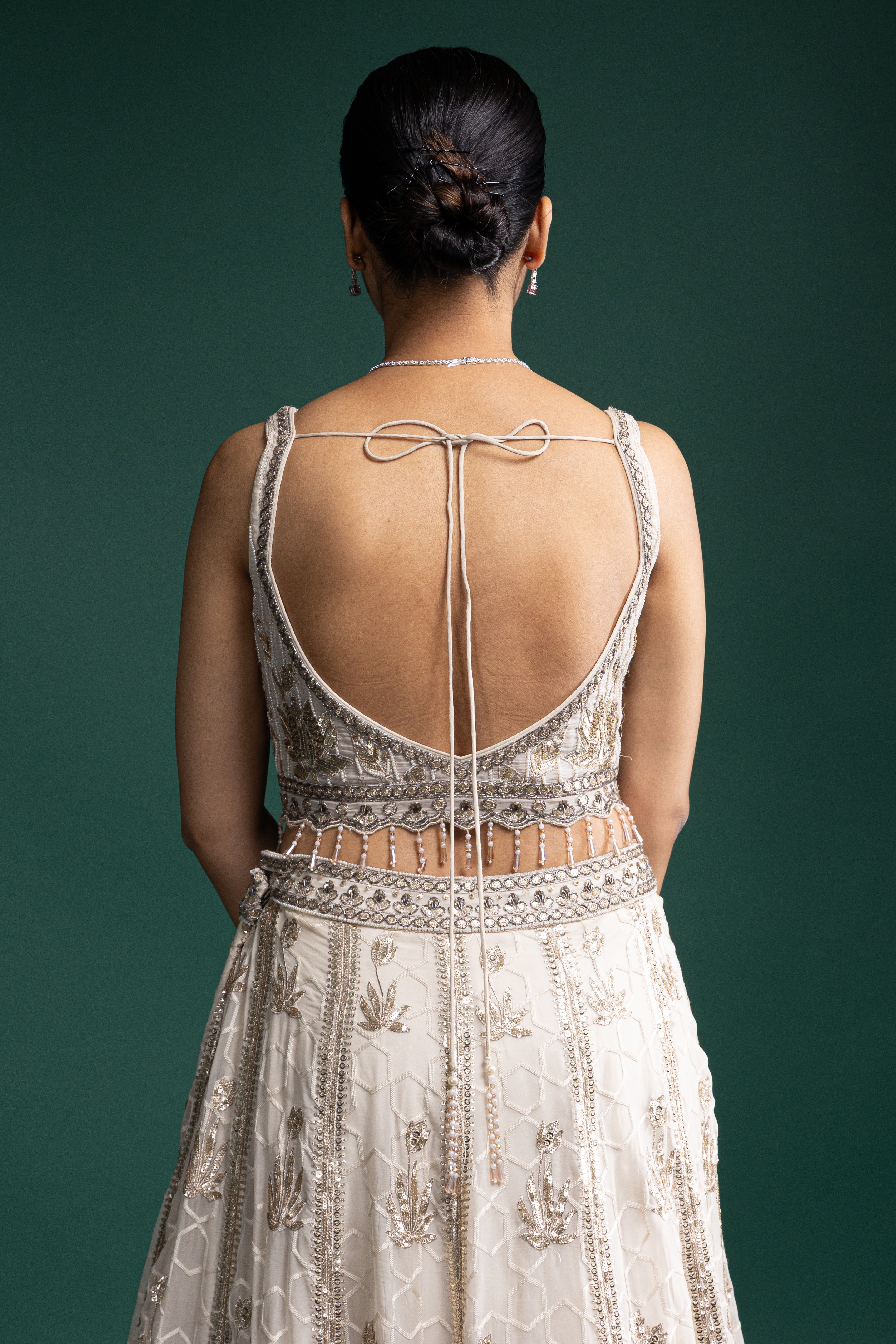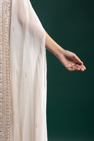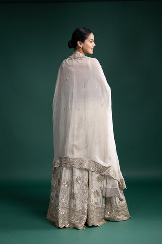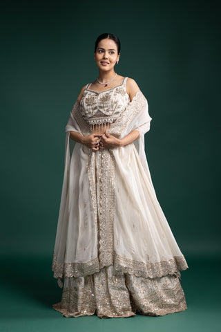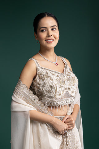 Crafted in rich ivory fabric with detailed zardozi and mirror embellishments, this lehenga set radiates understated luxury. Its lightweight feel adds comfort to grand festive moments.