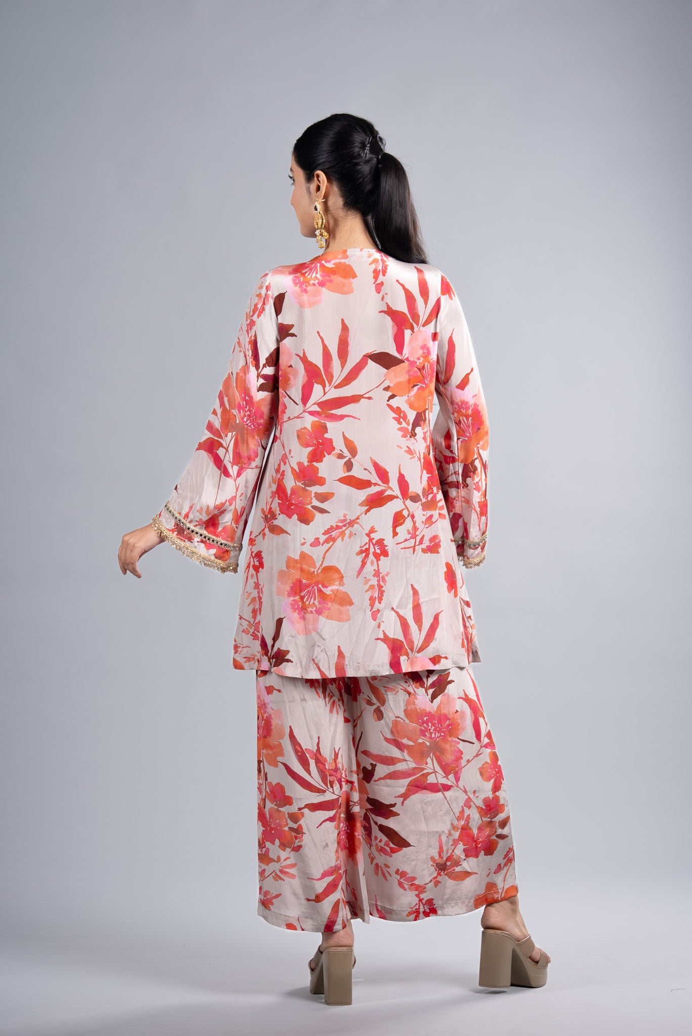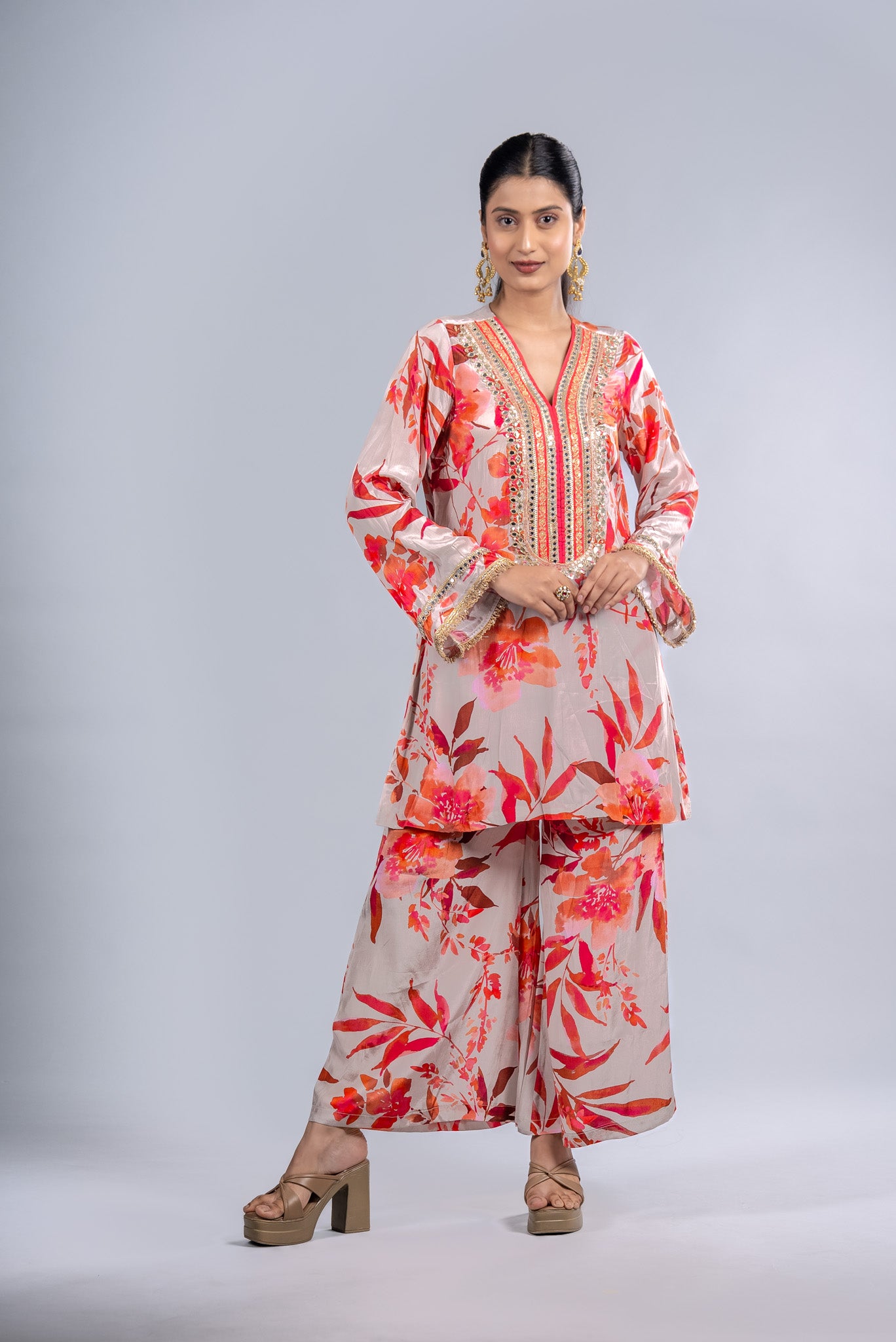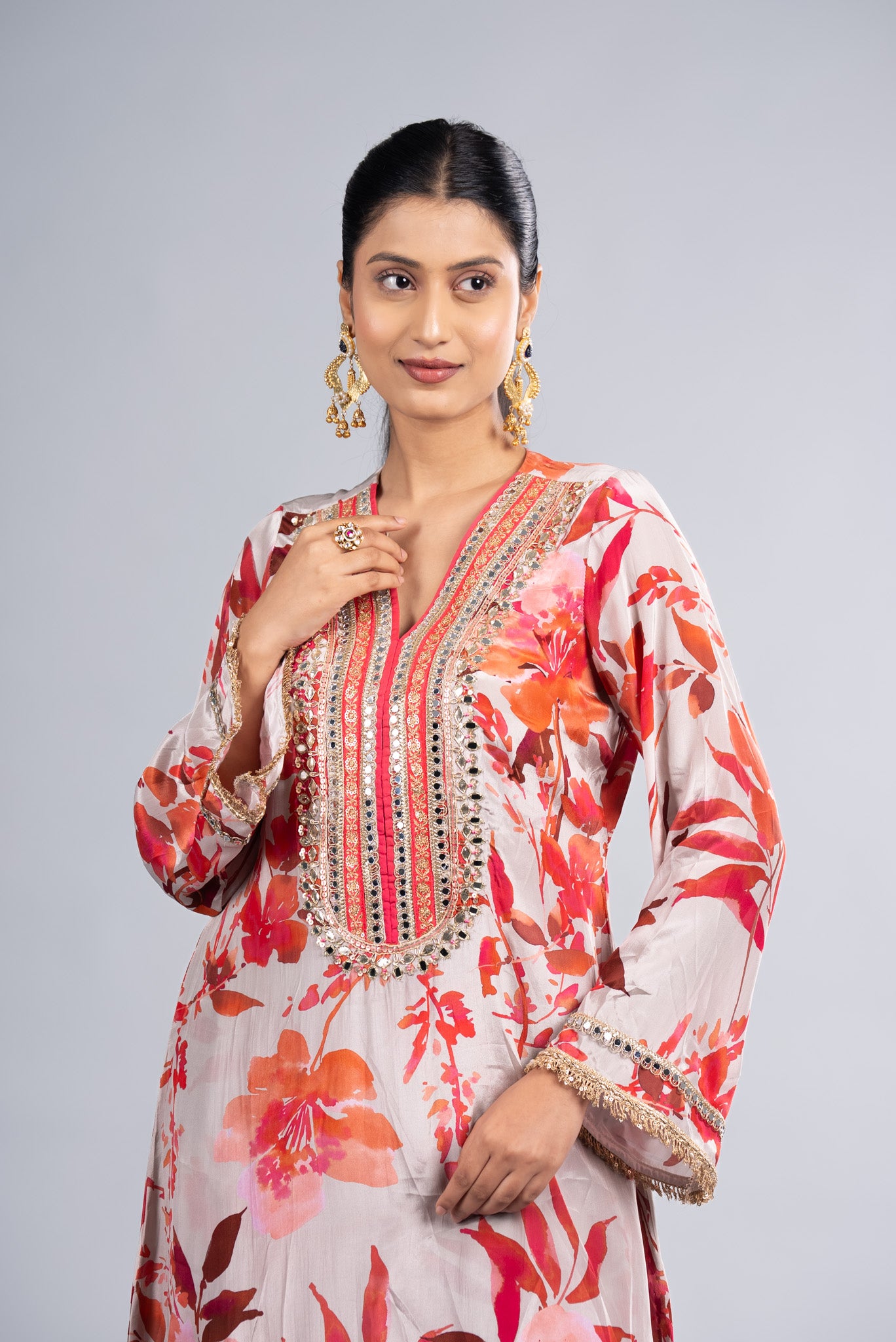 This ivory white kurta set, adorned with vibrant pink floral prints and paired with a bold pink dupatta, exudes festive charm and timeless sophistication for upscale gatherings.