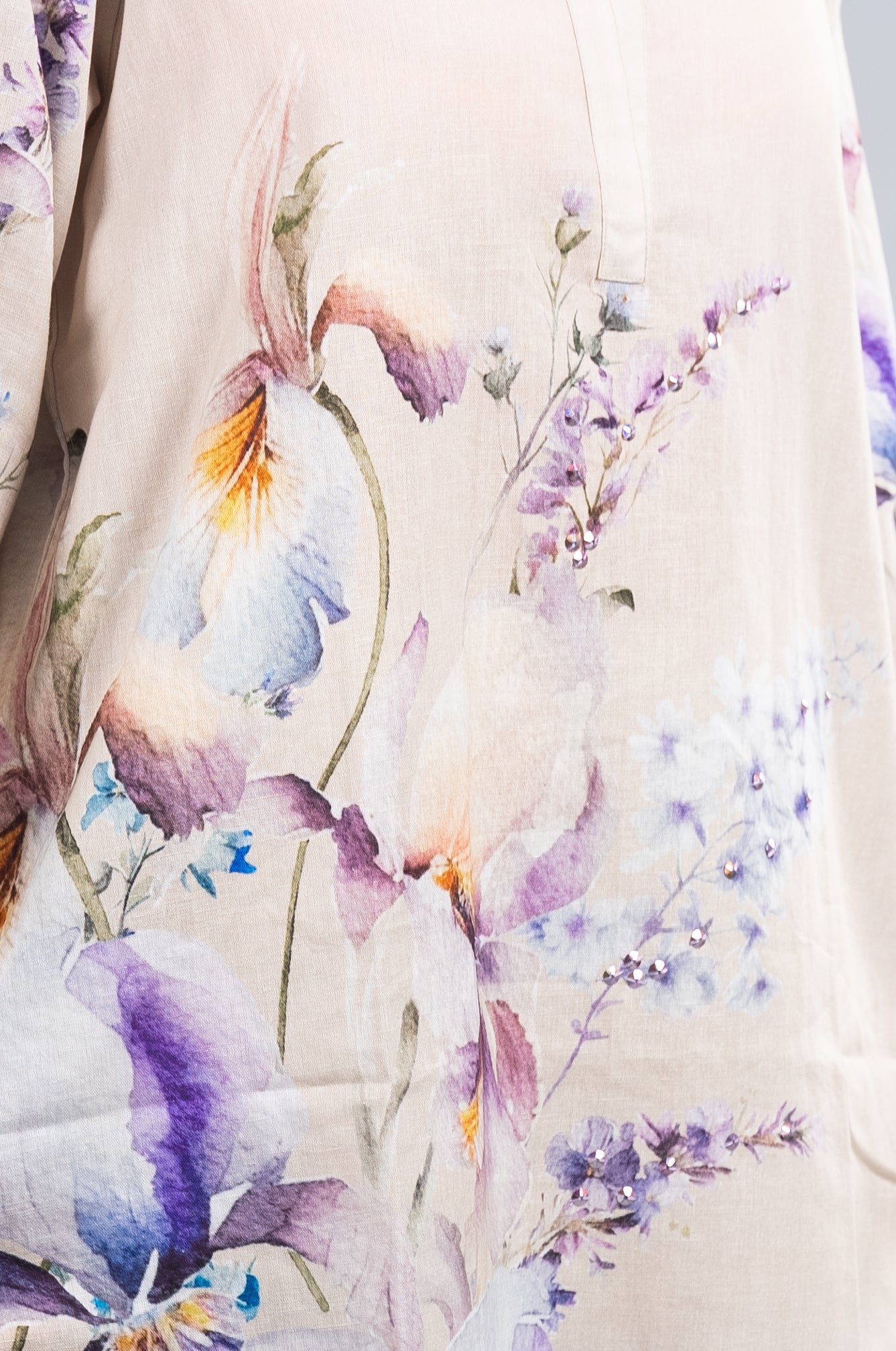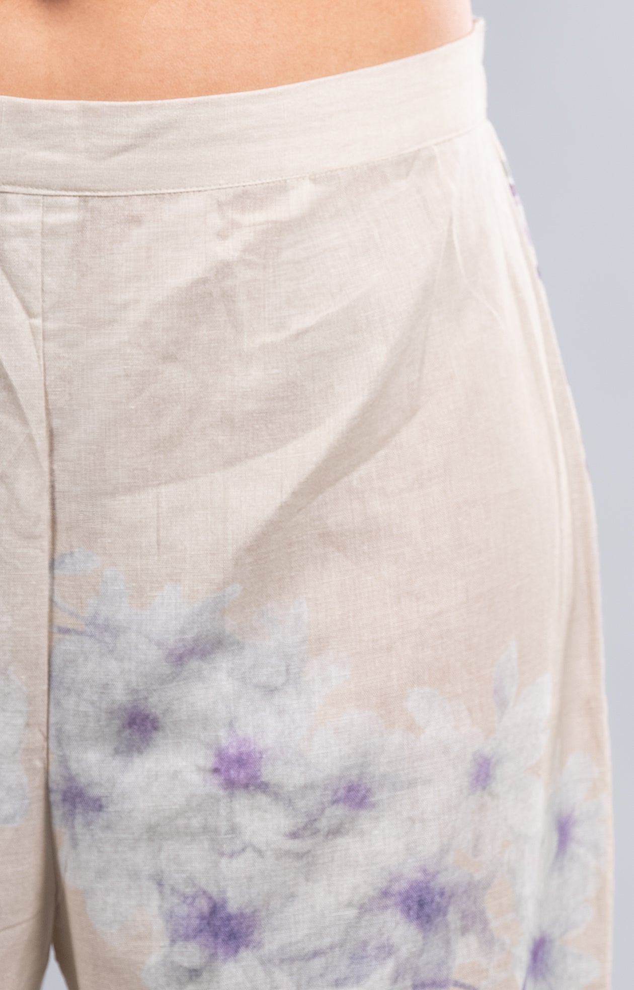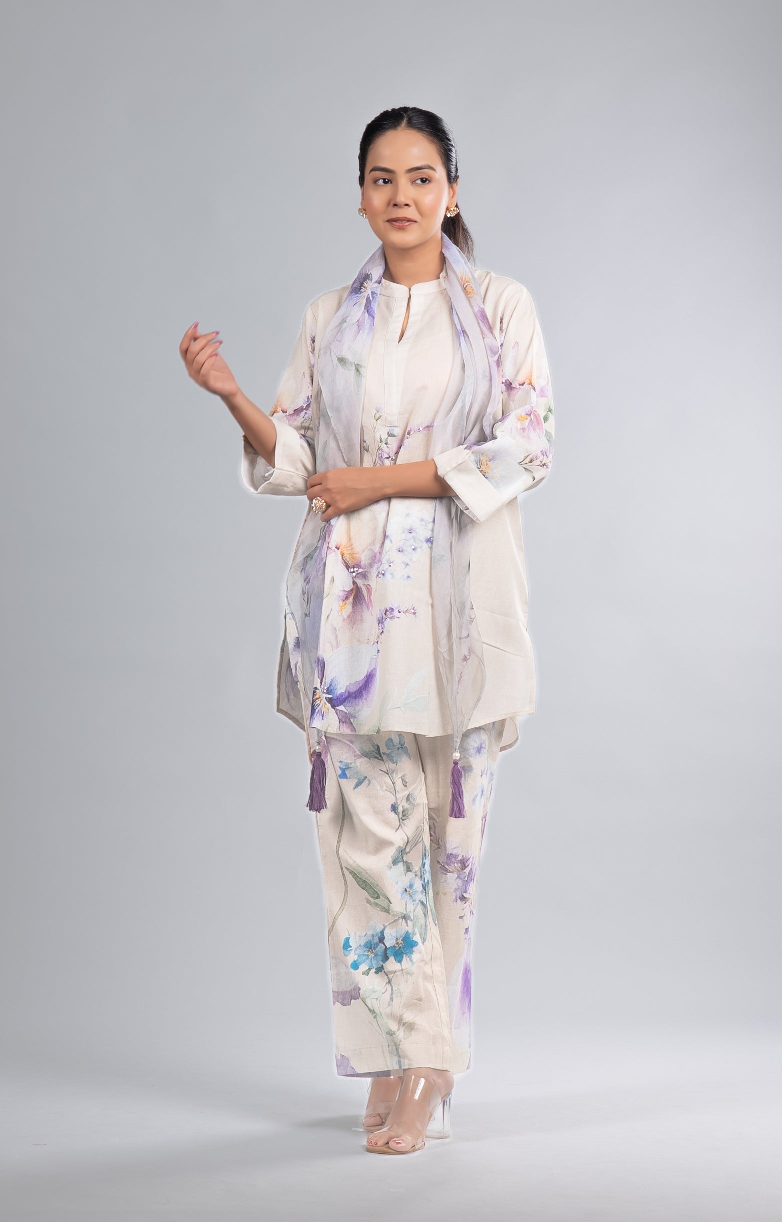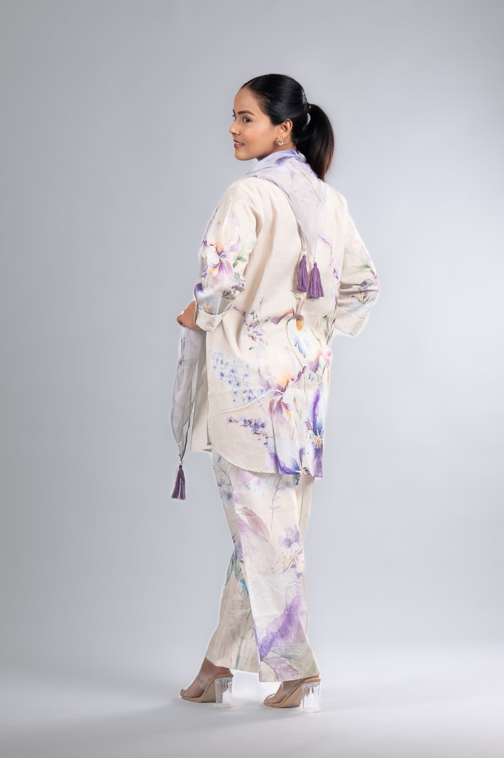 This ivory white Co-ord set, adorned with pastel watercolour floral prints, exudes sophistication and grace. A versatile ensemble for both daytime elegance and refined evening gatherings.