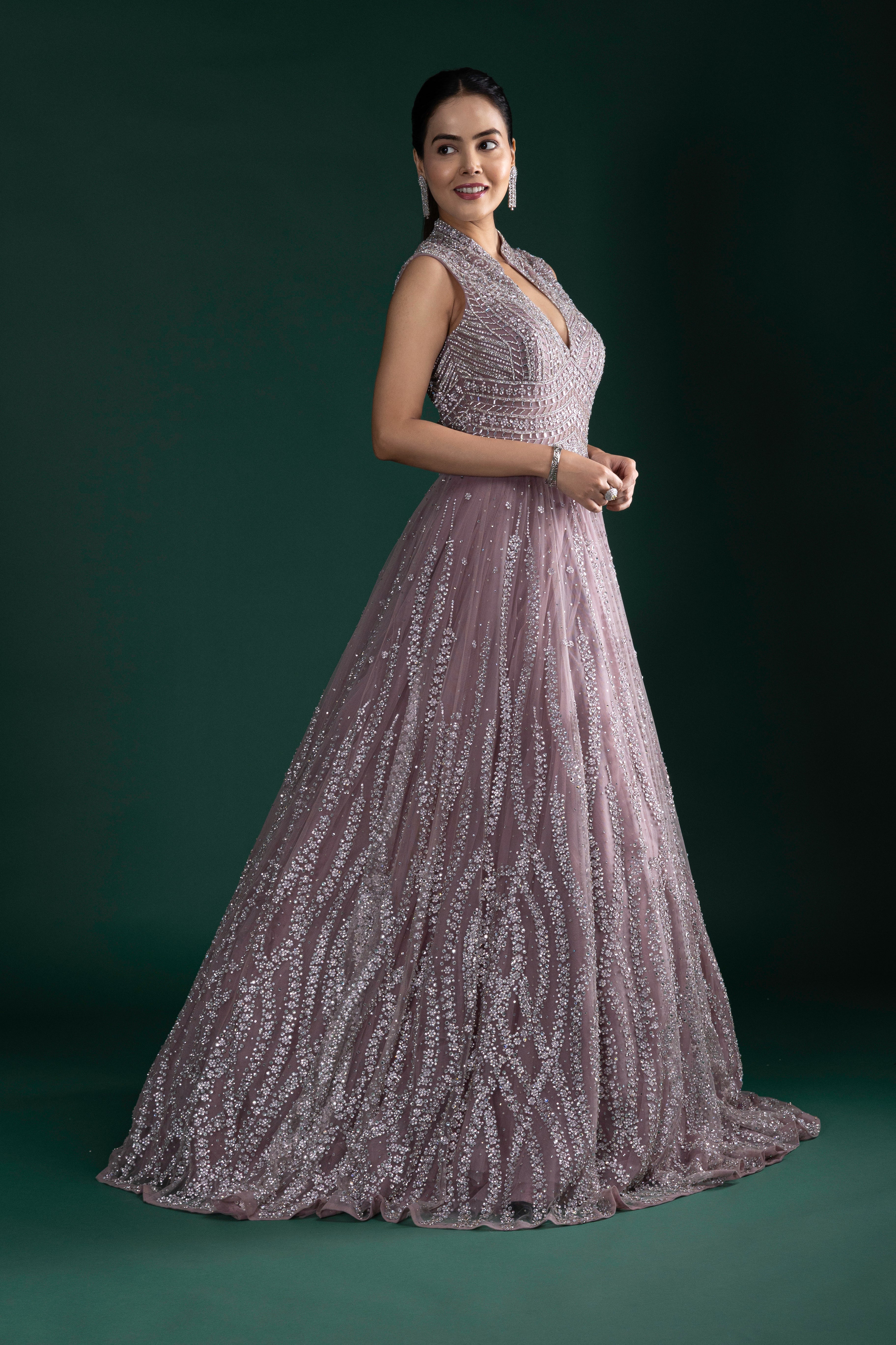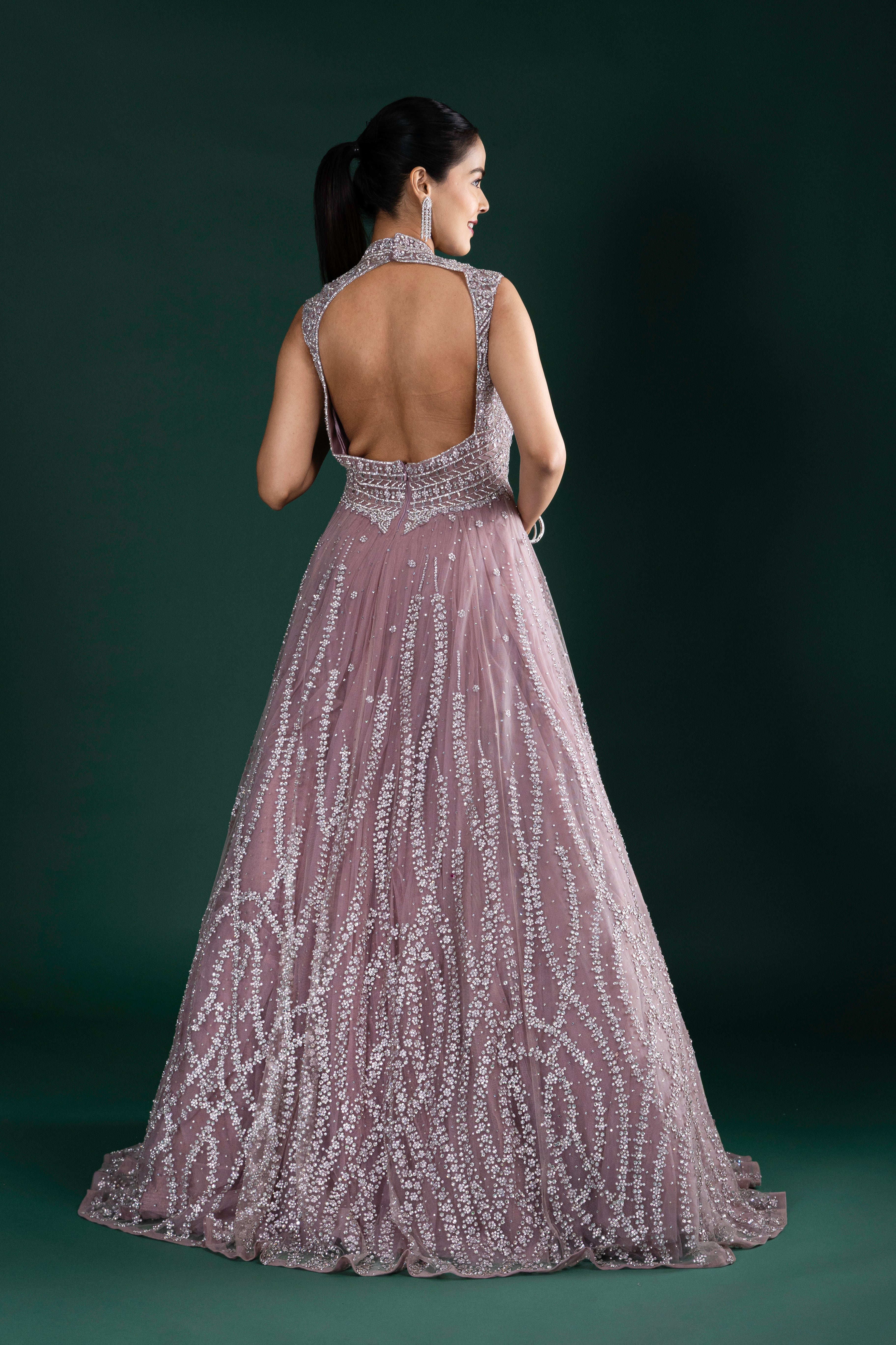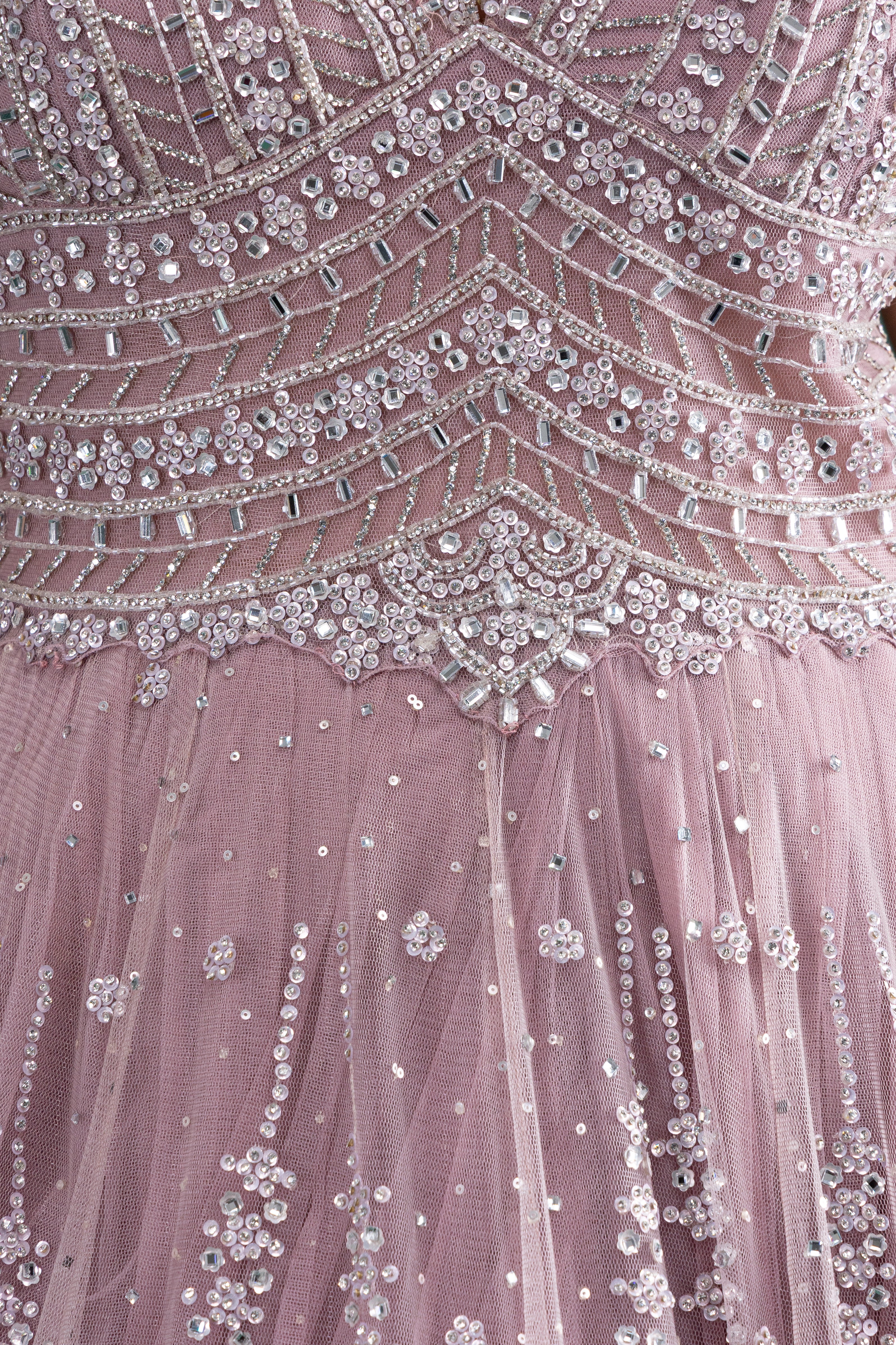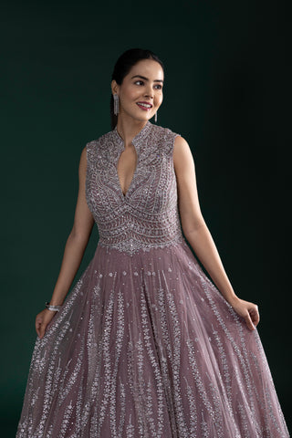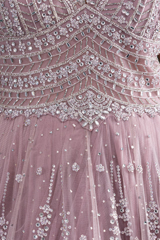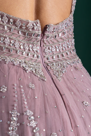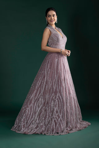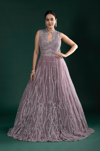 Radiate ethereal charm in this dusty mauve pink gown featuring intricate silver sequin embroidery, a flattering keyhole neckline, and a voluminous flare for picture-perfect elegance.