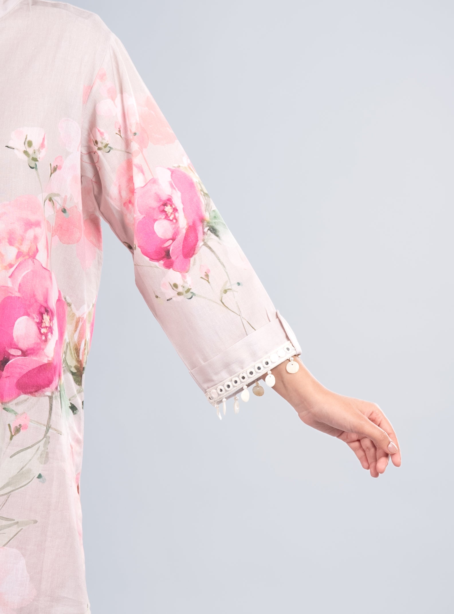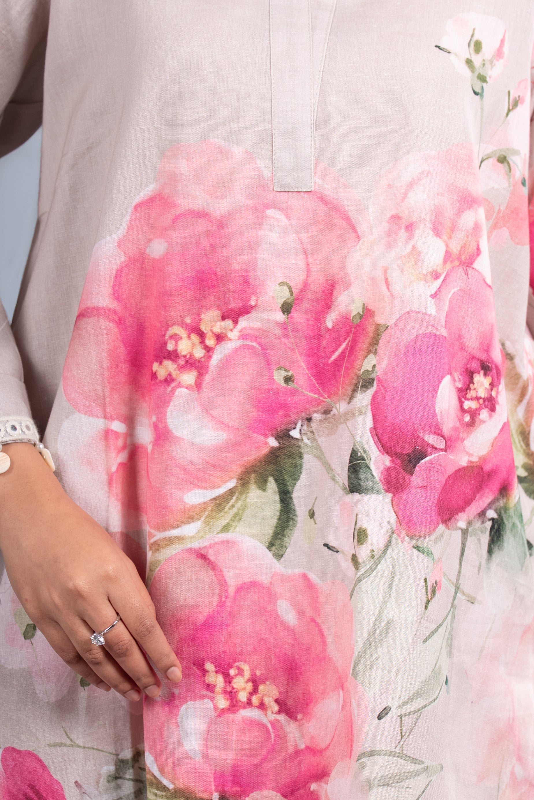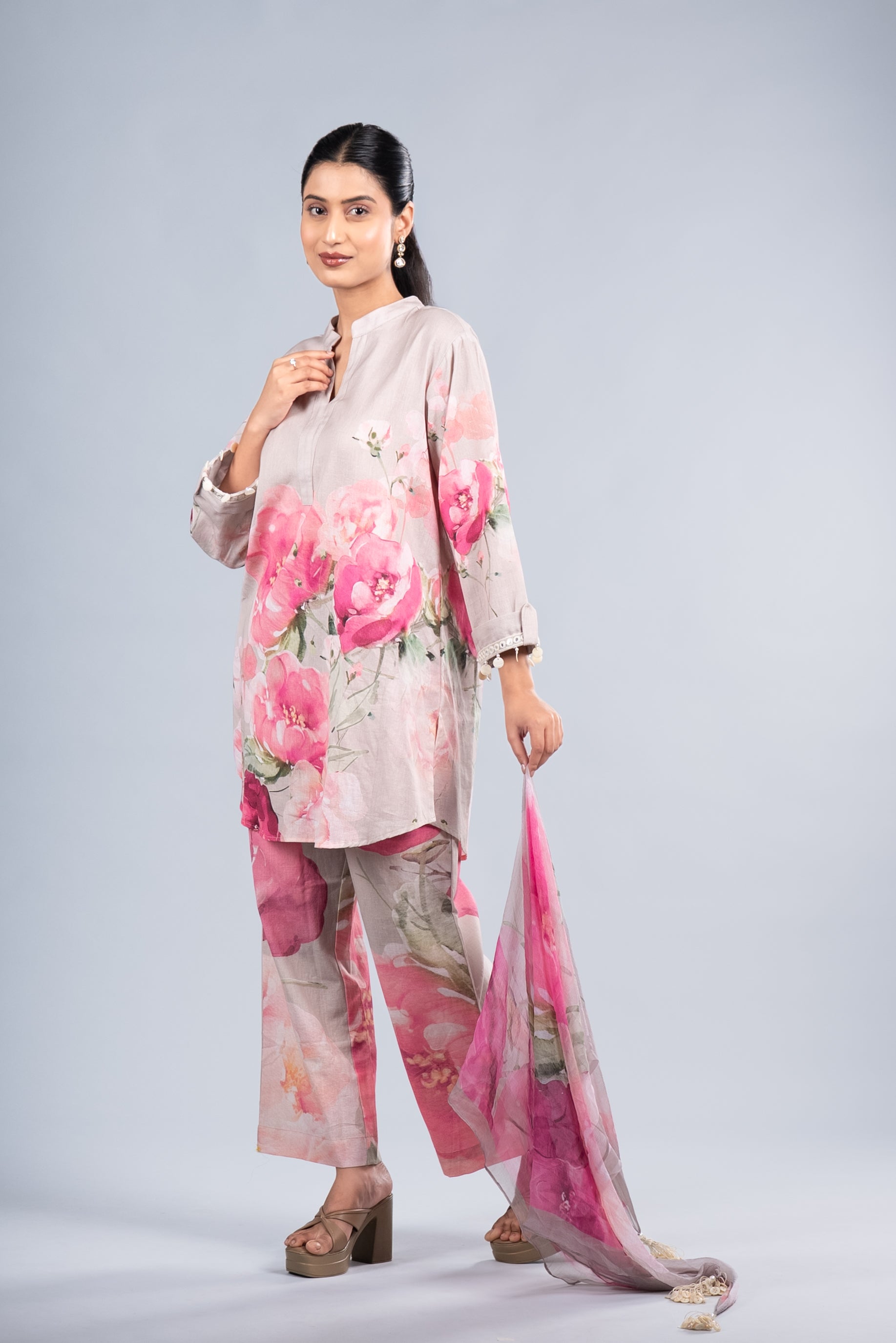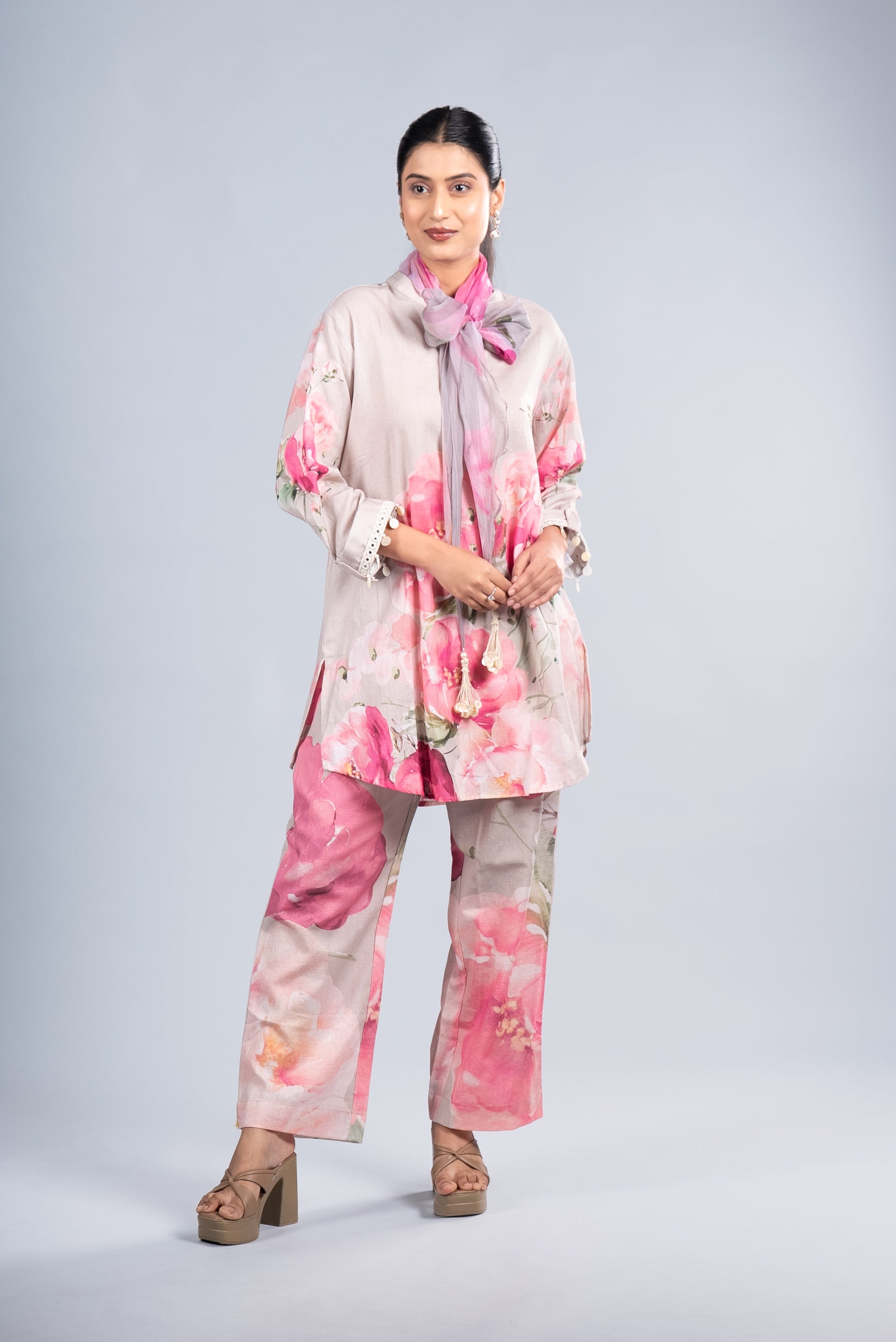 A refreshing misty pearl co-ord set adorned with blooming pink florals, paired with a matching scarf. Perfect for brunch outings, day events, and elegant summer gatherings
