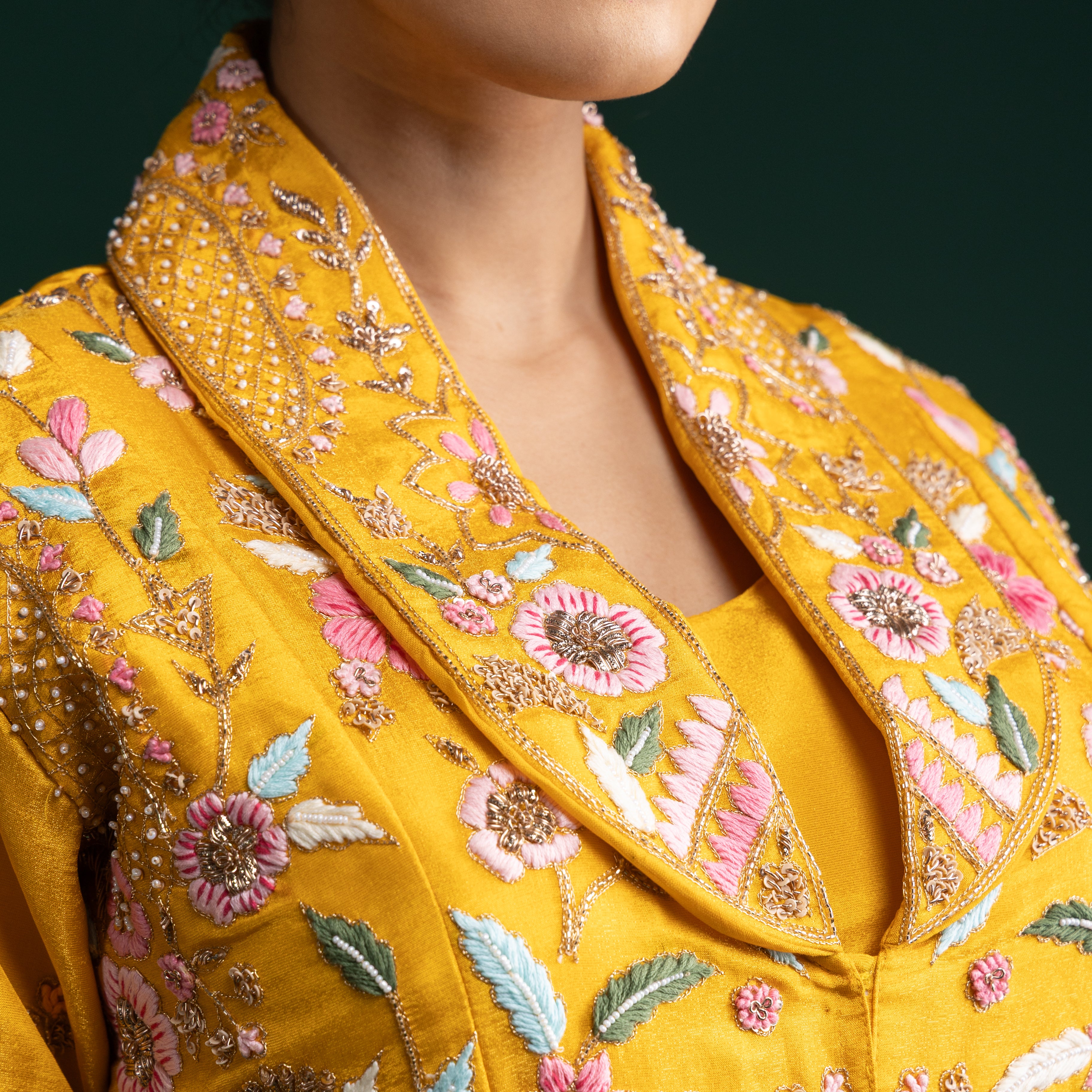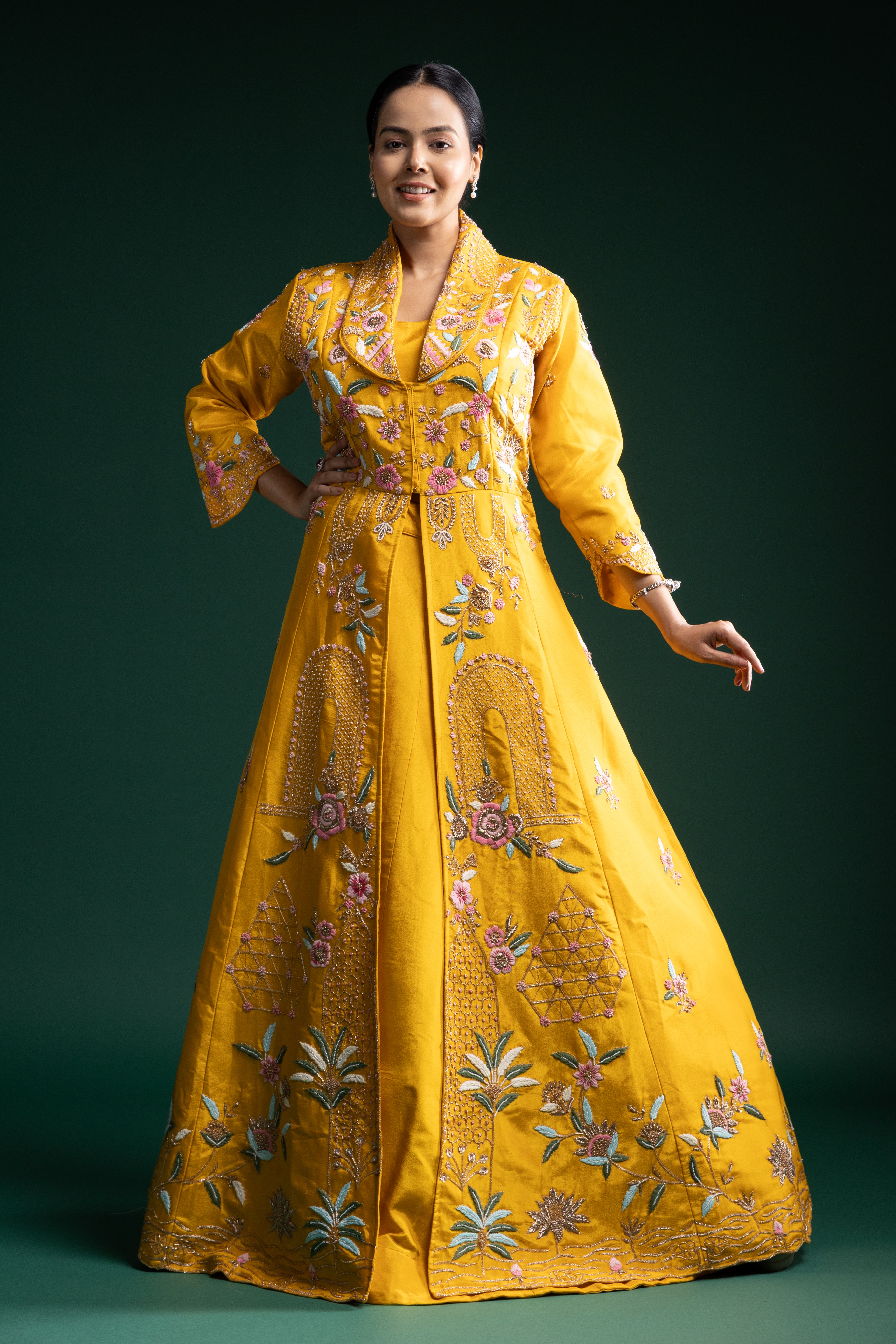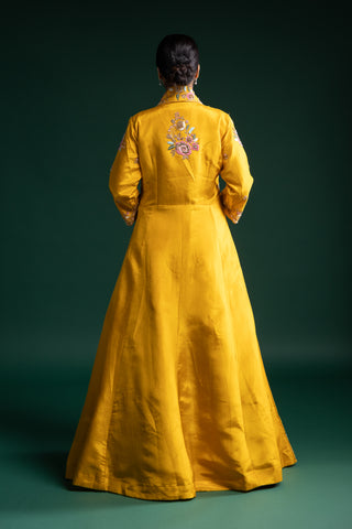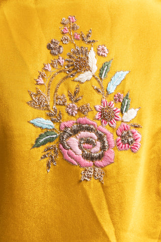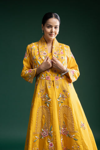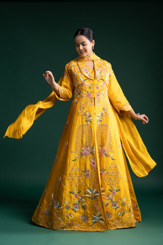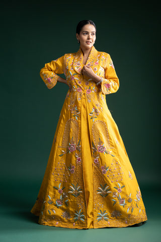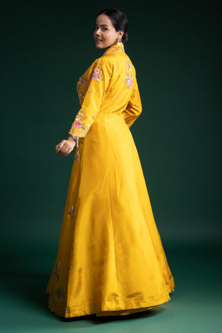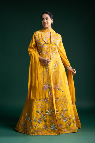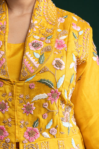 "Mustard Yellow Silk Jacket Lehenga with Multicolour Thread and Sequin Floral Embroidery"