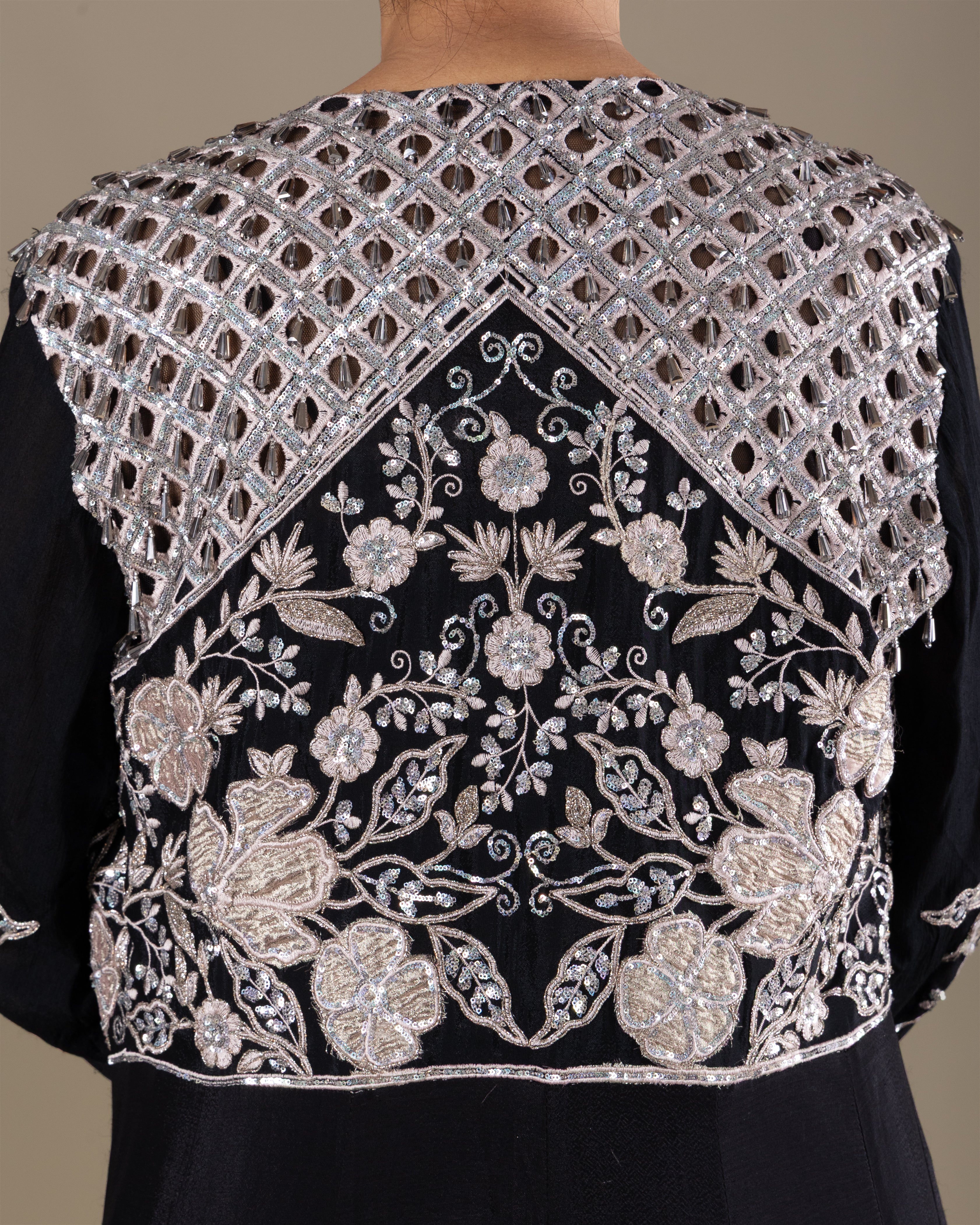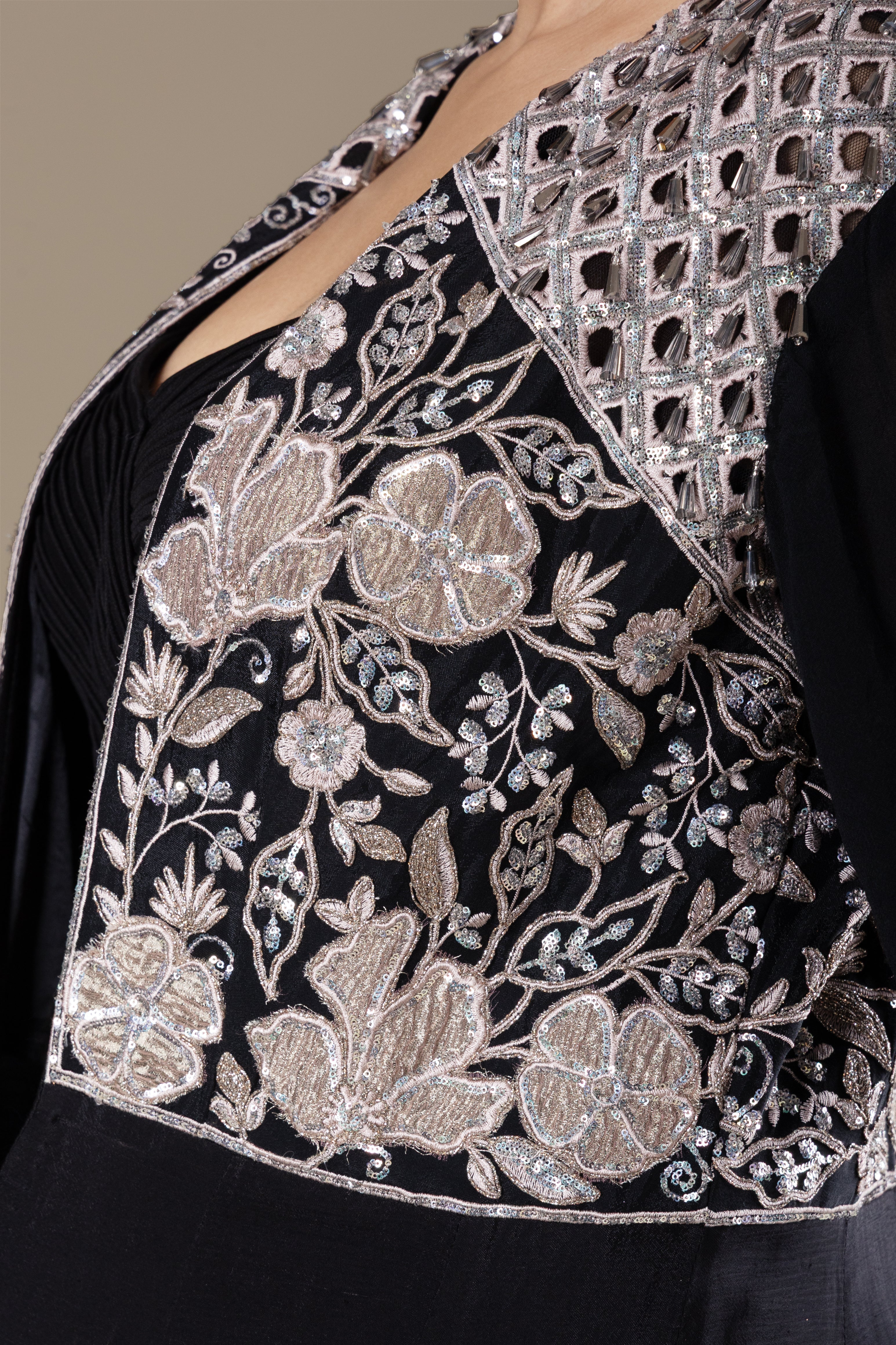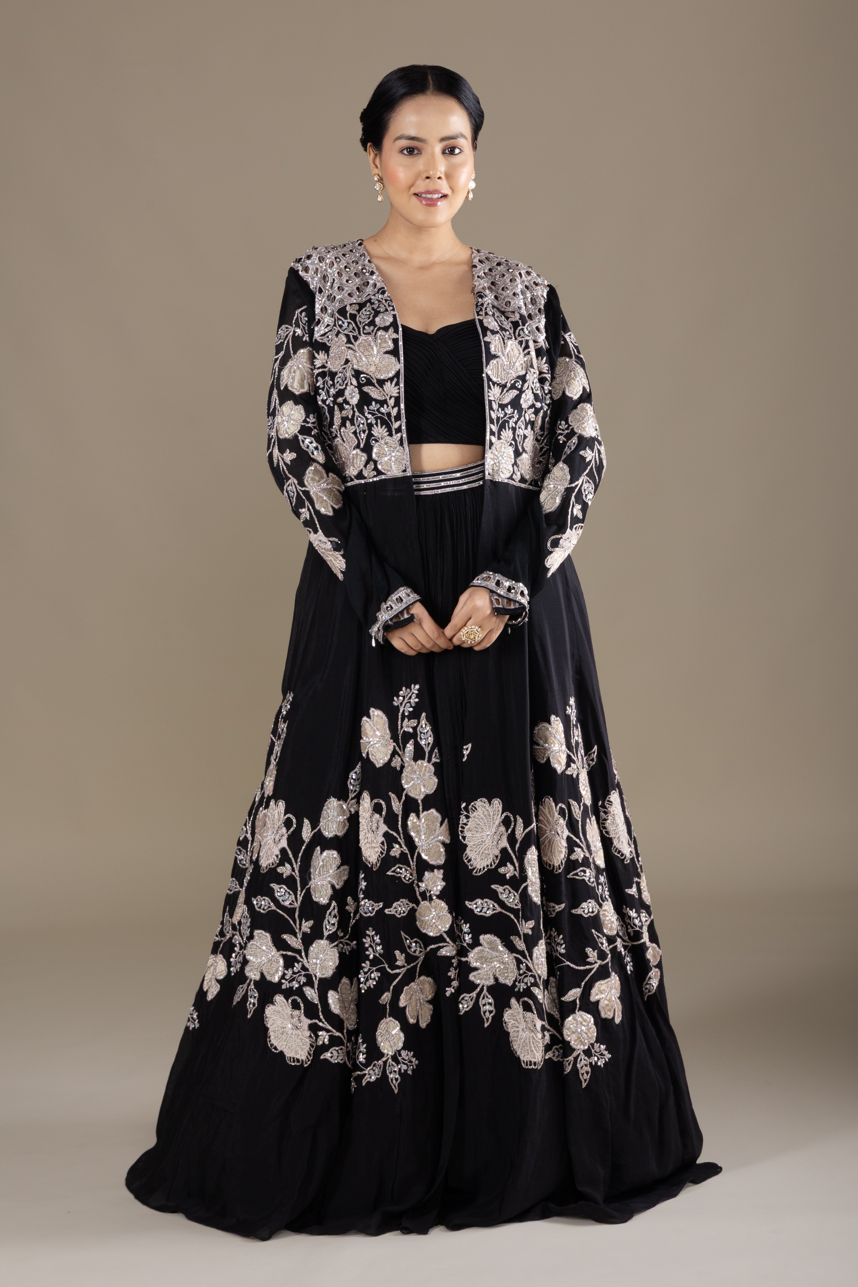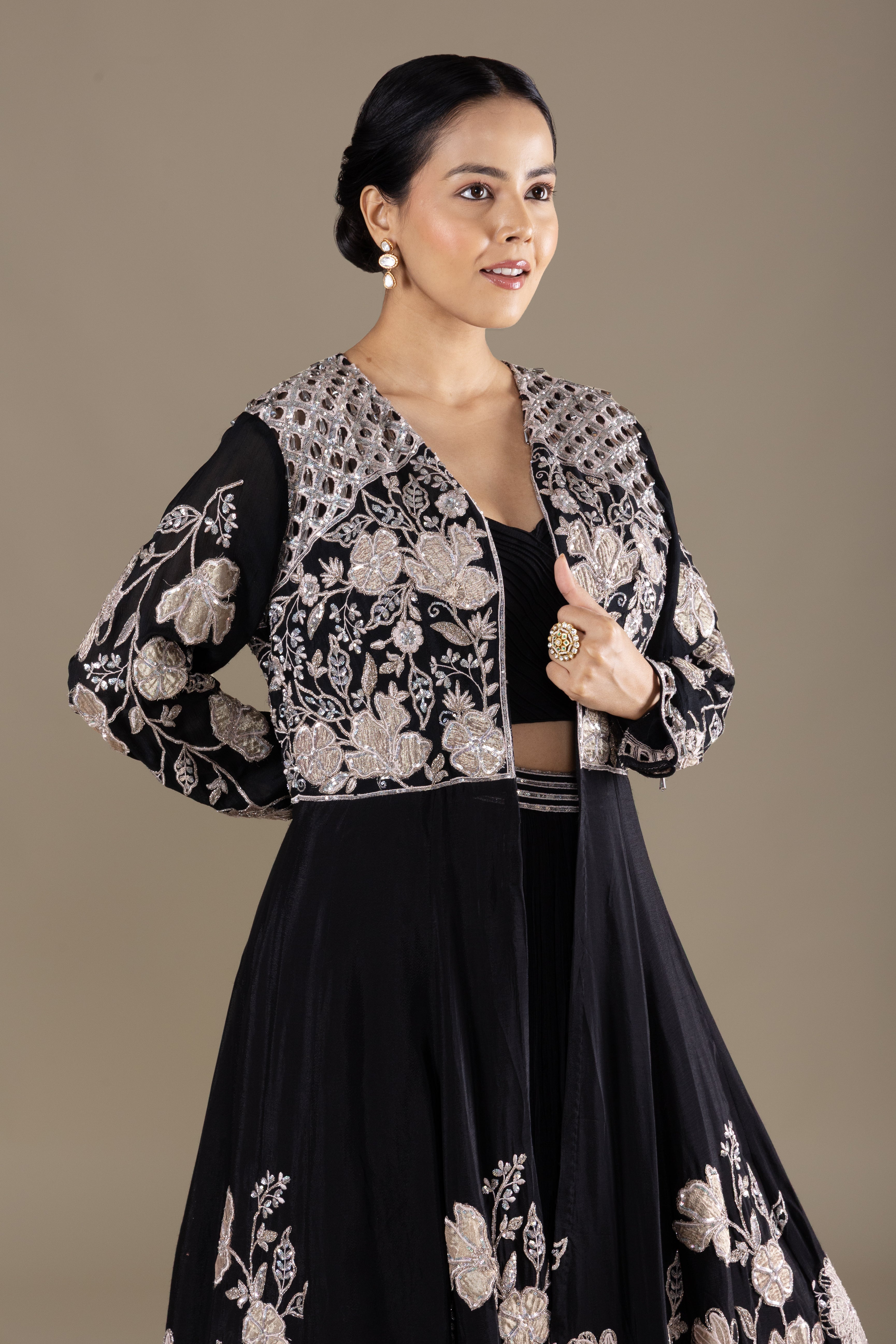 Strike a bold statement with this onyx black lehenga, featuring intricate silver floral embroidery and a structured jacket, blending elegance with a modern Indo-western twist.