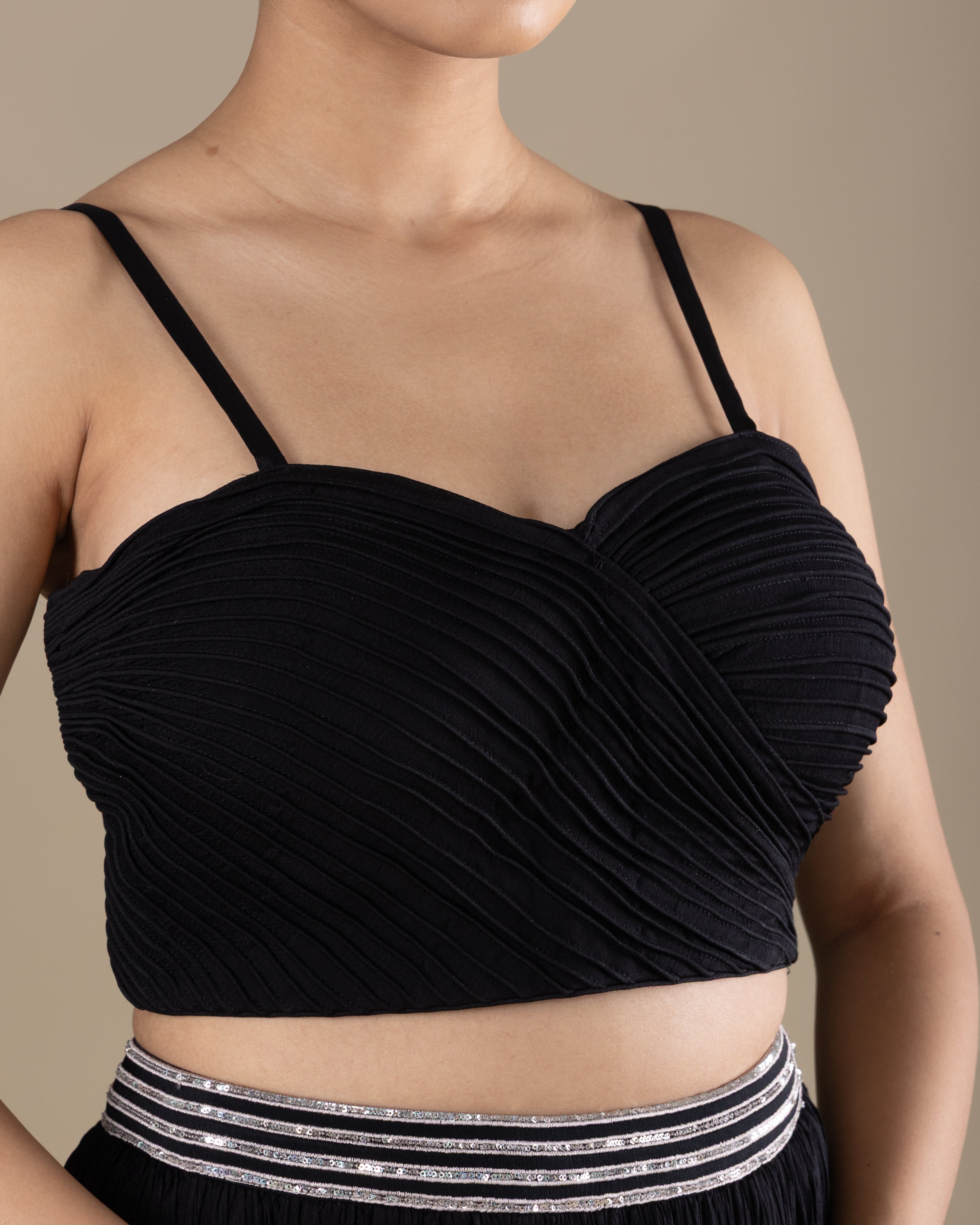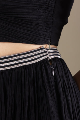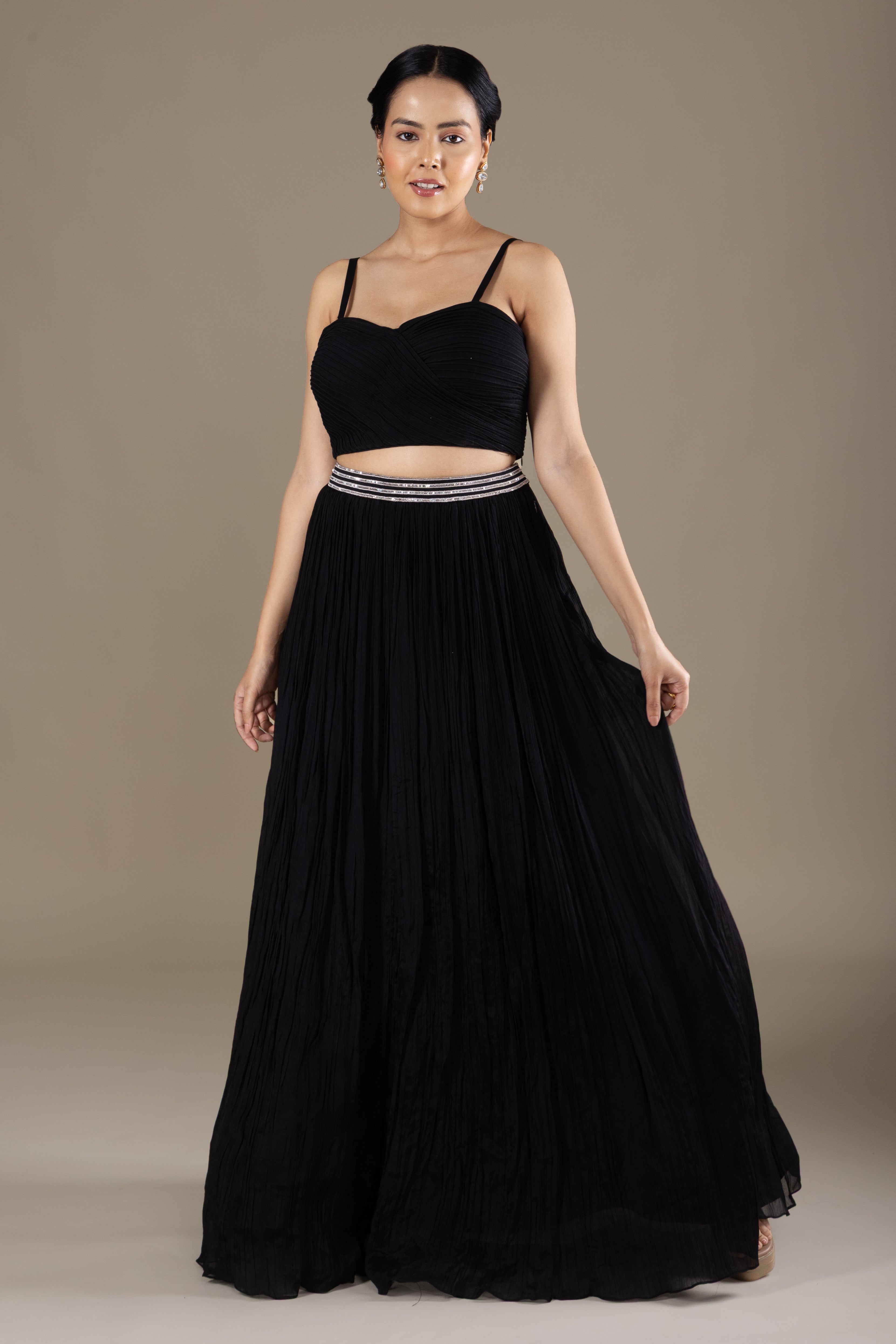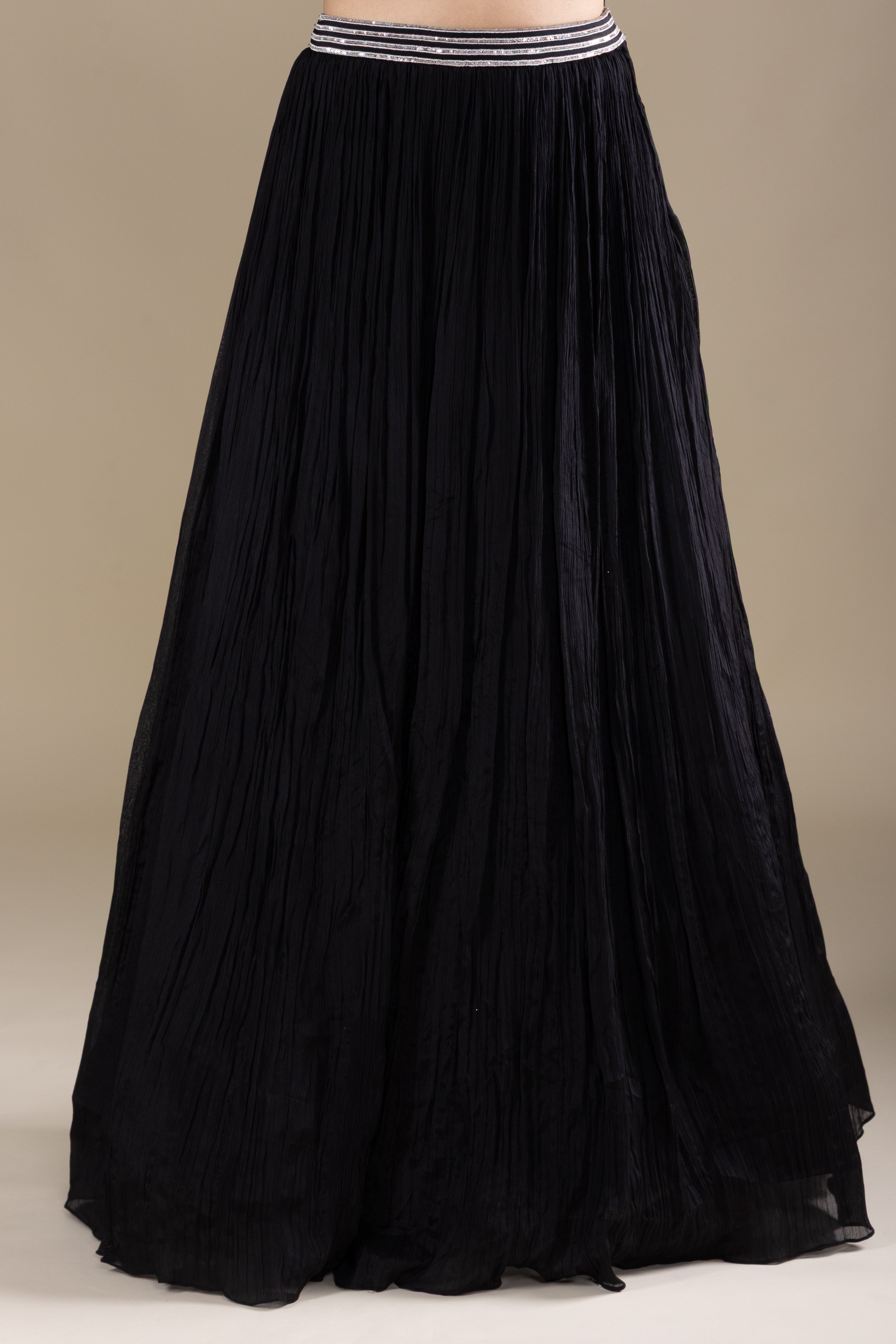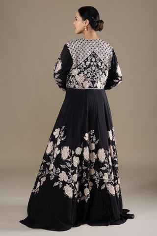 Strike a bold statement with this onyx black lehenga, featuring intricate silver floral embroidery and a structured jacket, blending elegance with a modern Indo-western twist.