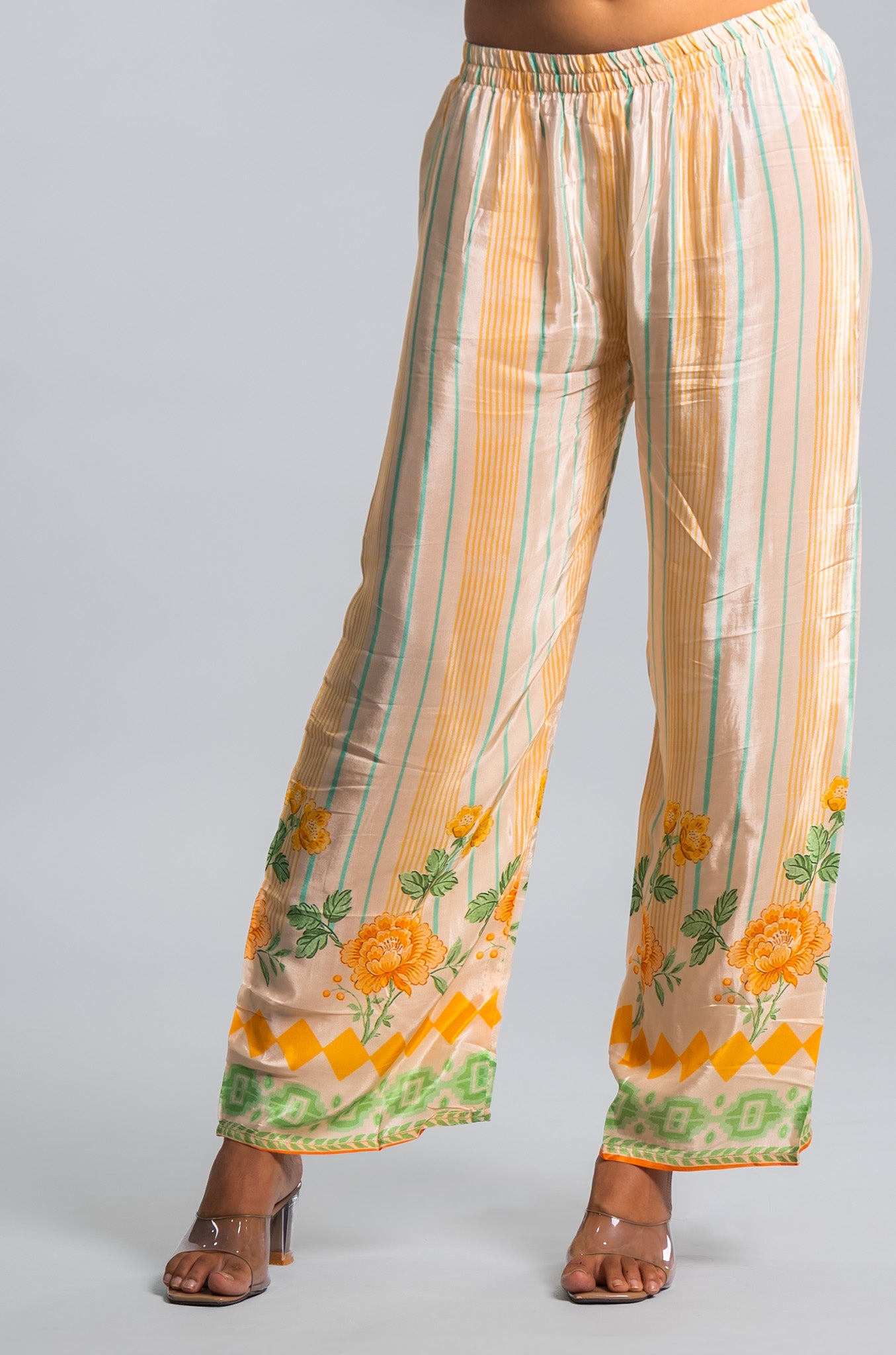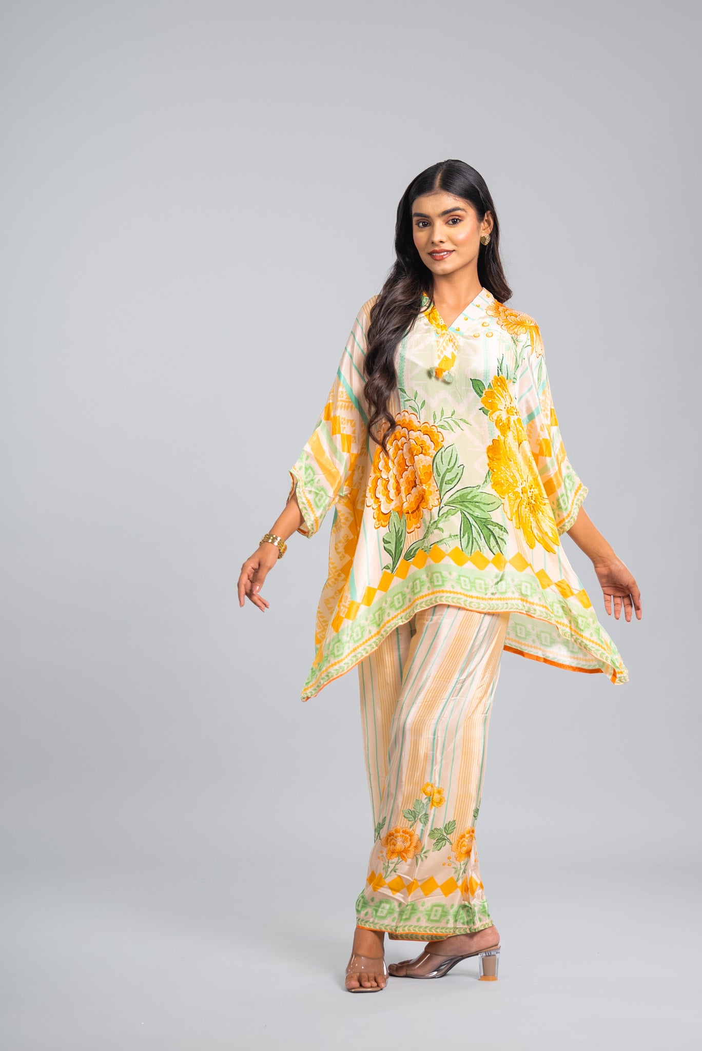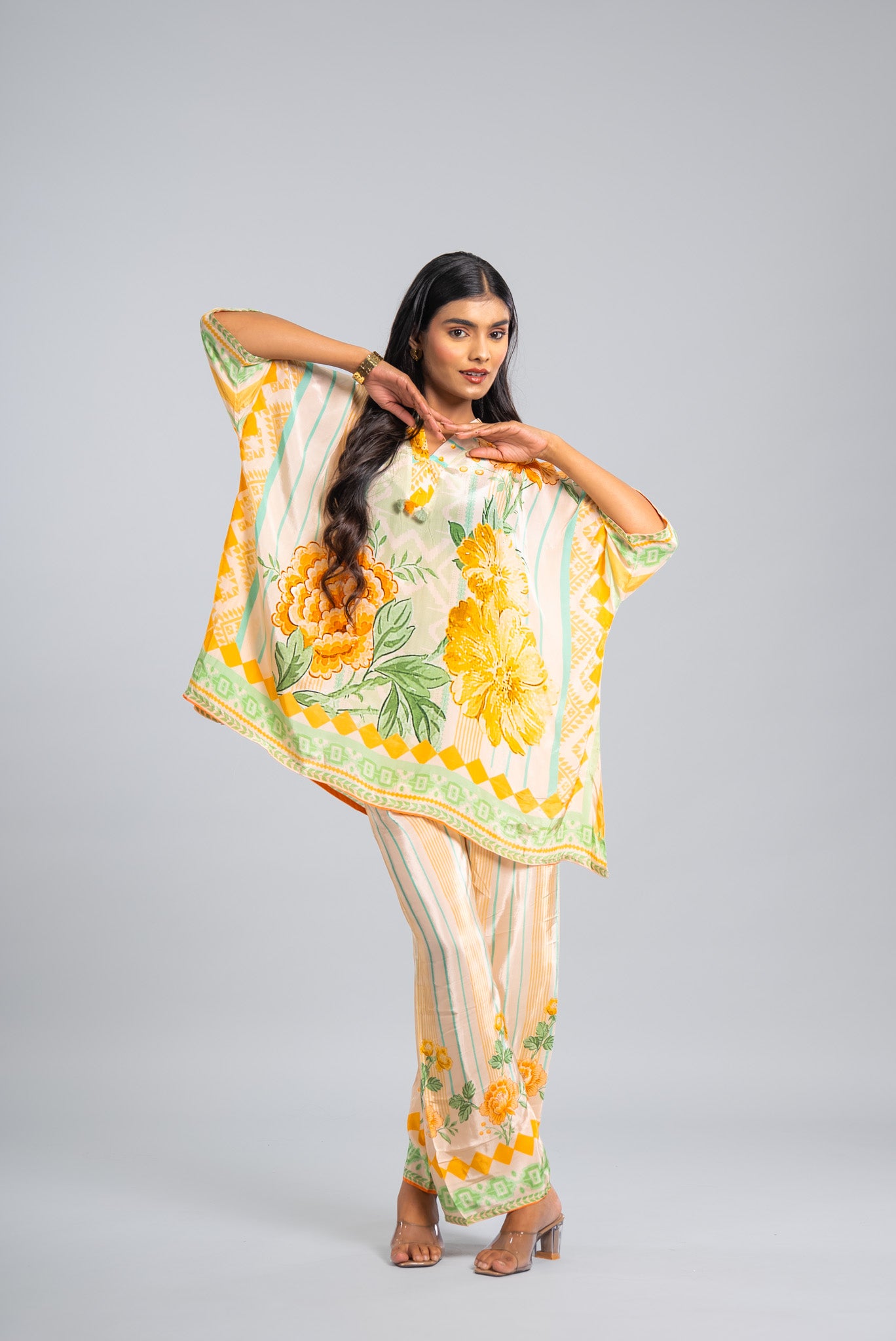 A flowy kaftan-style co-ord set in soothing ivory tones with bright floral prints and handcrafted detailing. Perfect for summer festivities and elegant daywear occasions.