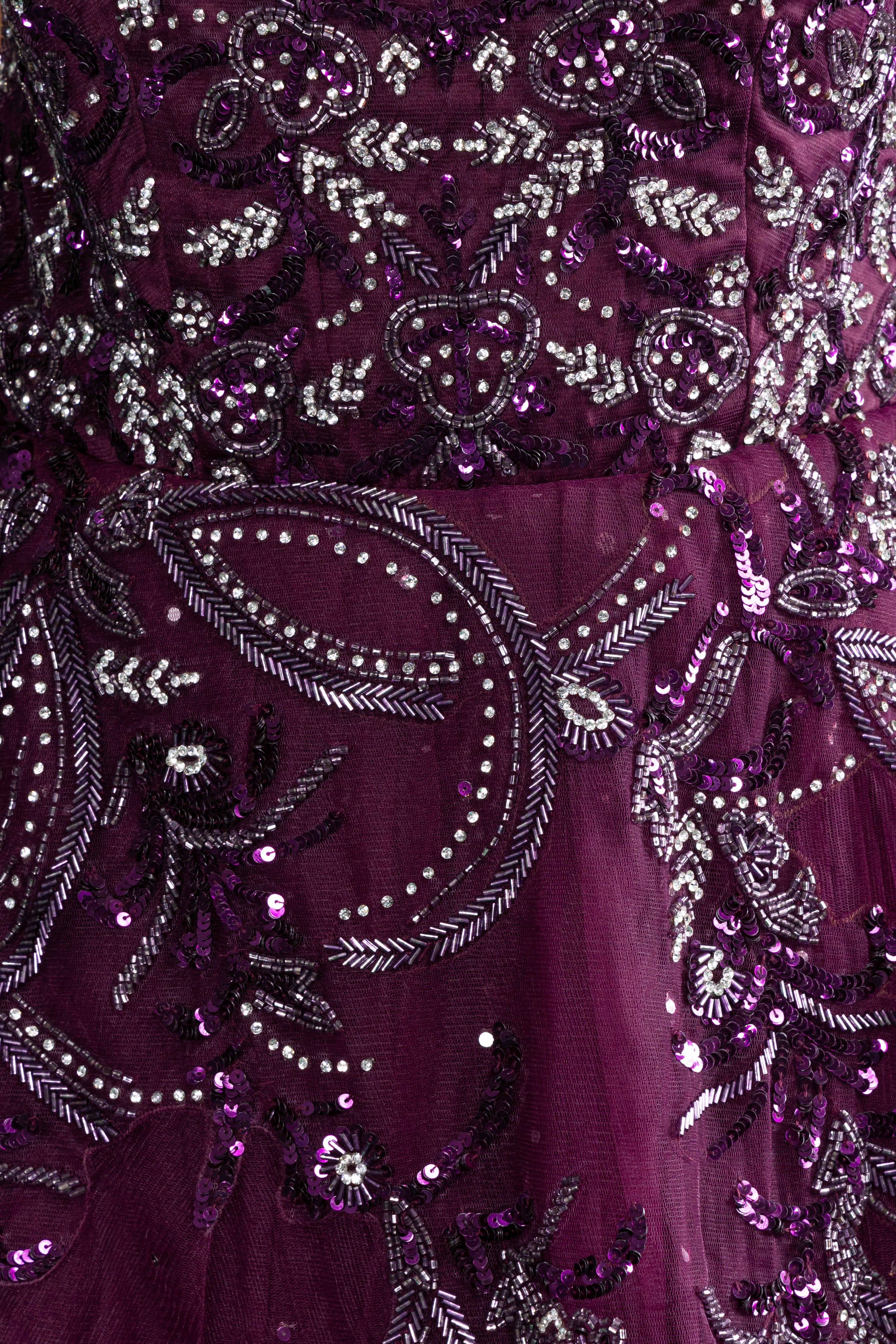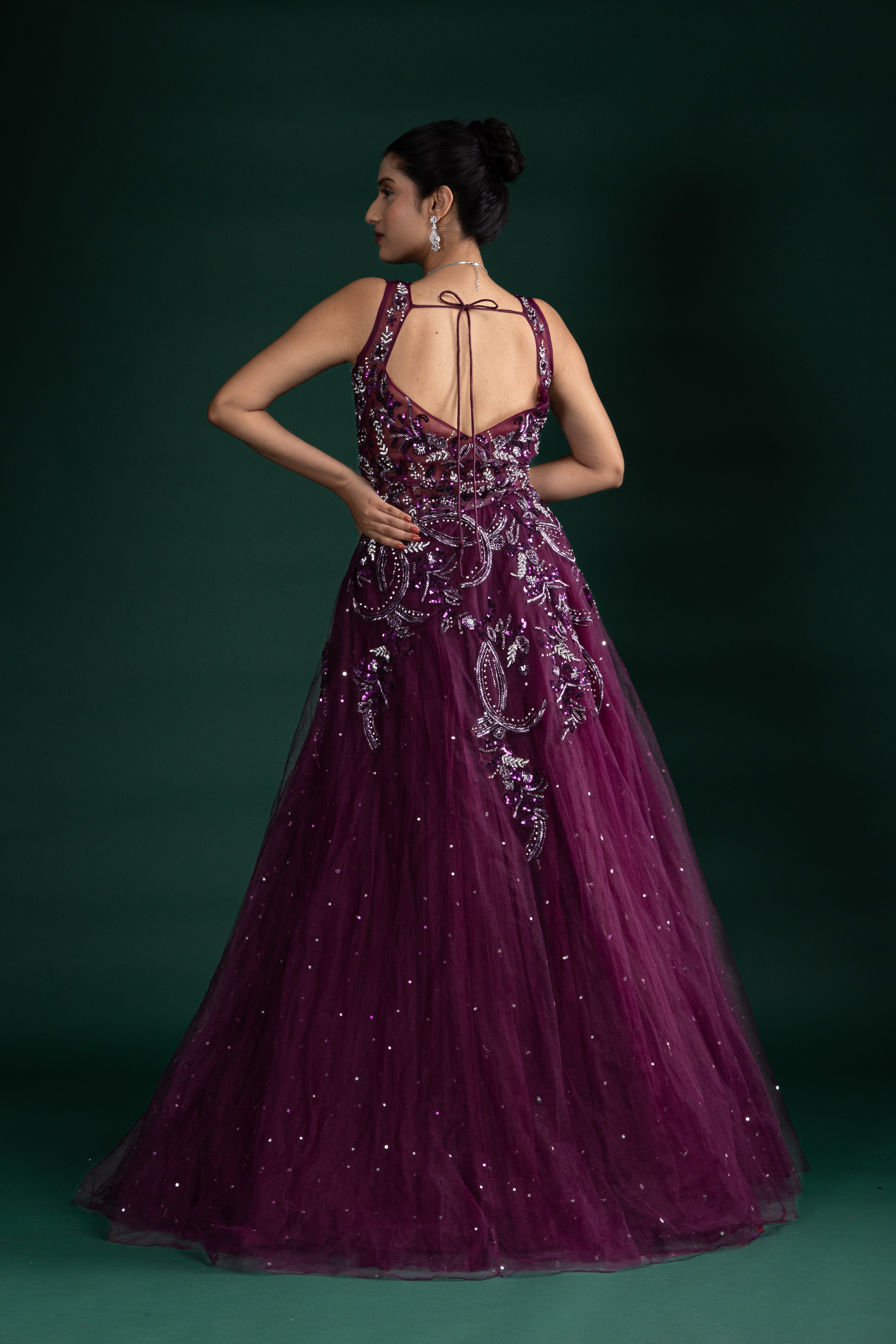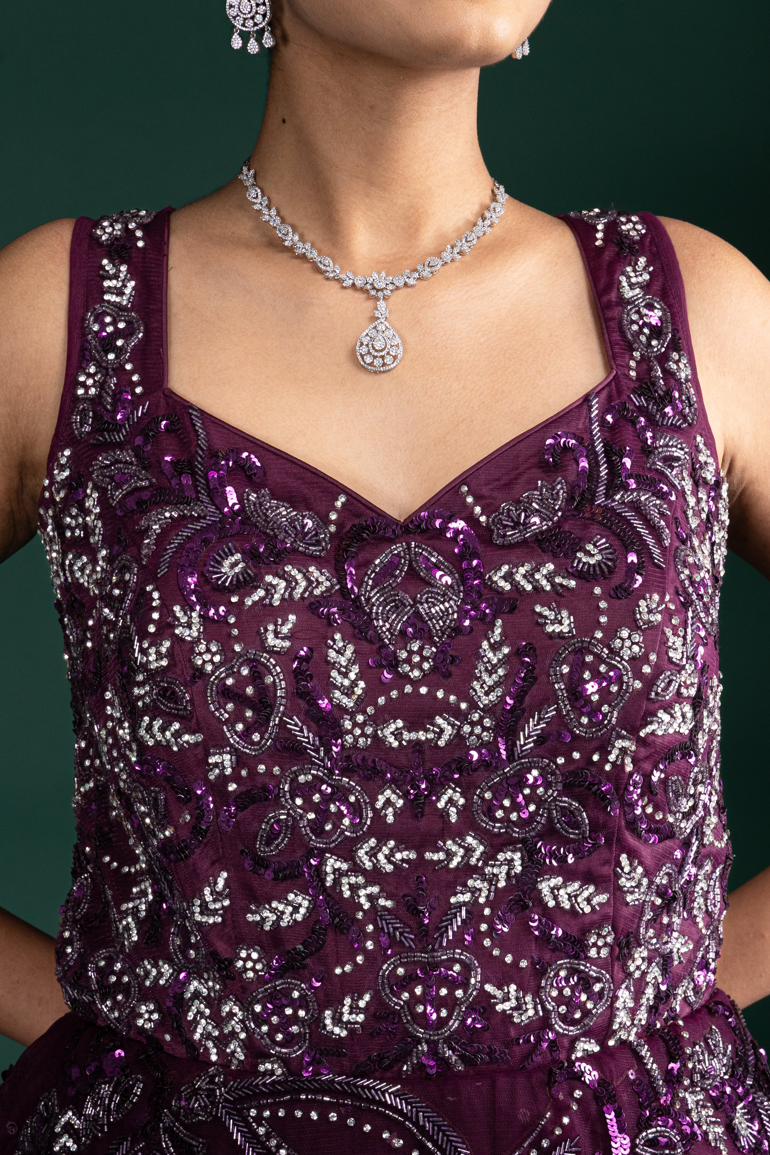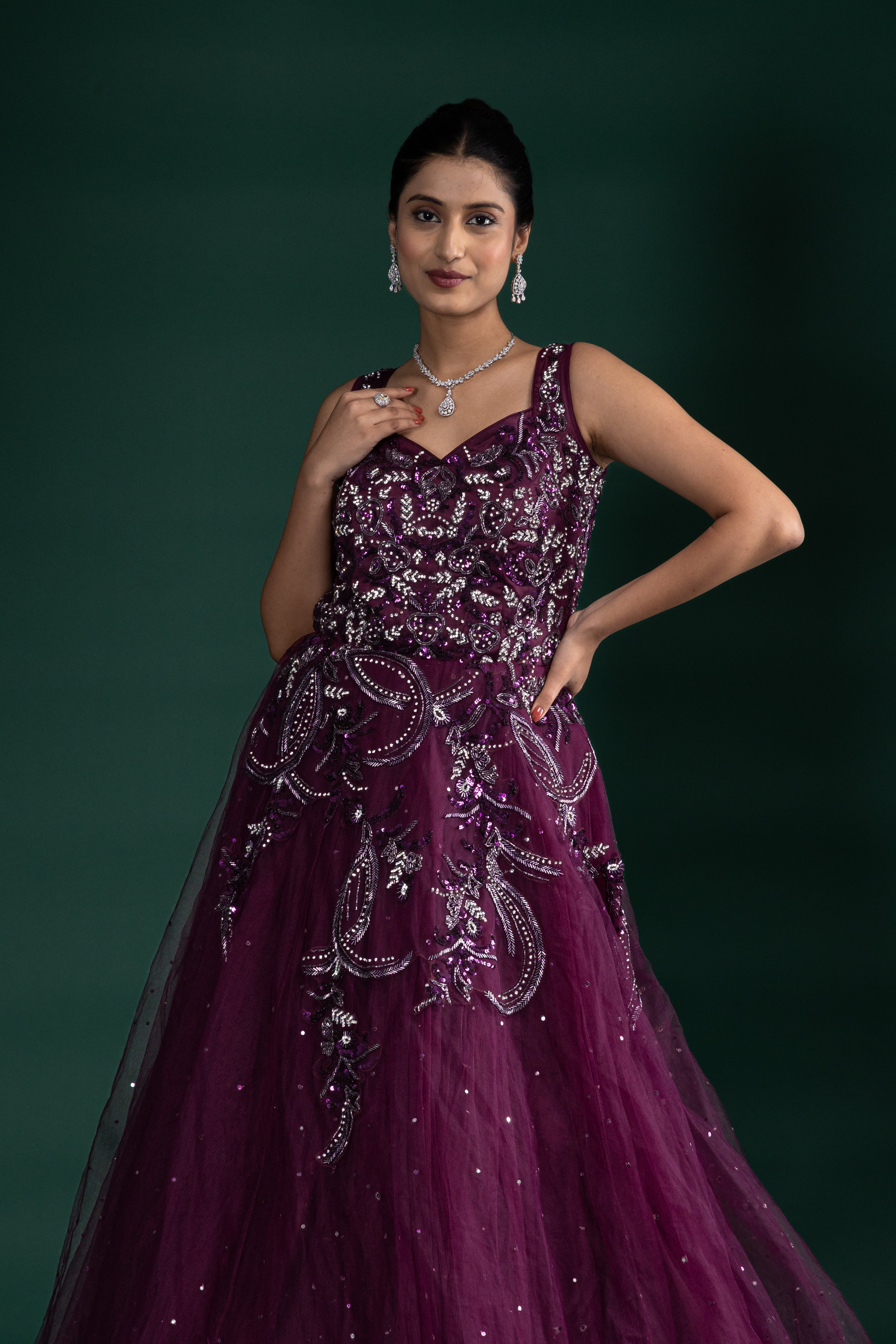 Step into regal charm with this deep amethyst gown featuring all-over sequin embroidery, beadwork, and floral patterns. The rich shade brings dramatic evening glamour.