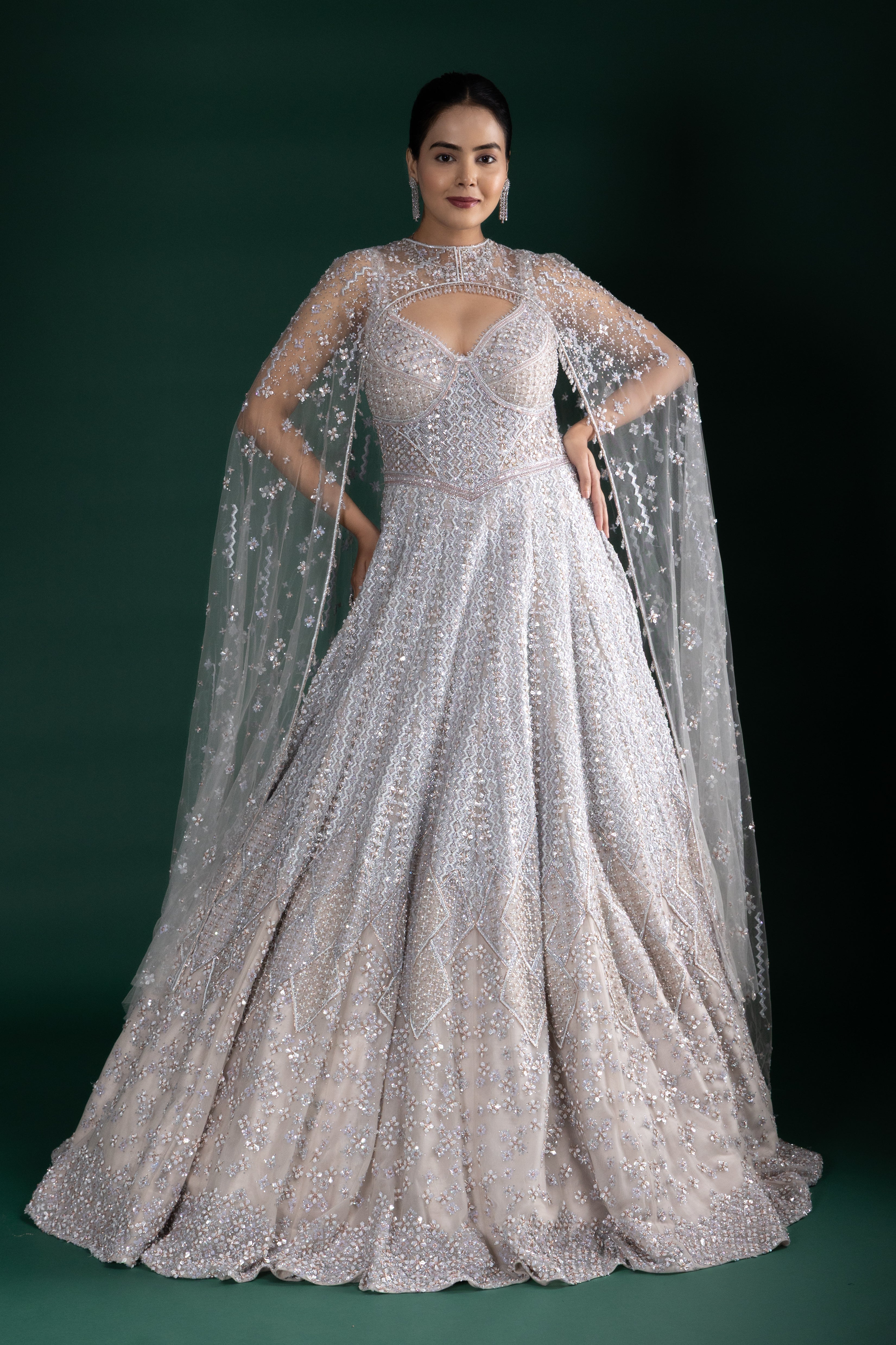 Silver Grey Cape Style Gown with Cutwork Bodice