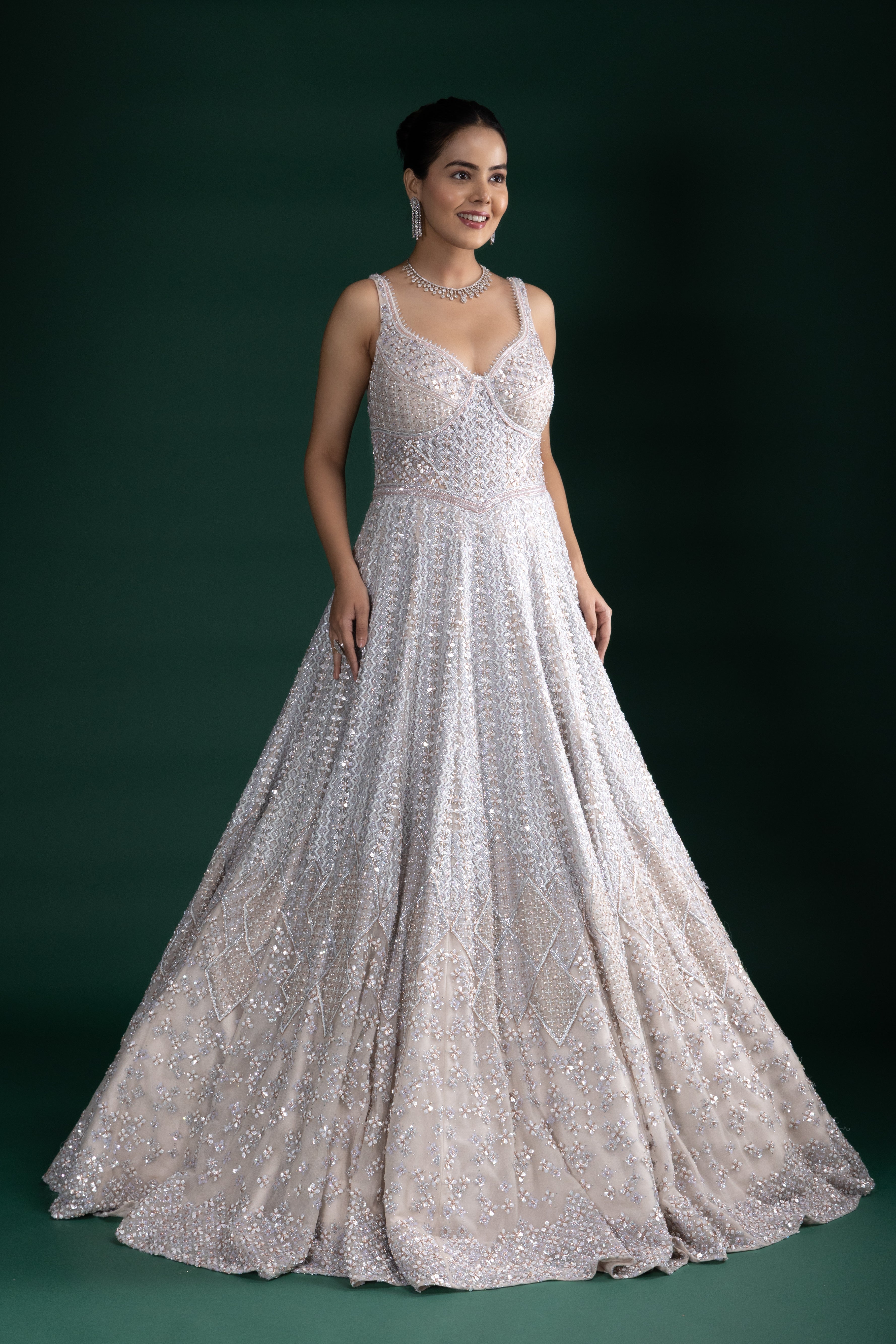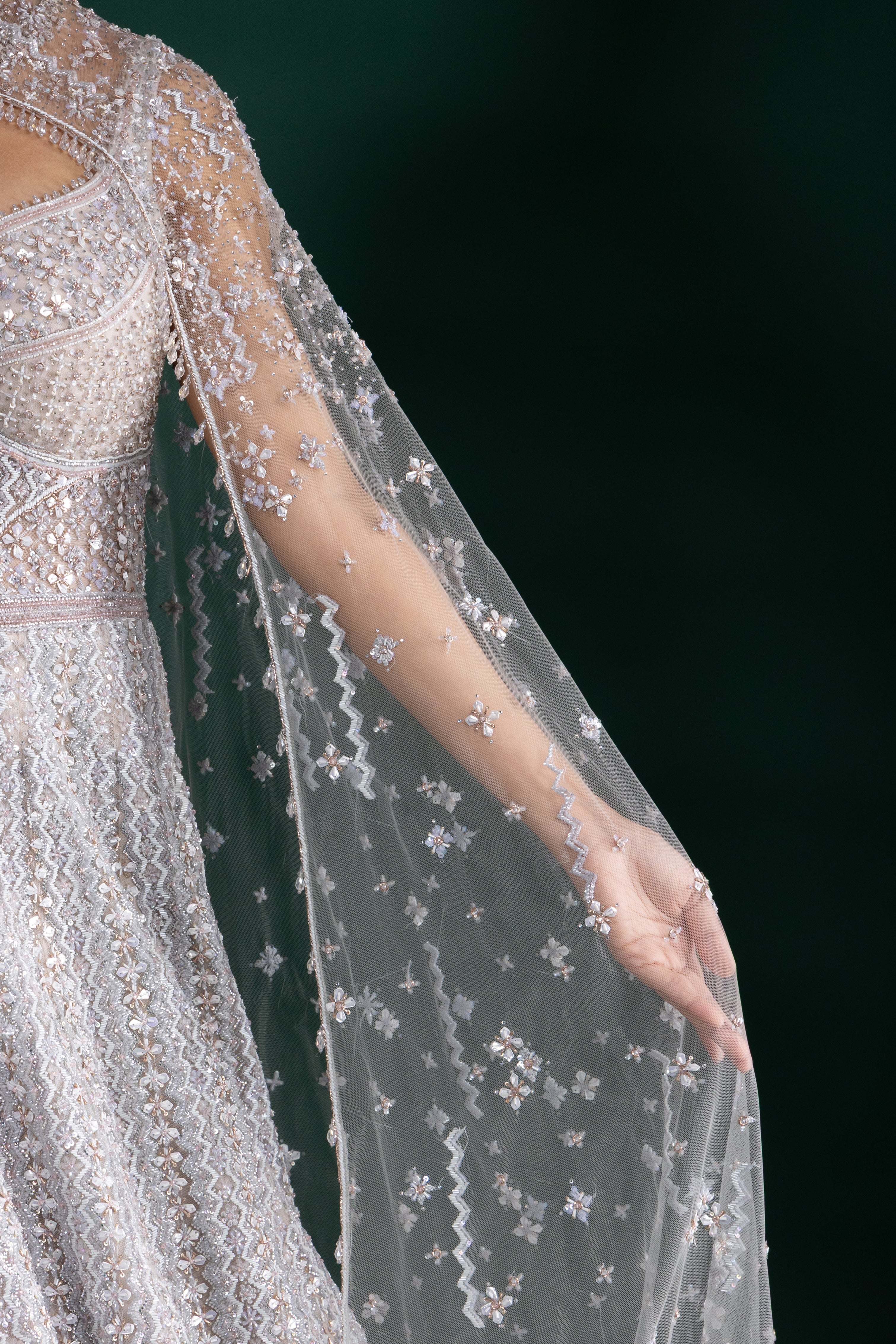 A statement-making silver grey gown with cape-style sleeves and delicate cutwork on the bodice. Covered in shimmering sequins, this gown spells modern-day royalty for your next event.