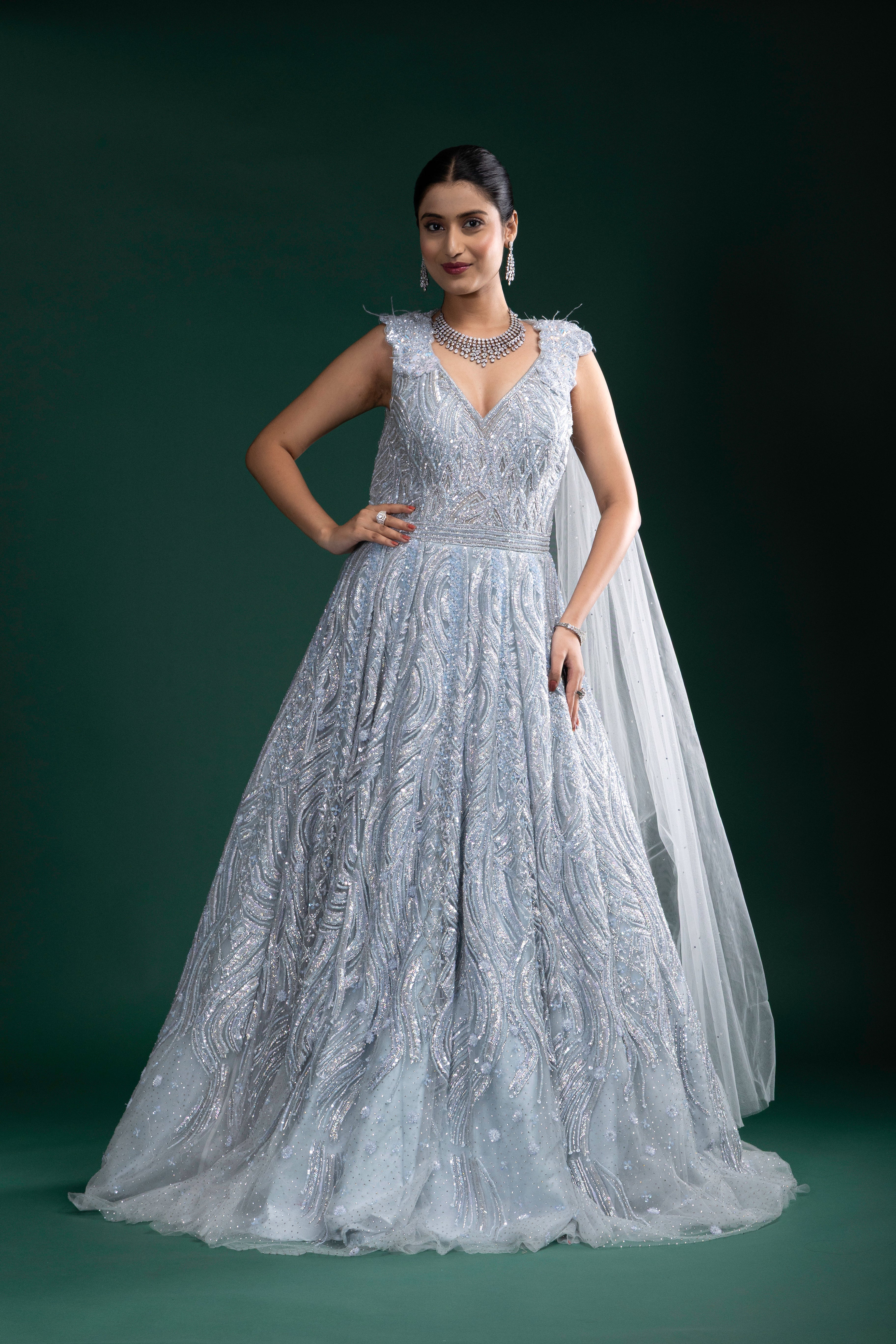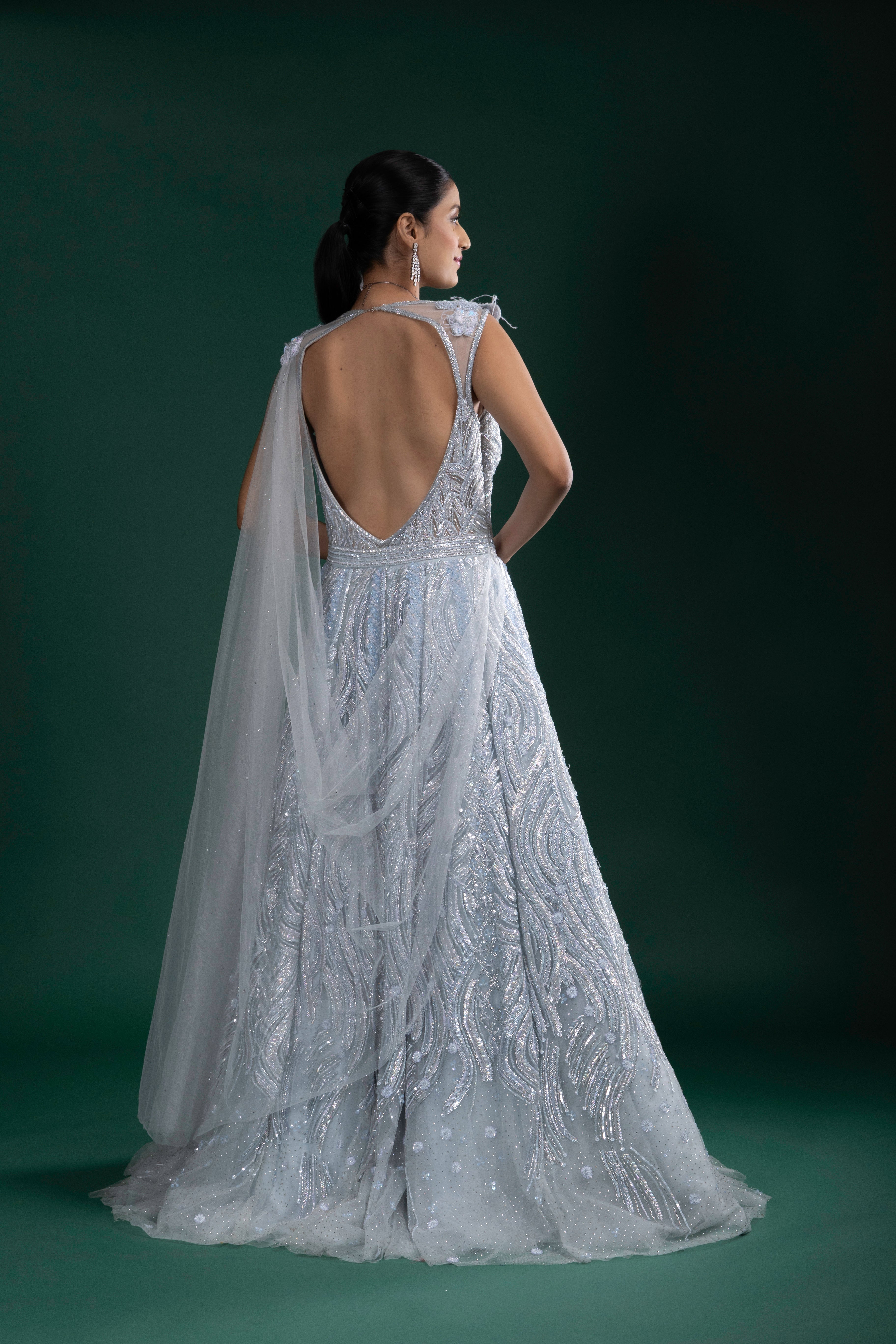 Silver Grey Sleeveless Gown with Sequins and Net Dupatta