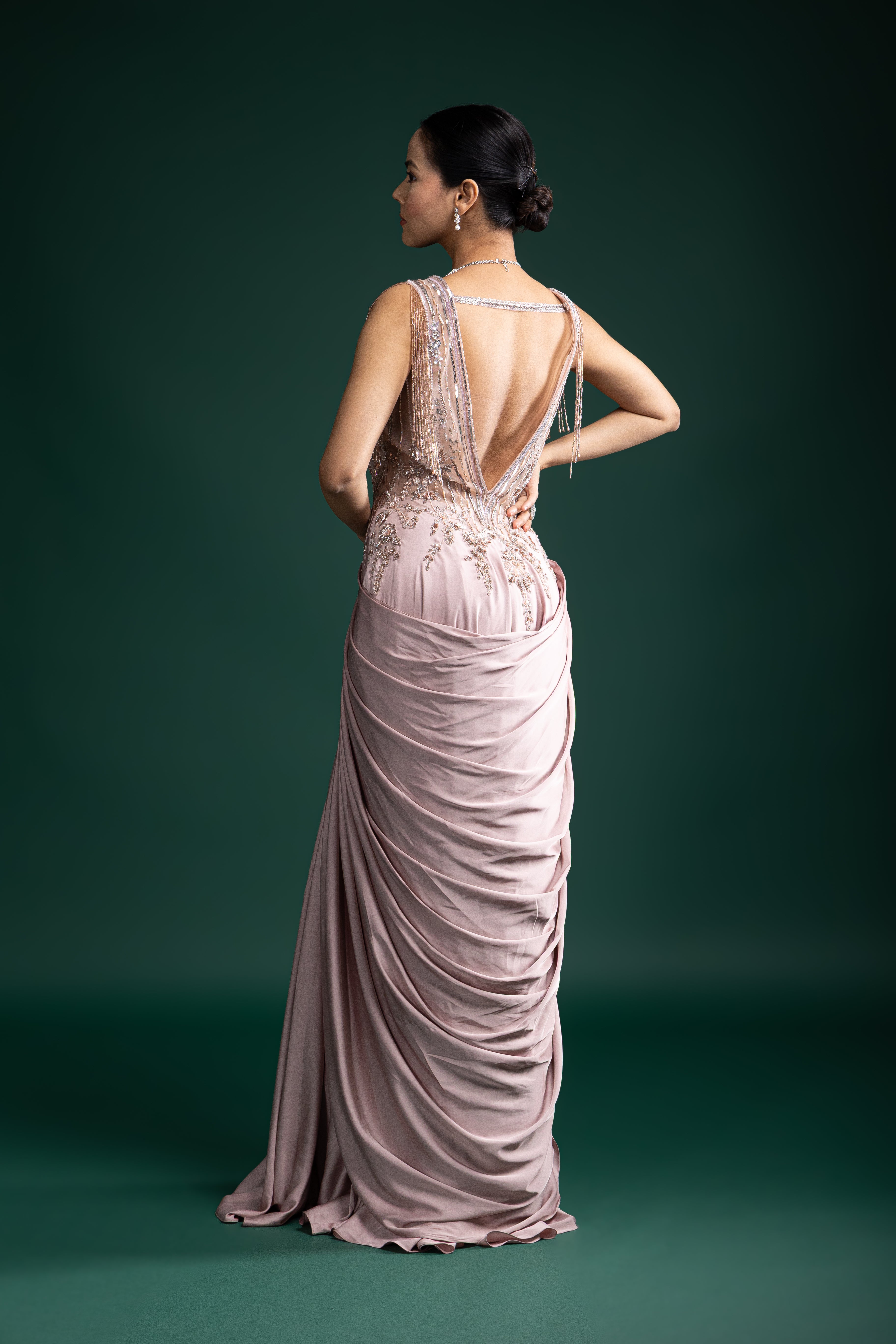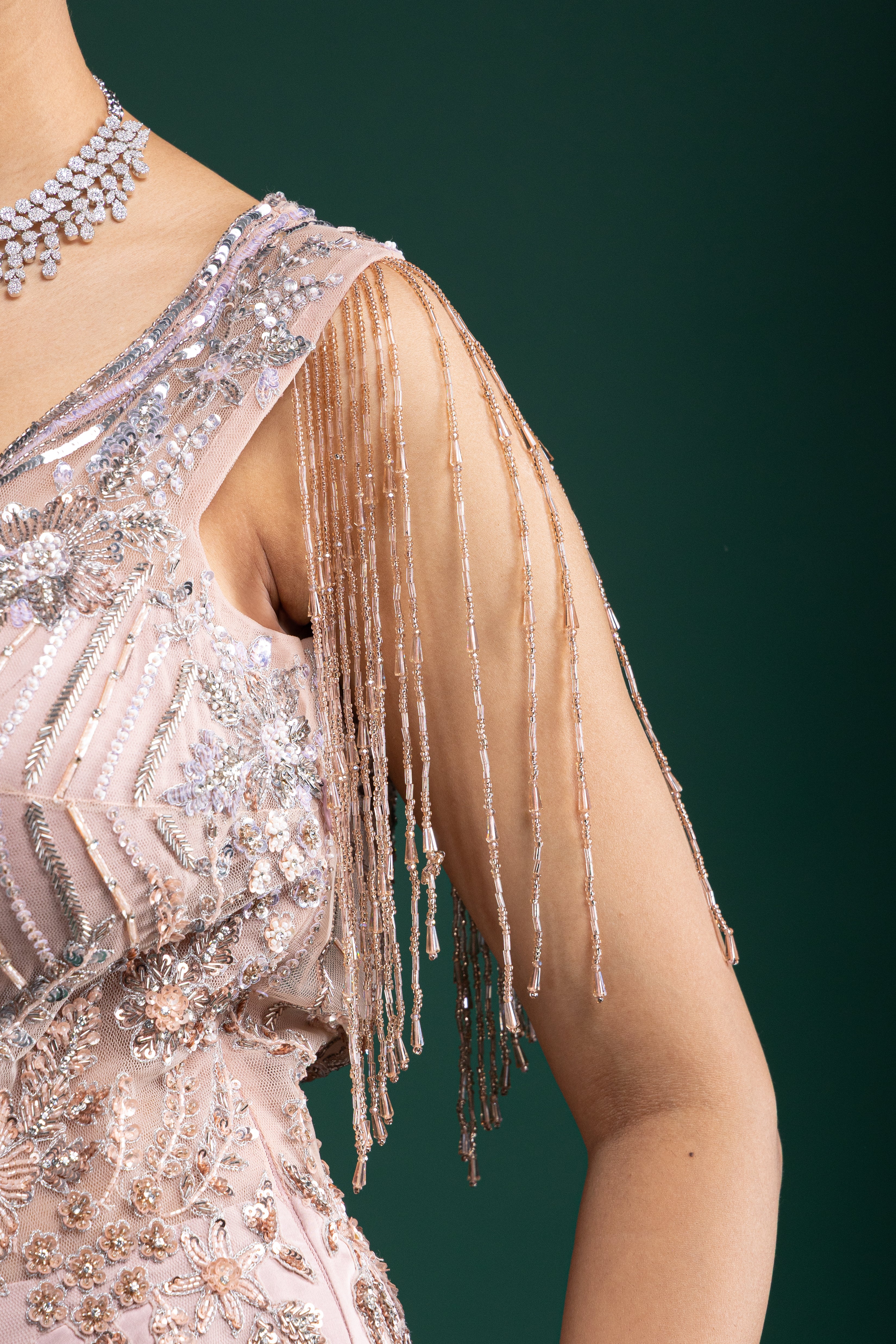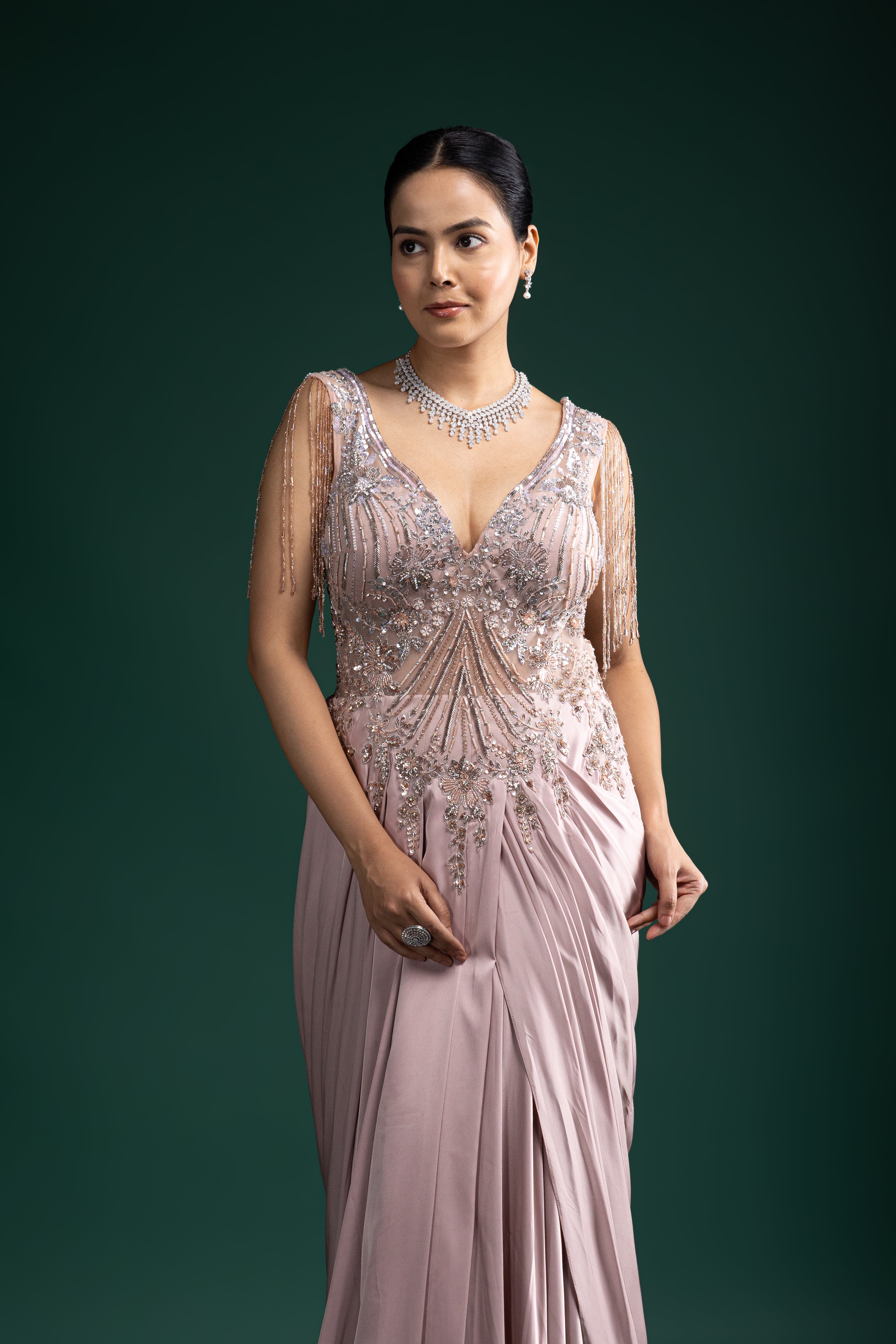 Make a stunning statement in this Rosy Mauve Glamour gown, featuring heavy sequin work, beaded fringe sleeves, and a flattering draped silhouette. Perfect for cocktail nights and glam receptions.
