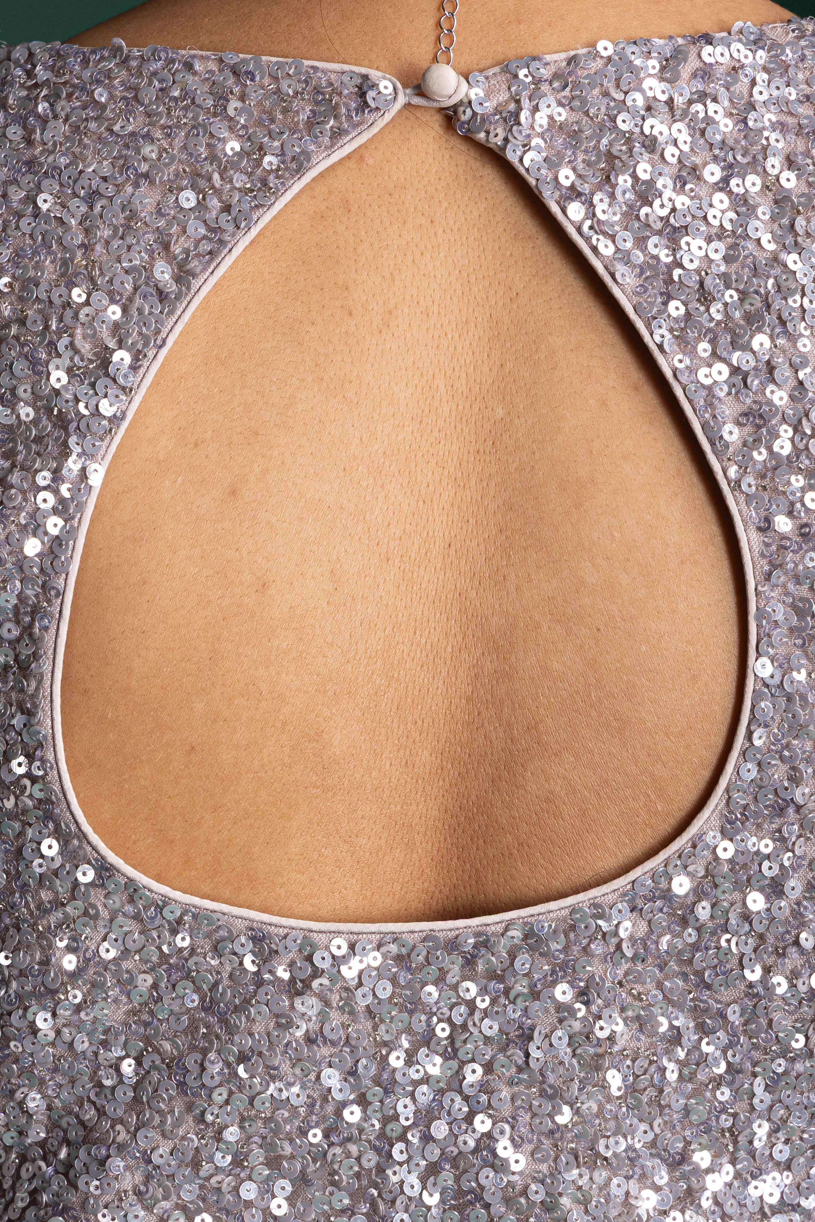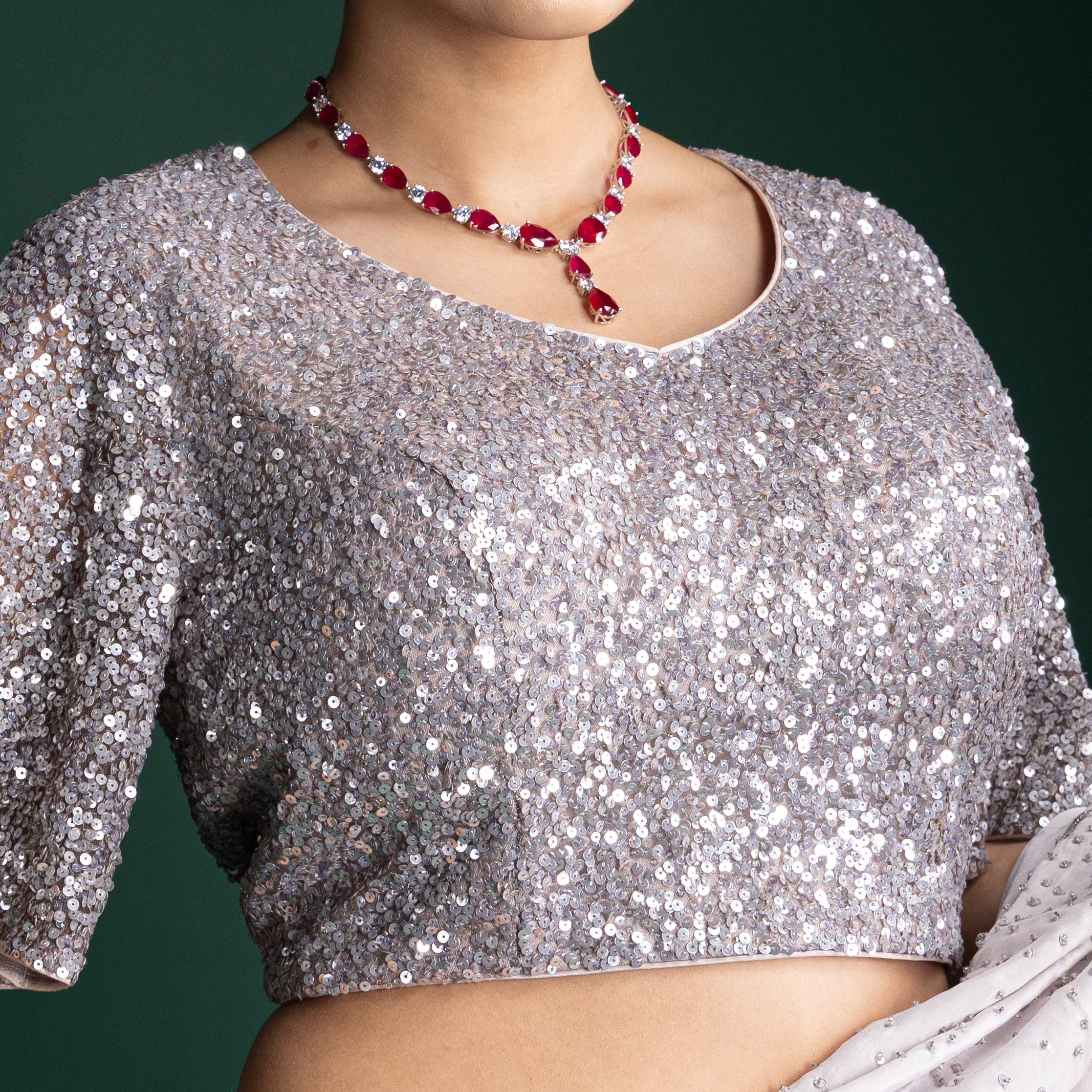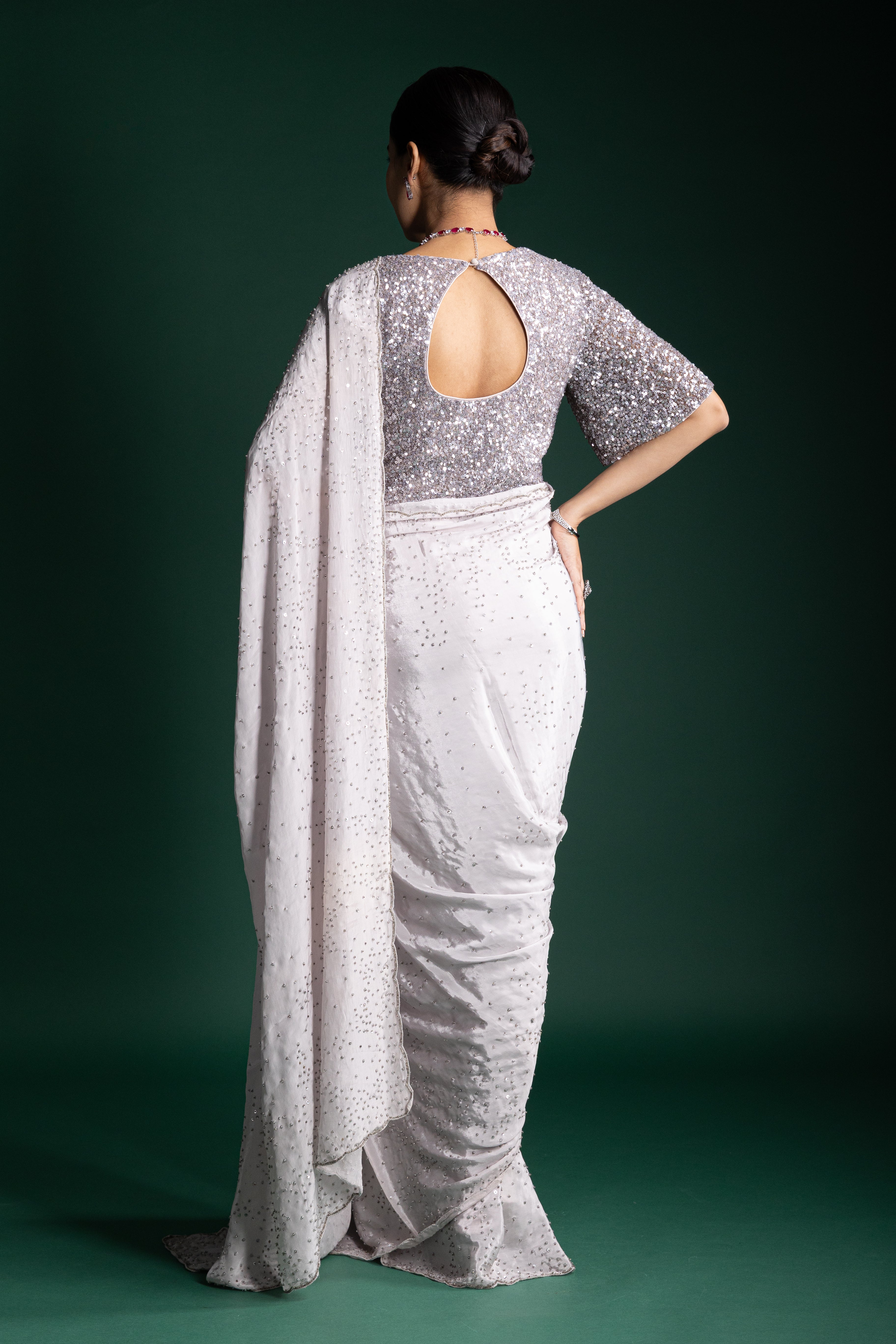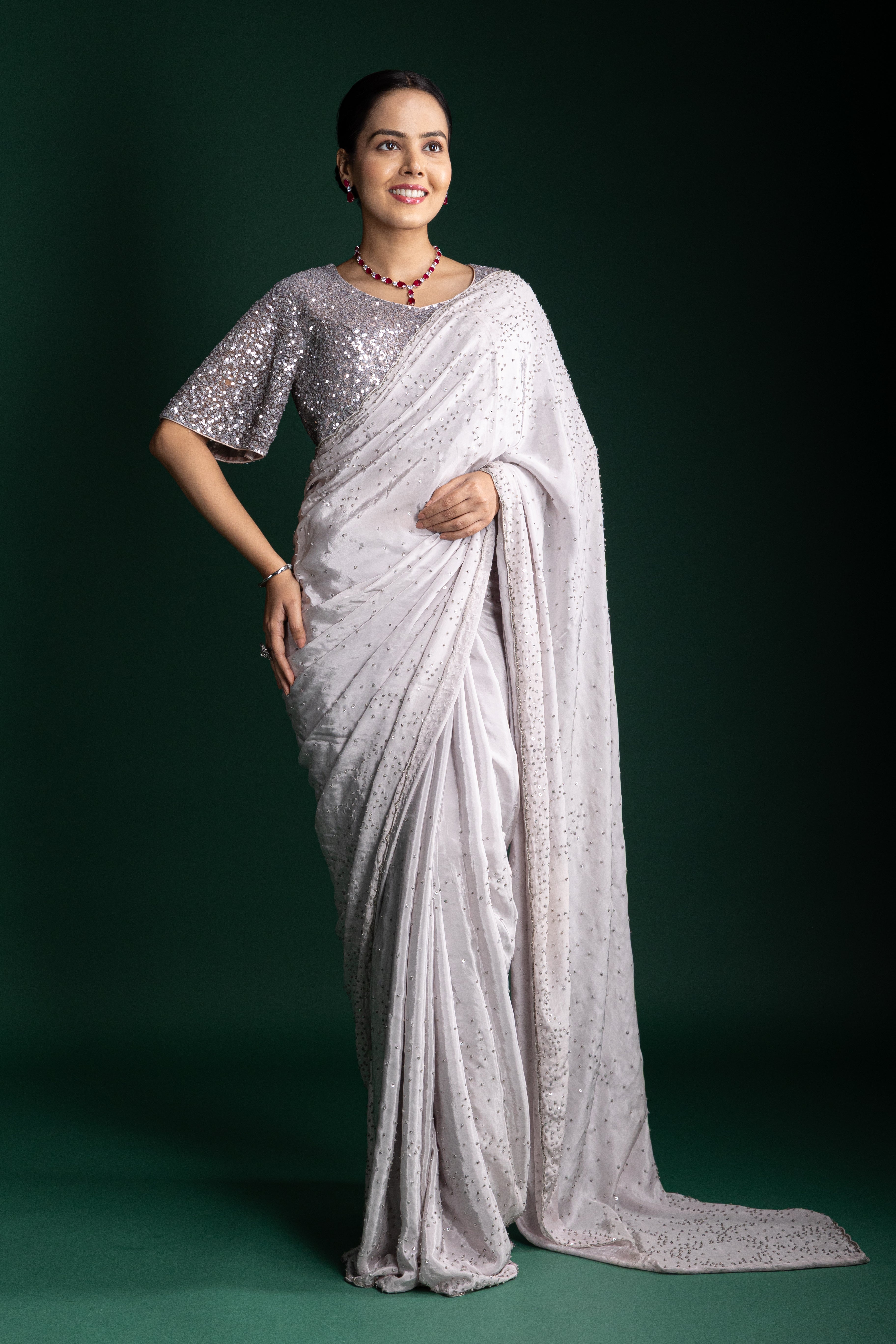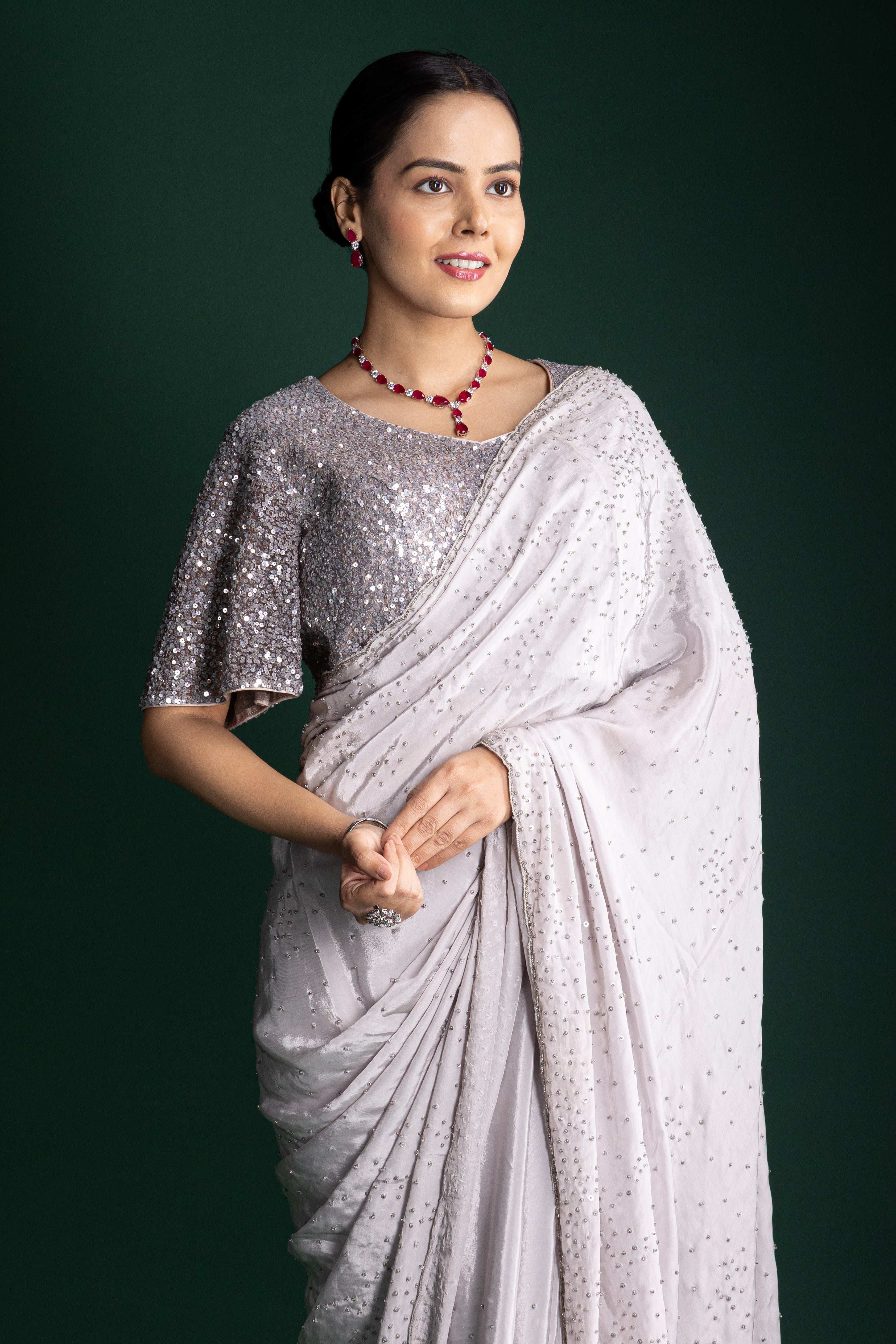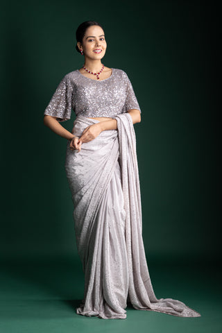 A sophisticated silver grey saree with all-over sequin embellishments, designed for a modern yet timeless luxury statement.