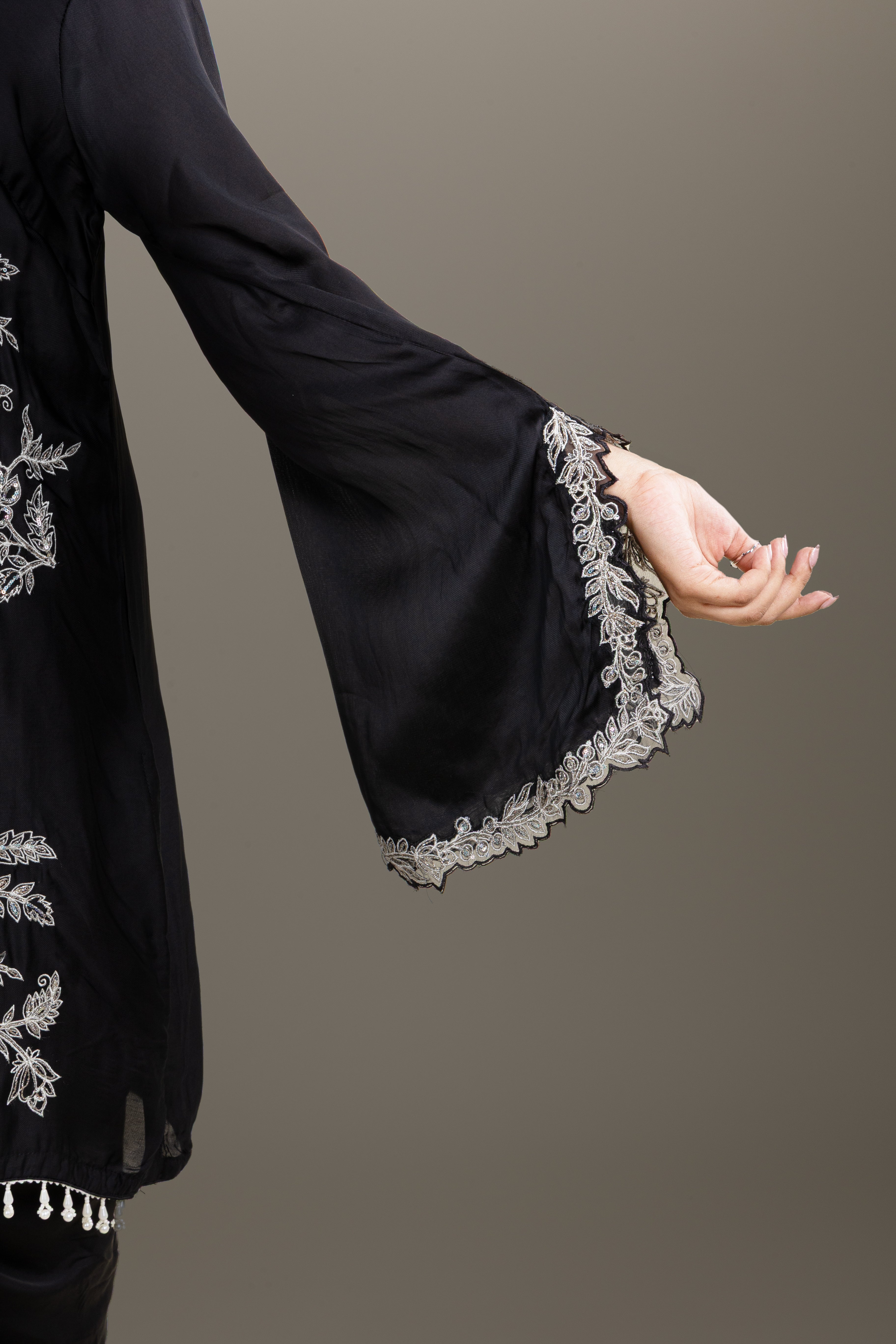 An elegant black dhoti kurta set featuring intricate embroidery, ideal for a chic yet traditional ensemble with a contemporary twist.