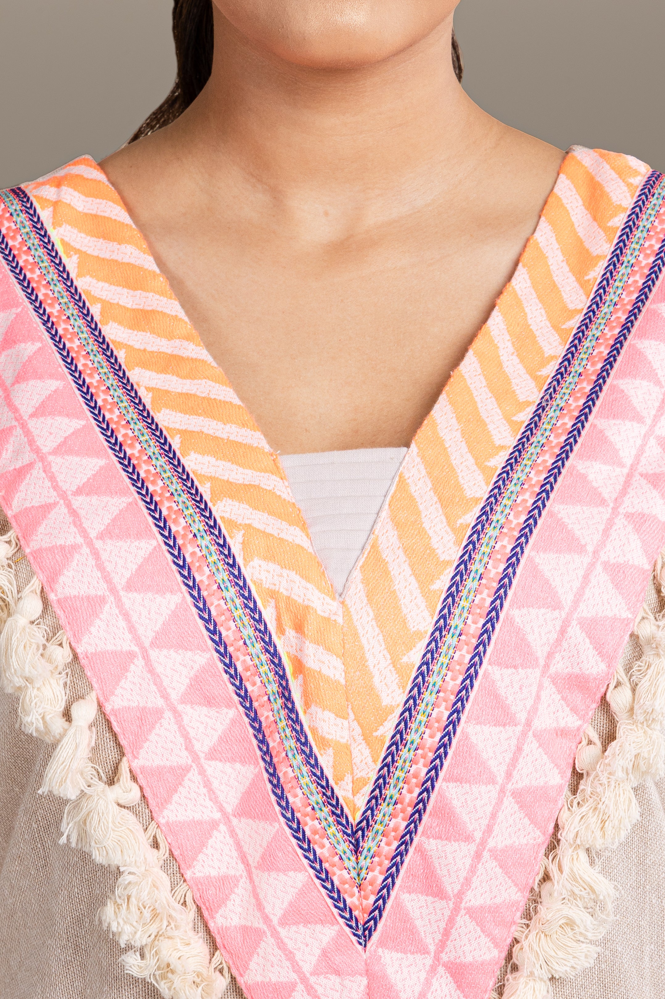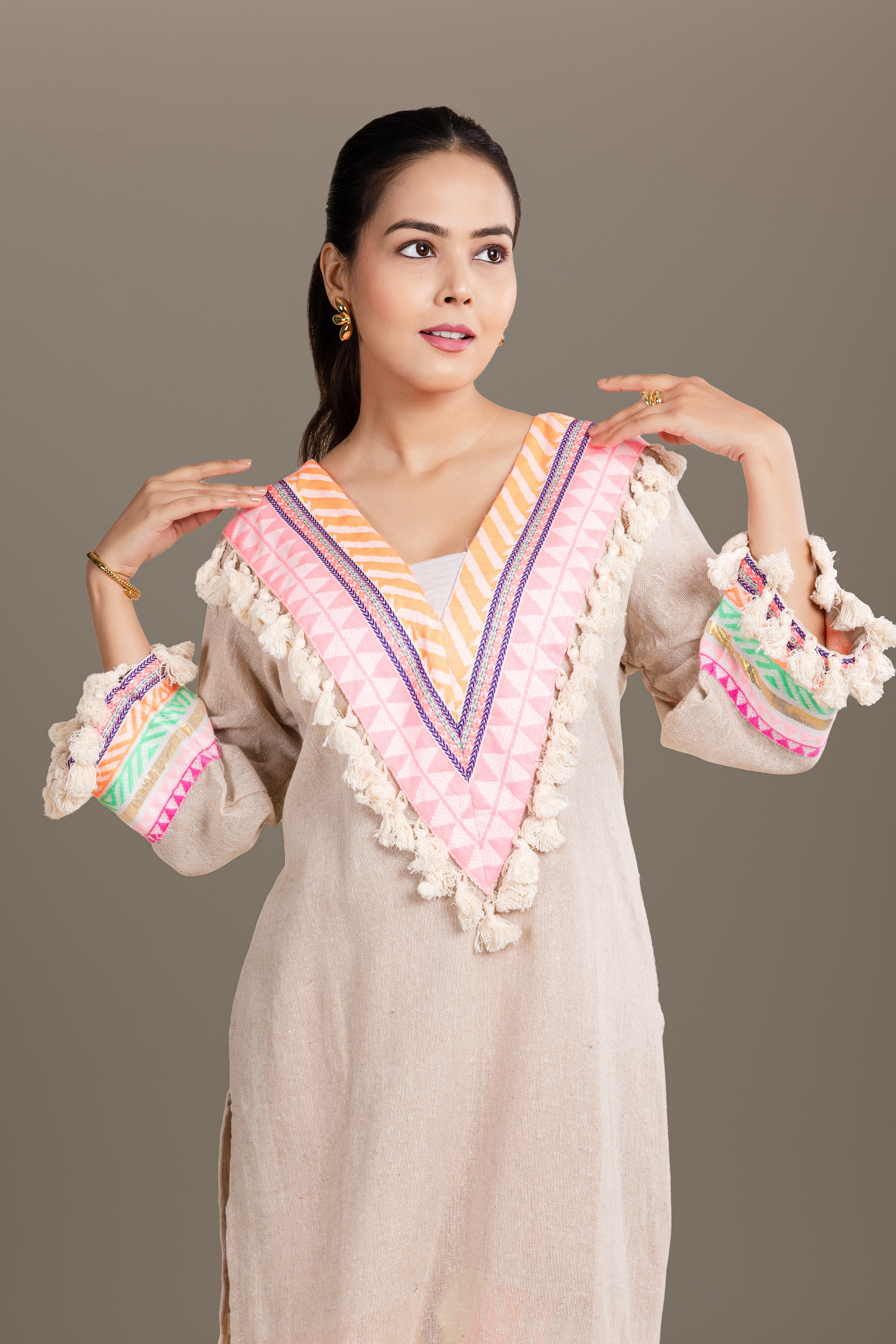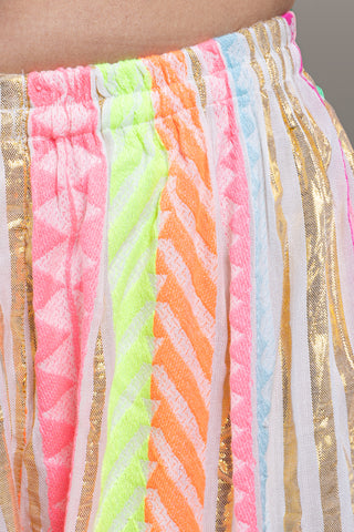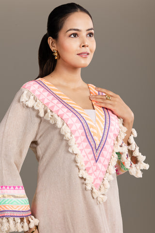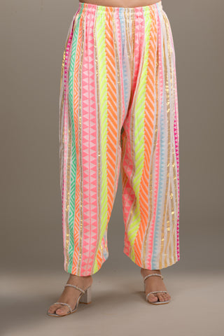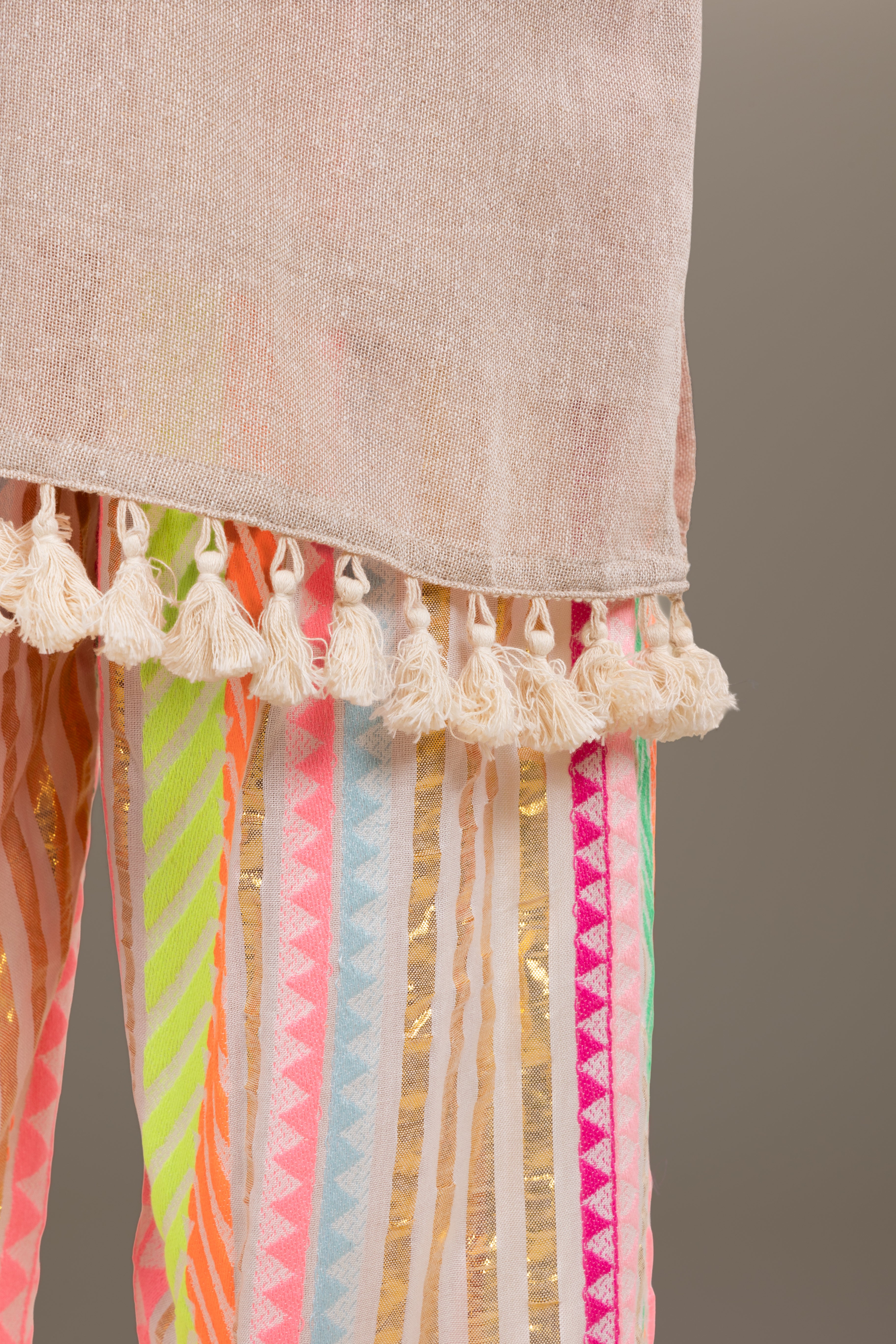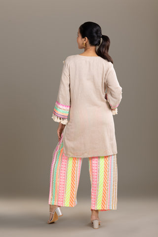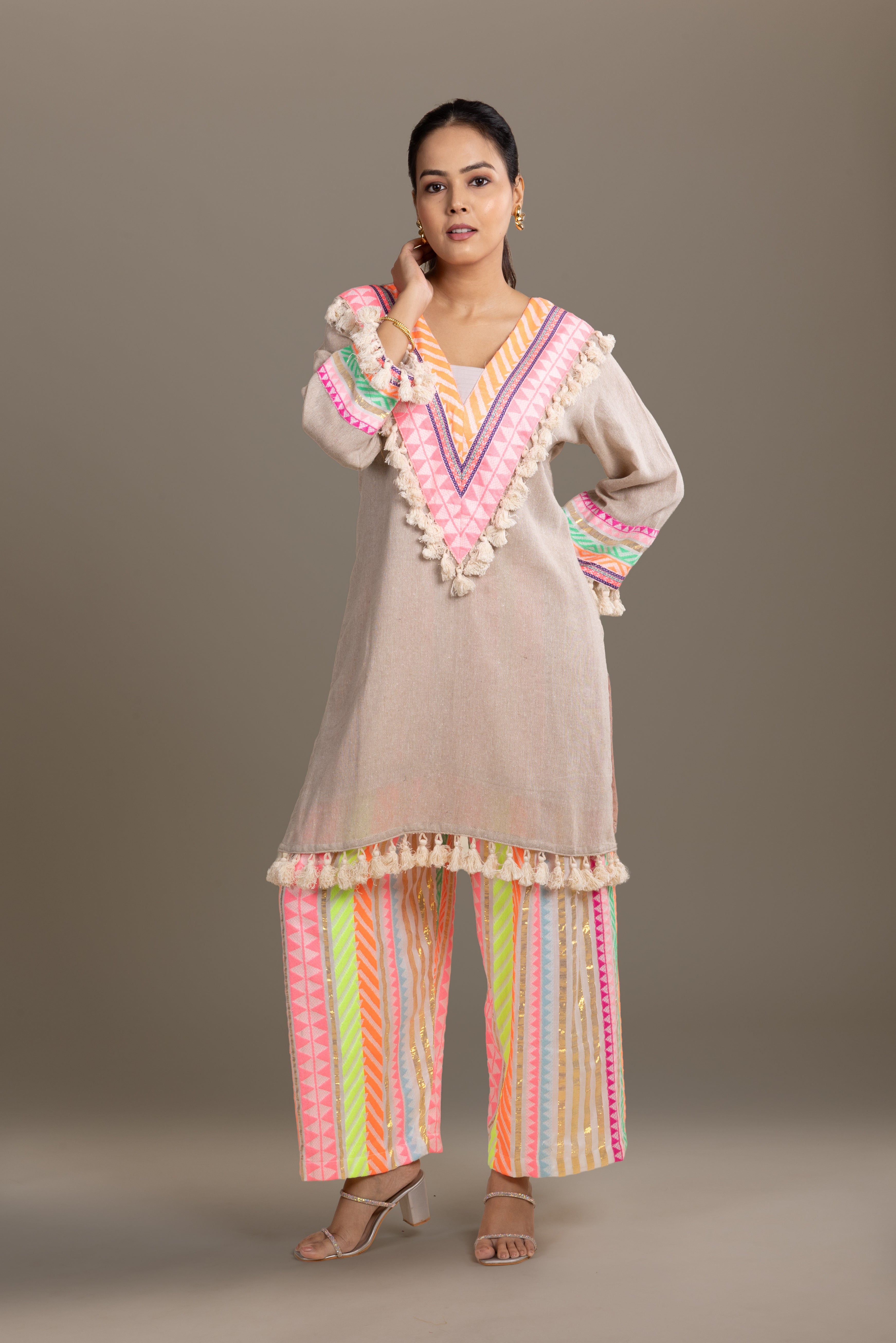Beige tunic with playful neon striped pants, enhanced with mirror work and tassels, perfect for a vibrant fusion look.