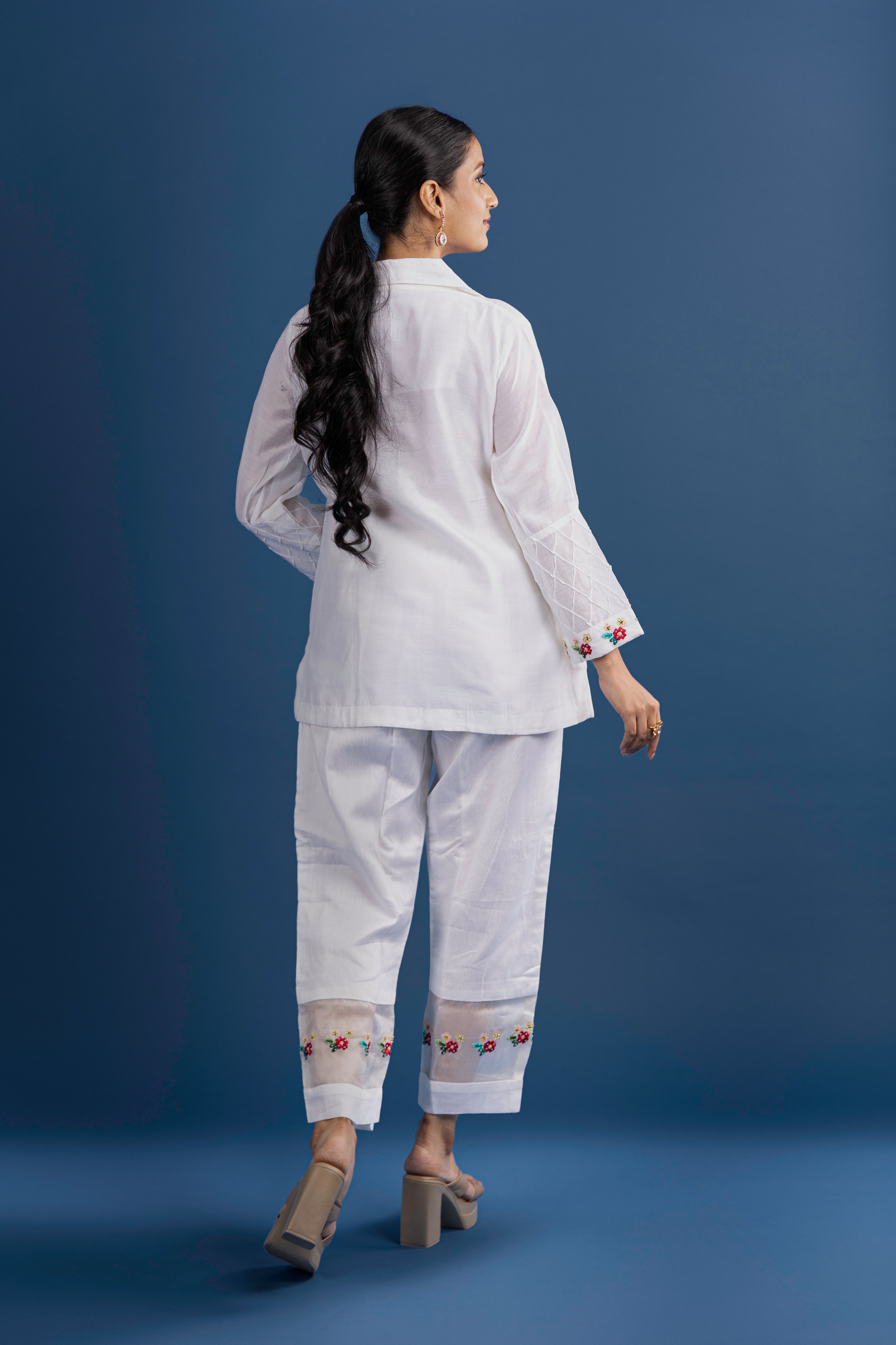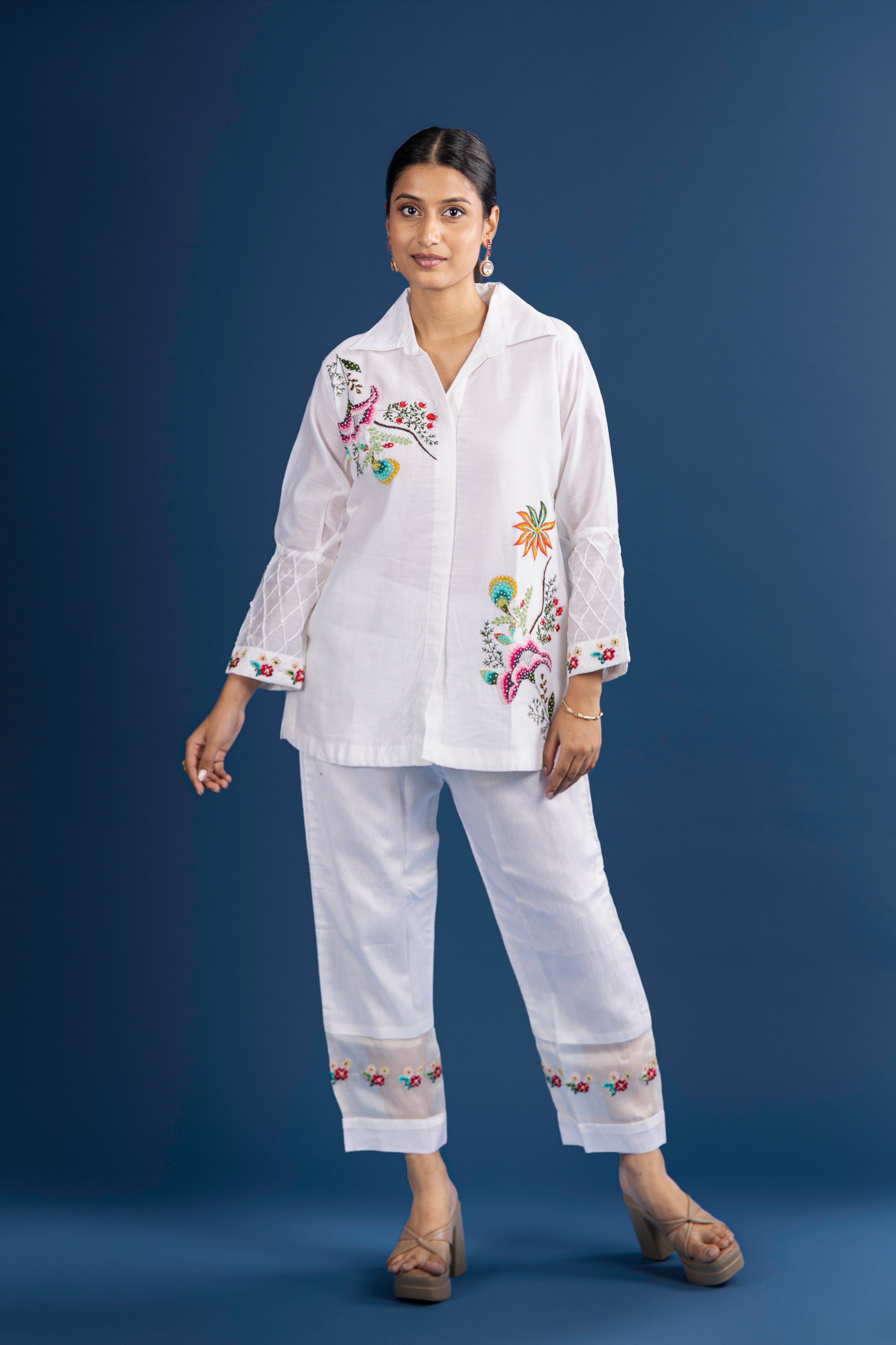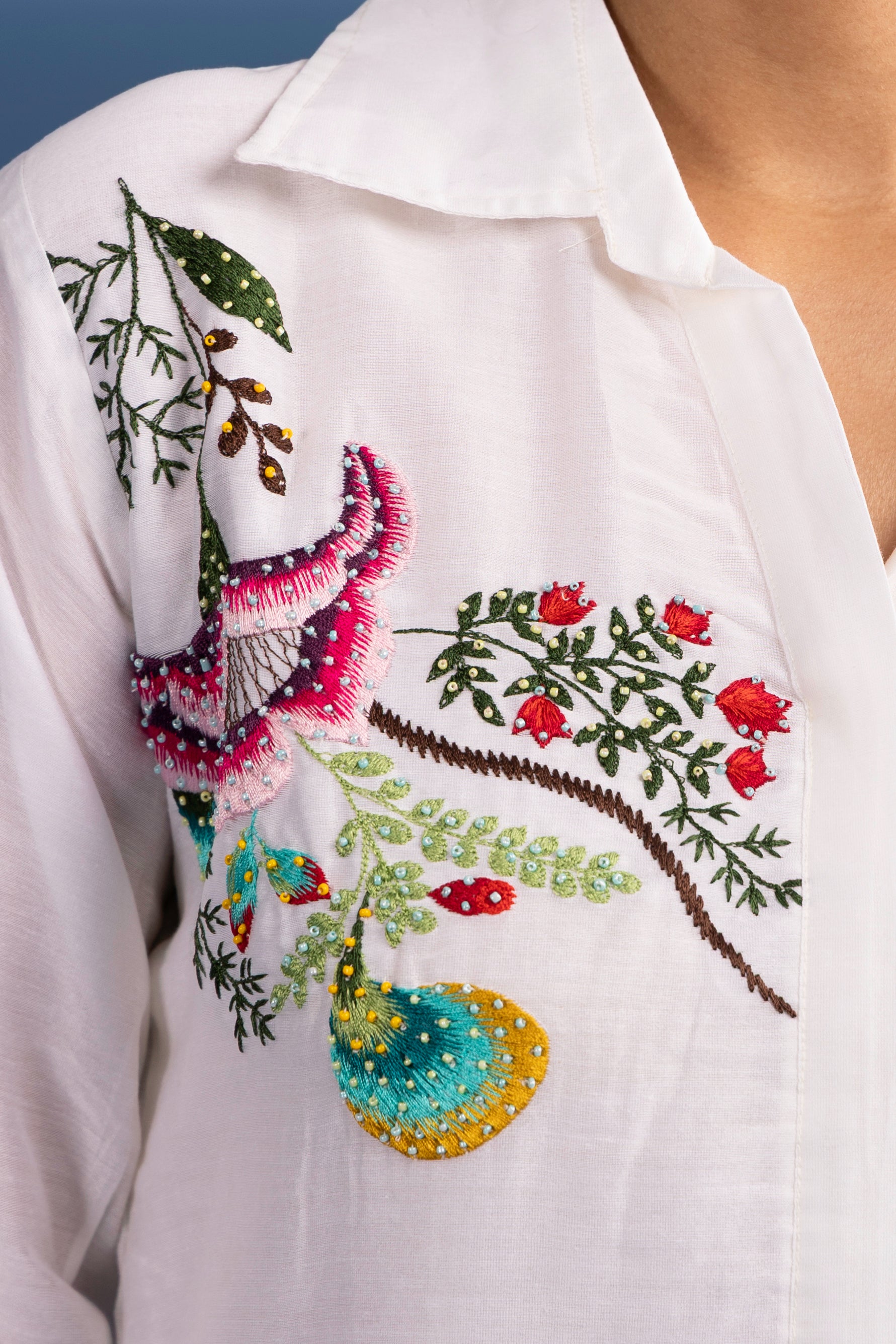 A modern classic, this white shirt kurta features vibrant multi-color floral embroidery with sleek tailoring. It effortlessly blends minimalism with artistic flair for elevated everyday dressing.
