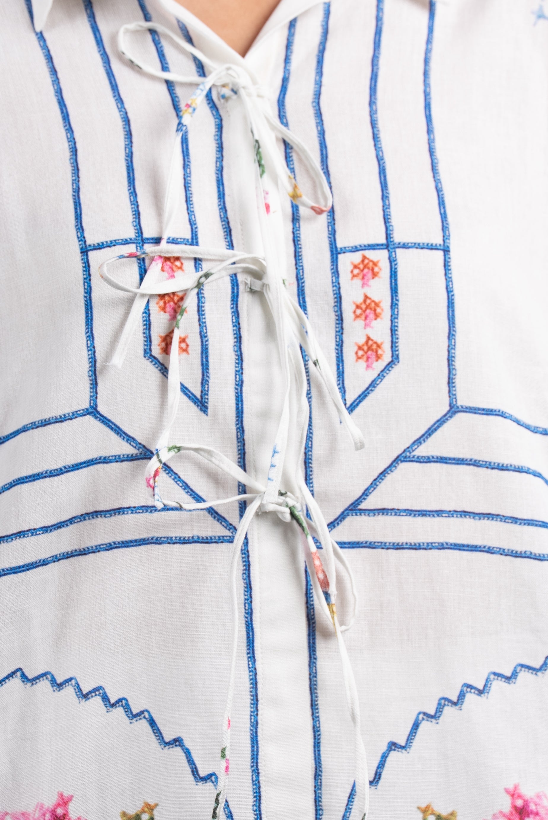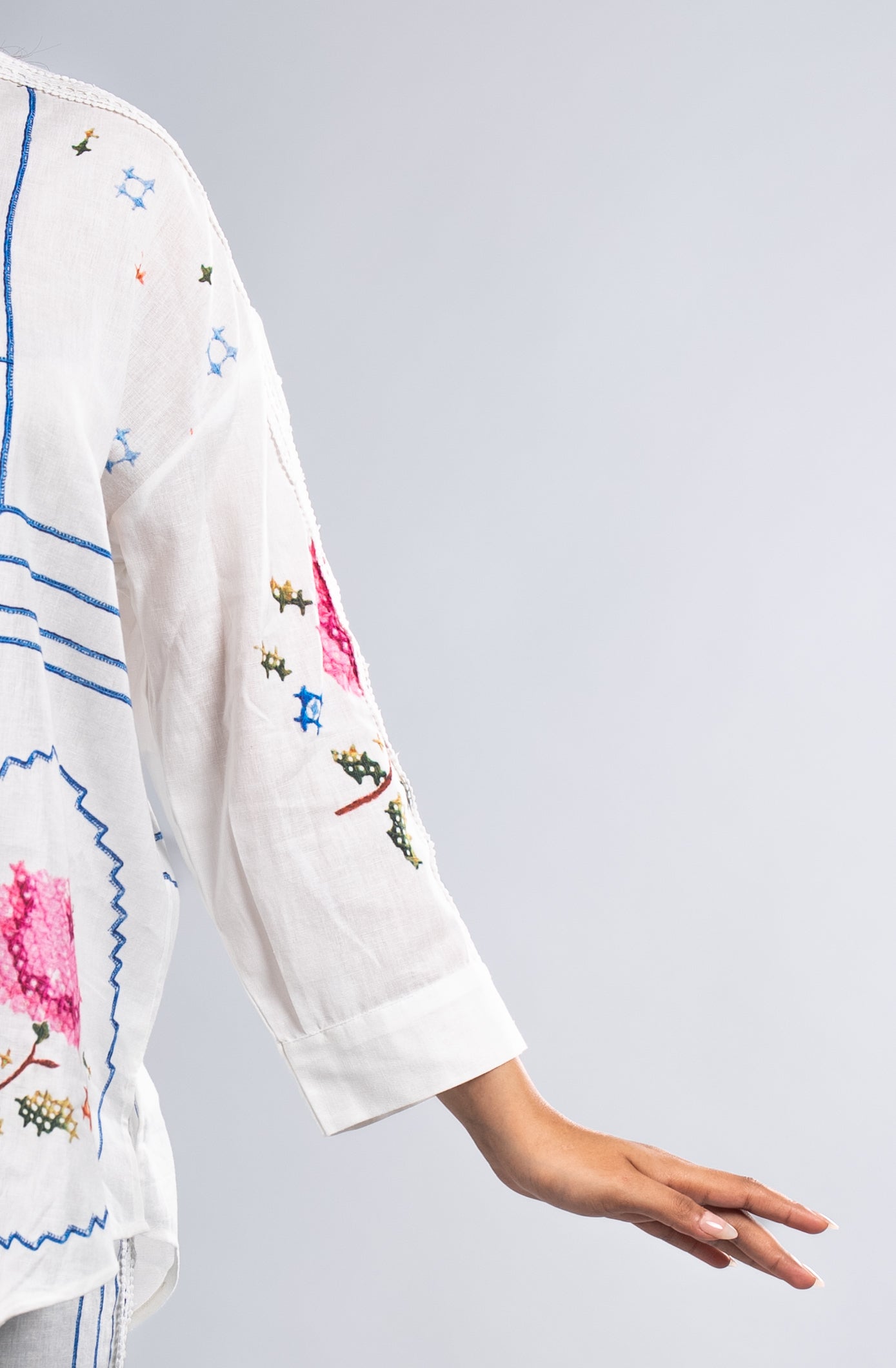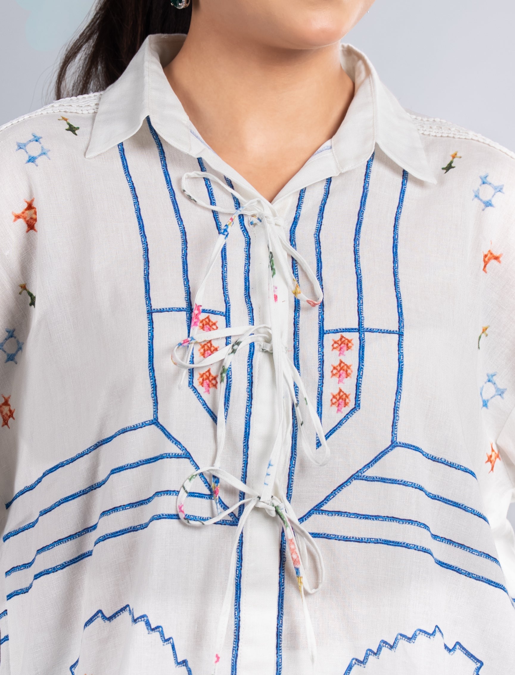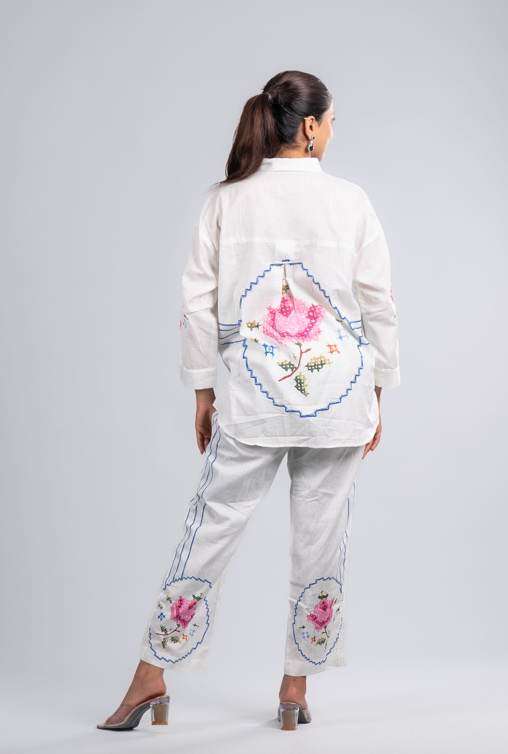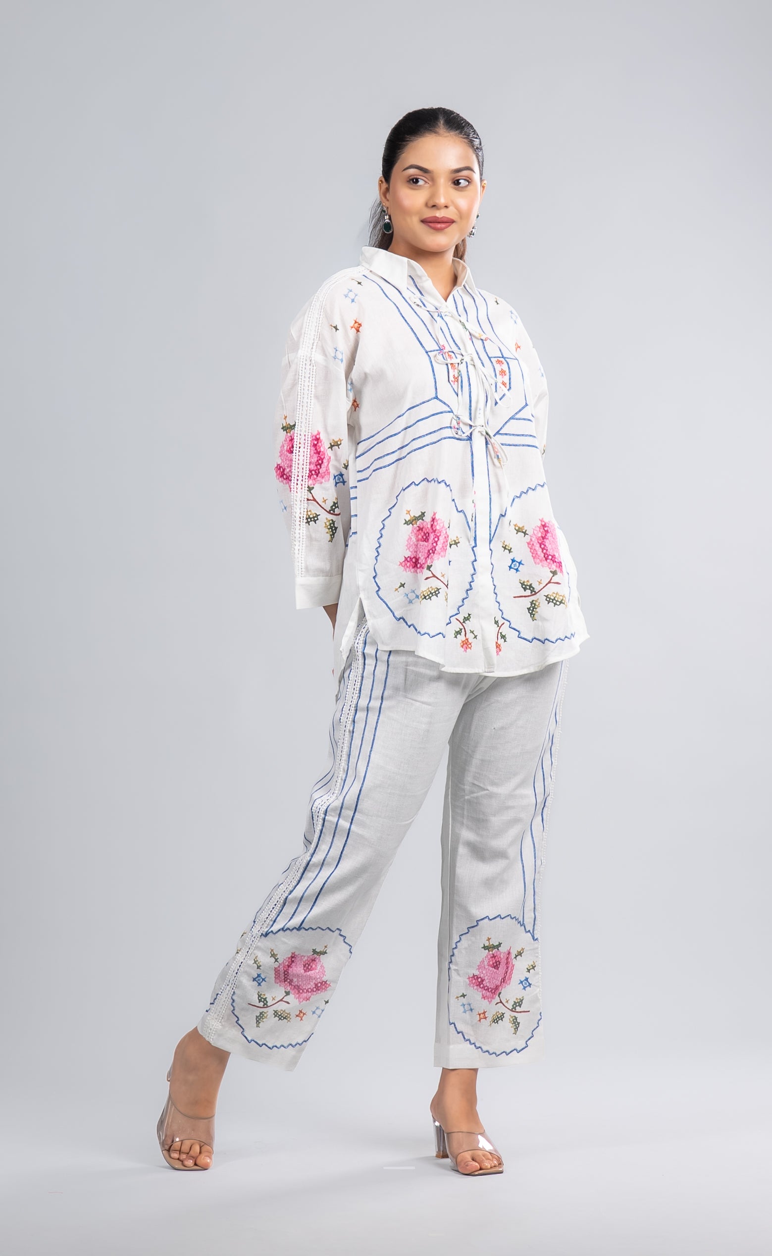 Chic white CO-ORD set highlighted with intricate pink floral embroidery and blue line detailing. A perfect fusion of minimalism and artistry, bringing elegance to casual and festive styling